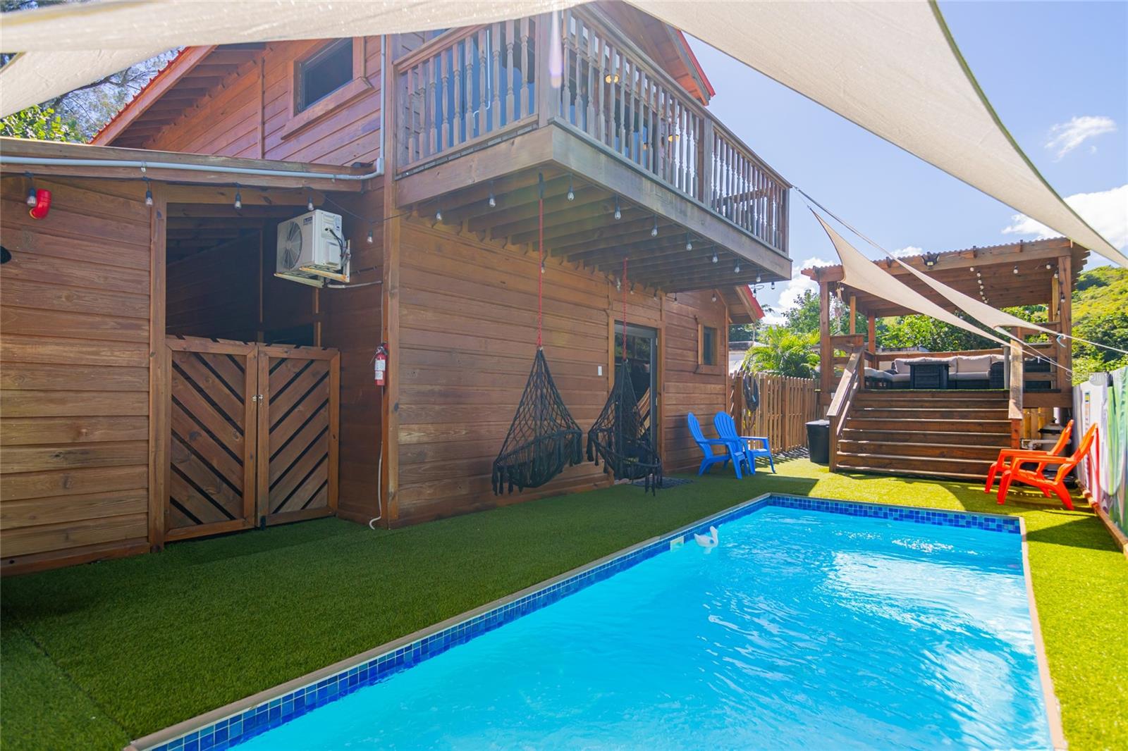 Contemporary cabin built less than 5 years ago with wood construction on a solid concrete base, located in Quebradillas in a high-demand area with quick access to beaches and neighboring Isabela. The property currently operates as a short-term rental (STR) with proven performance and excellent upkeep, yet it is also perfectly suited as a primary residence thanks to its spacious layout and distinctive design. The first level features an open-concept living area and kitchen centered around a large island. One bedroom is located on this floor.