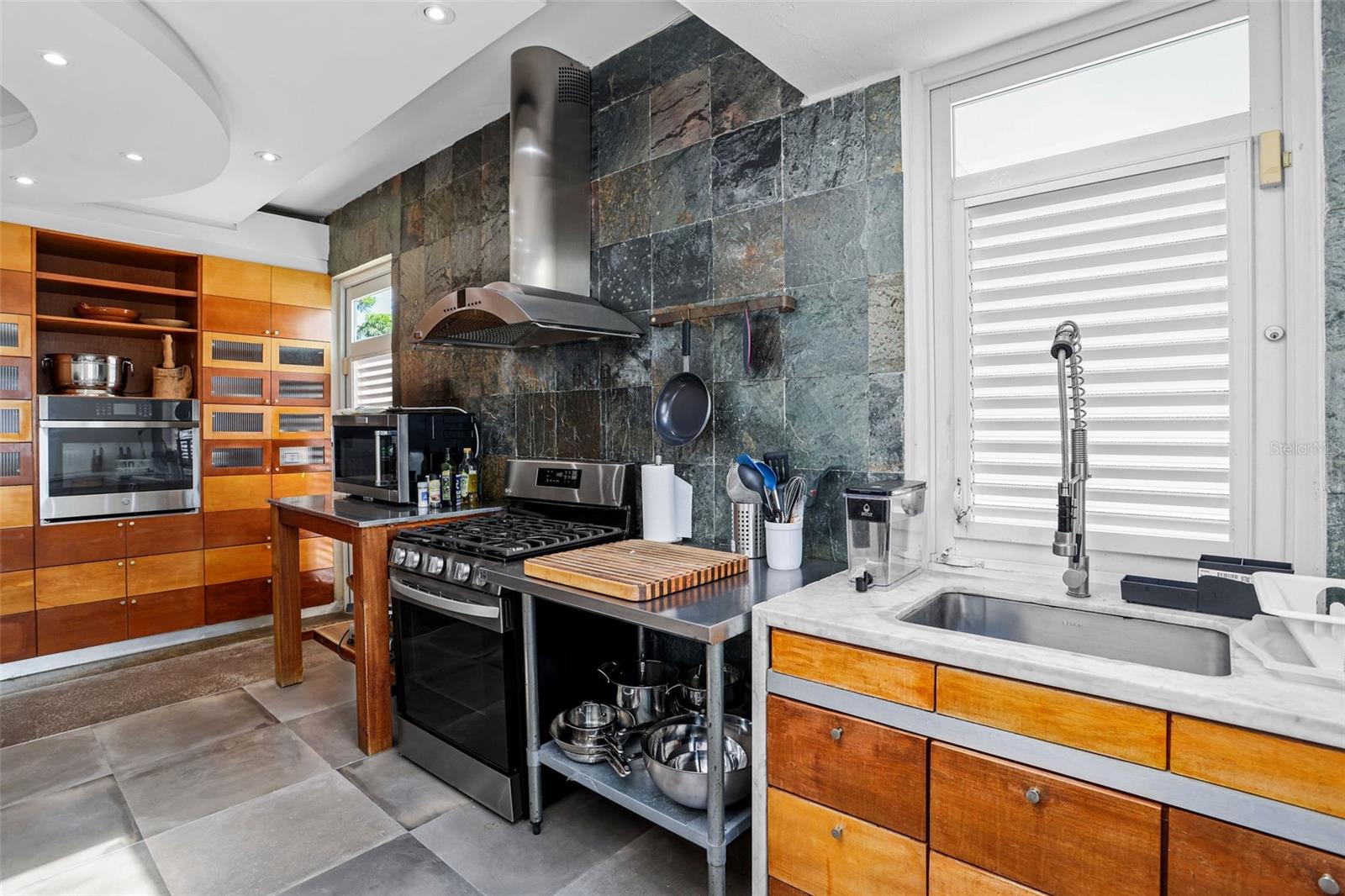 Live steps from the sand in Ocean Park, San Juan—a sun-splashed residence showcasing unique, modern architecture and warm natural finishes. Walls of windows and skylights bathe the open living and dining areas in abundant light, while custom millwork and a sculptural façade create a one-of-a-kind presence. The kitchen pairs stone accents with stainless appliances and an eat-in layout—perfect for easy gatherings before a beach day.
