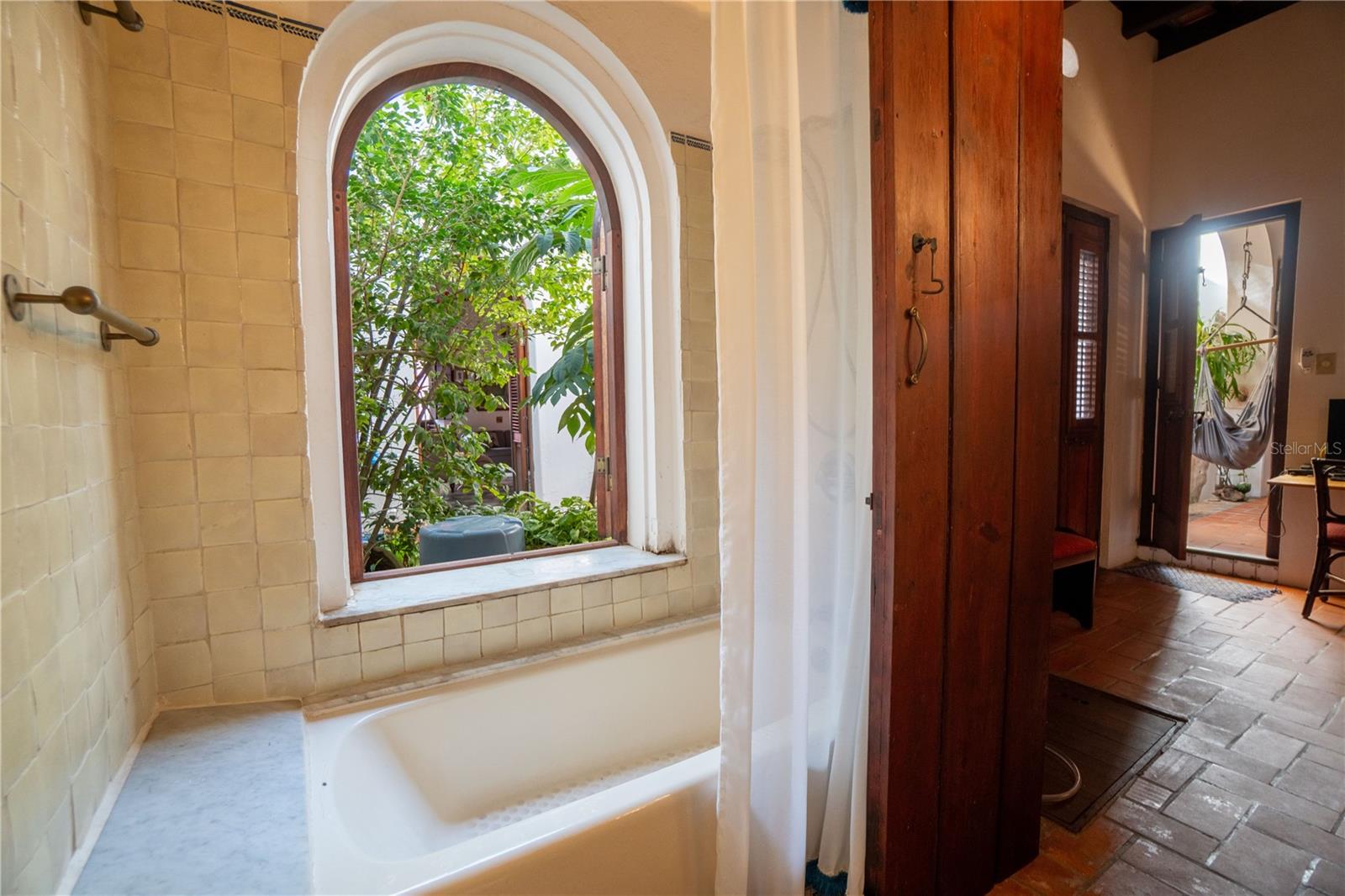 From the moment you step inside, you’re met with soaring ceilings, curated art, original architectural details, and the warm glow of natural light flooding through the interior courtyard. The main living room opens through traditional wooden doors directly onto the cobblestone street, revealing views of historic architecture, color-drenched façades, and the unmistakable essence of Old San Juan.