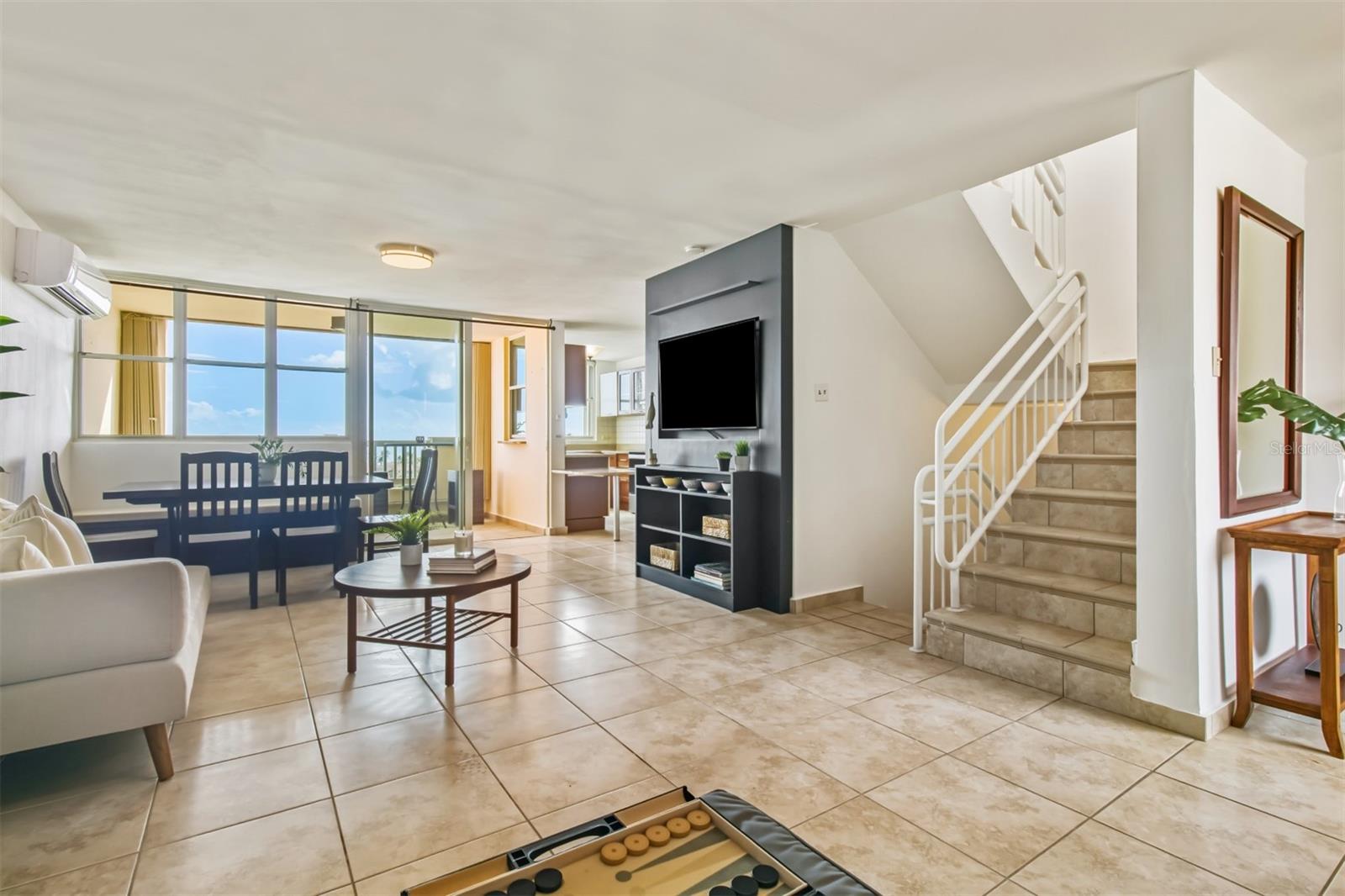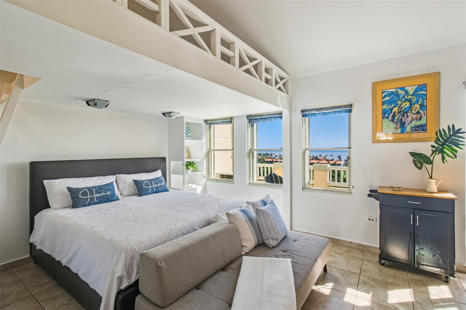 The upper level is a true retreat, featuring a studio-style grand room currently configured with a bedroom area, sitting area, loft/bonus space, and kitchenette. It also offers two terraces, one covered and one open, each framing stunning ocean and mountain views. This floor includes a second laundry area and a spacious bathroom with double sinks.