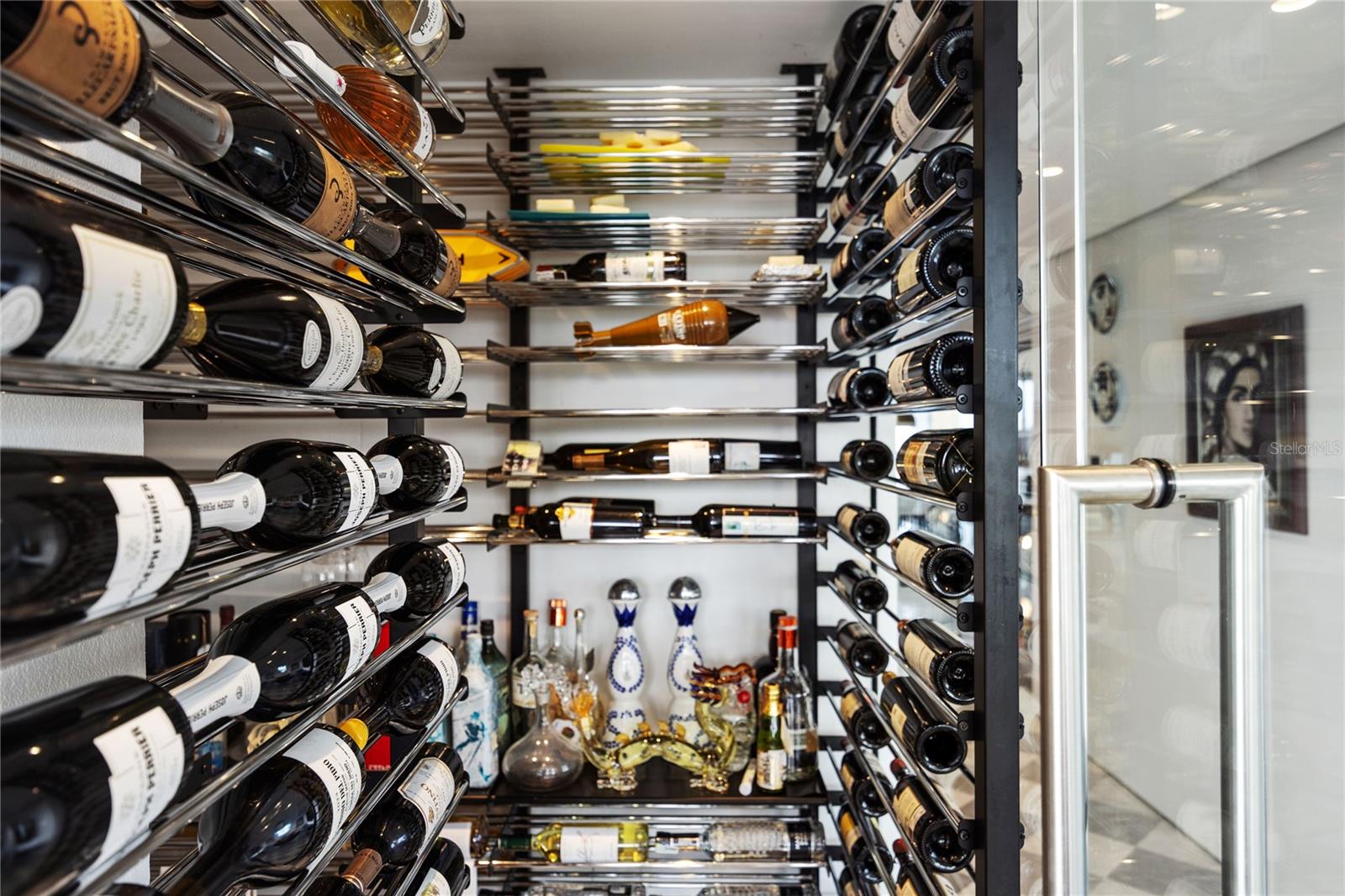 The kitchen is open and bright. It features Italian CopatLife cabinets, a center-piece island with impressive Avalon marble countertops, and top of the line appliances: Miele induction stove – with a real vented range hood –, built-in Miele coffee system, Frigidaire Professional microwave/oven combo and an additional convection oven, dishwasher, and side-by-side refrigerator and freezer. The Bar also has Avalon marble countertops and is equipped with a True refrigerator, an ice maker, and a temperature-controlled 378-bottle wine cellar.