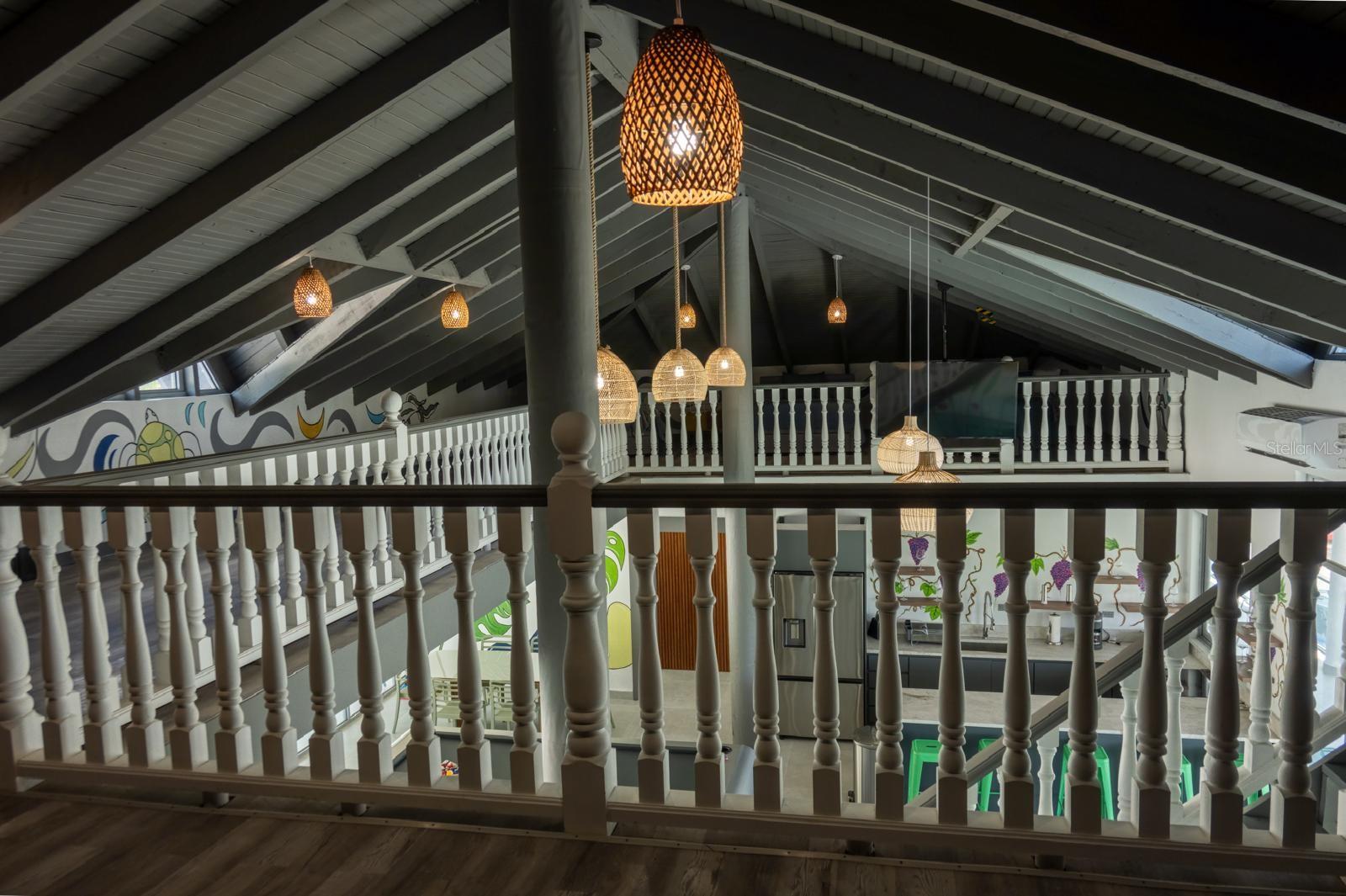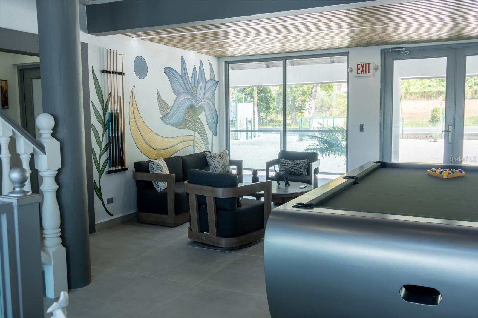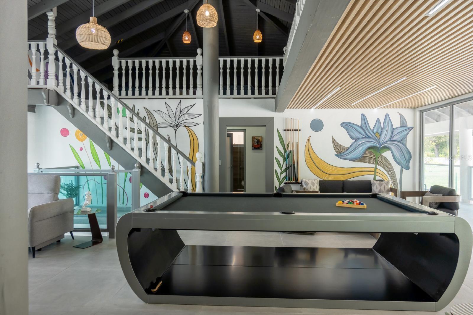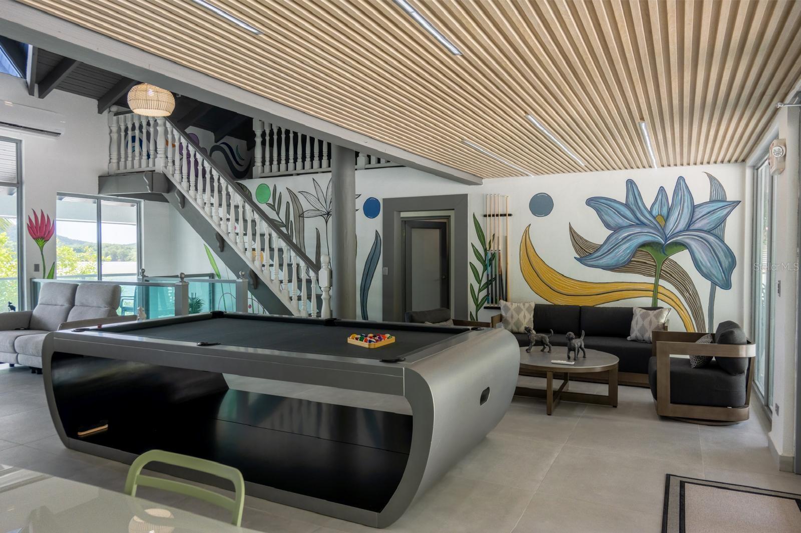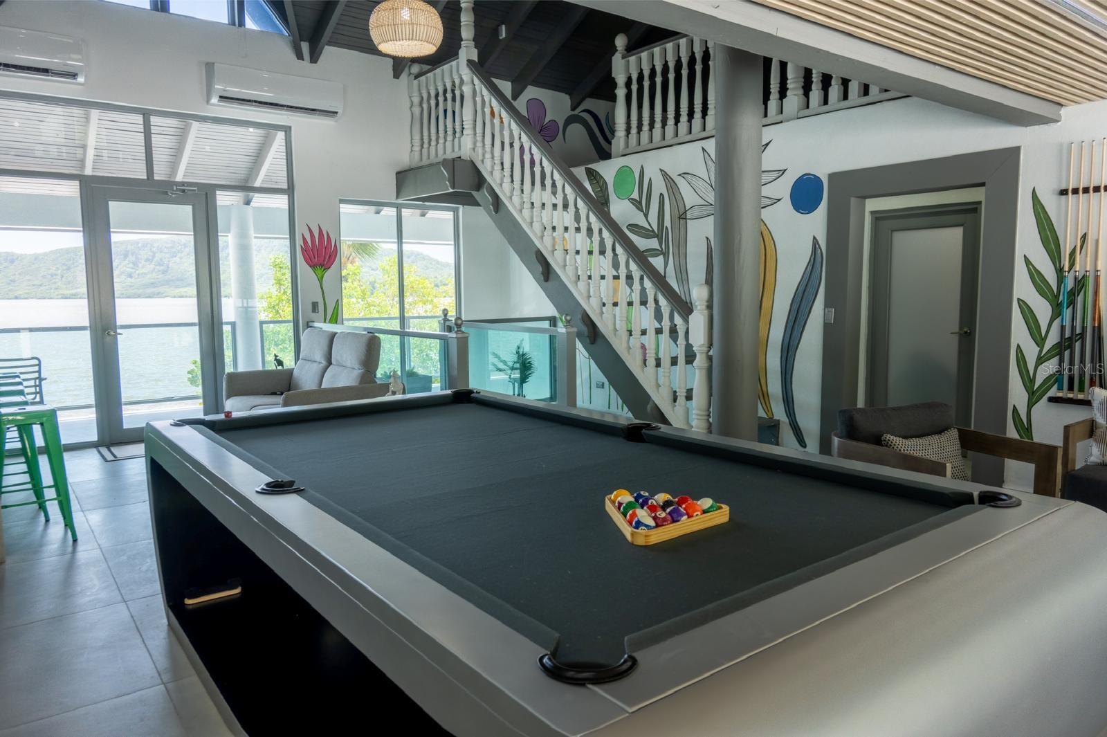 area, family room, open mezzanine with 10 beds, and modern billiard table (approx. 20-