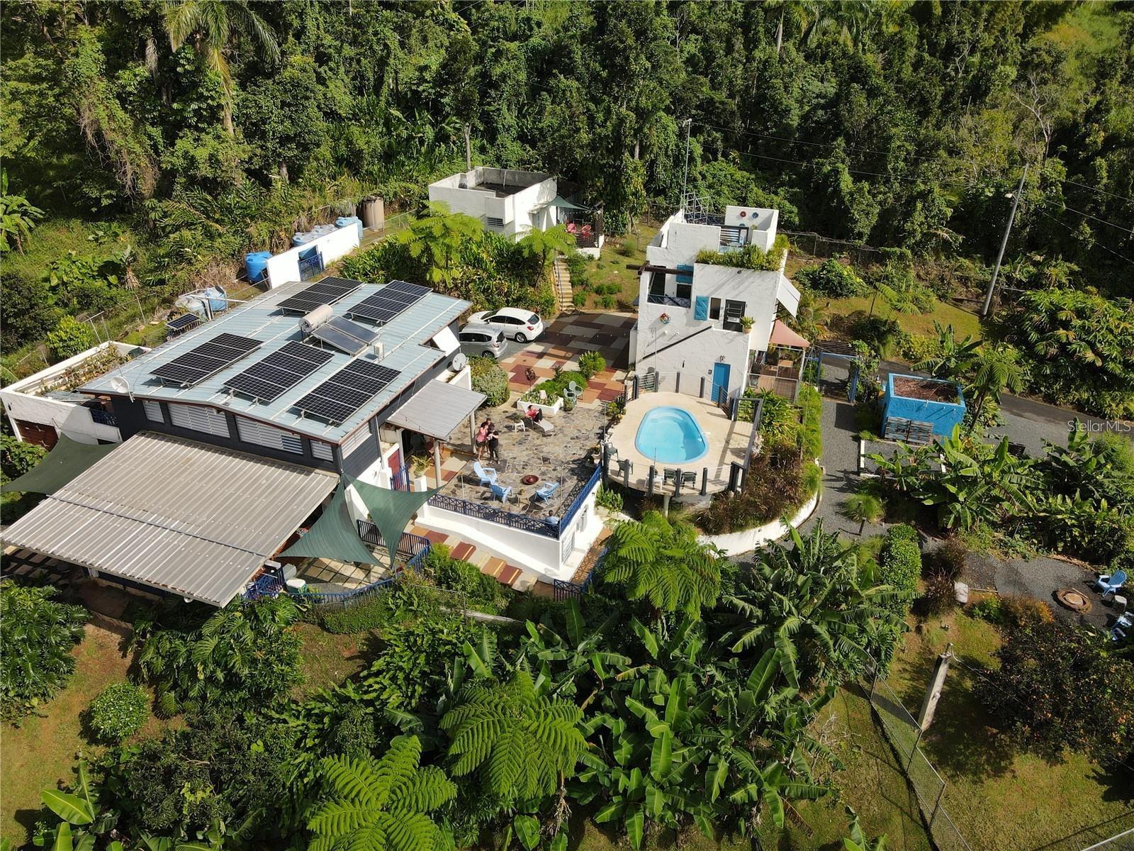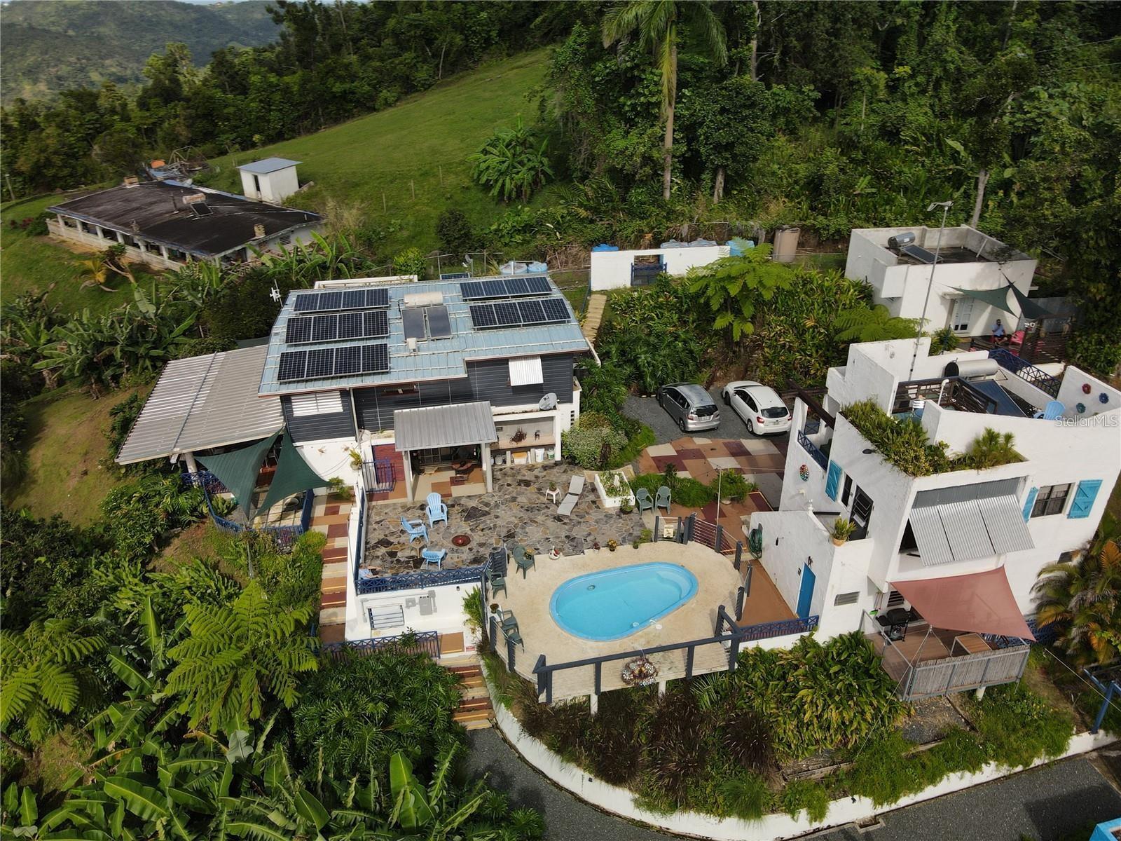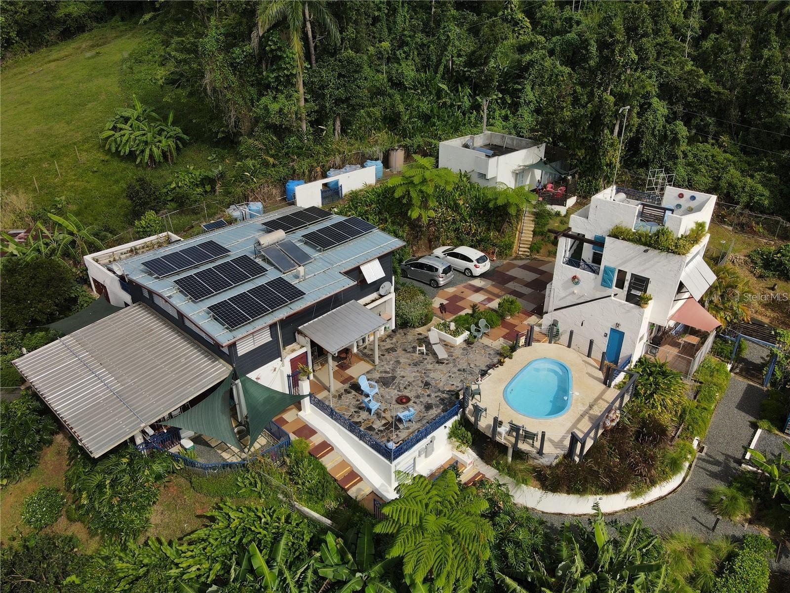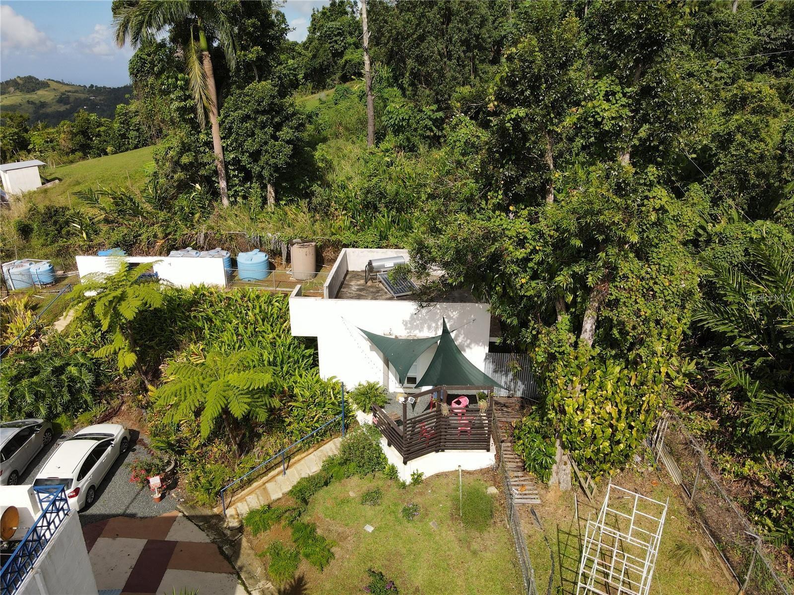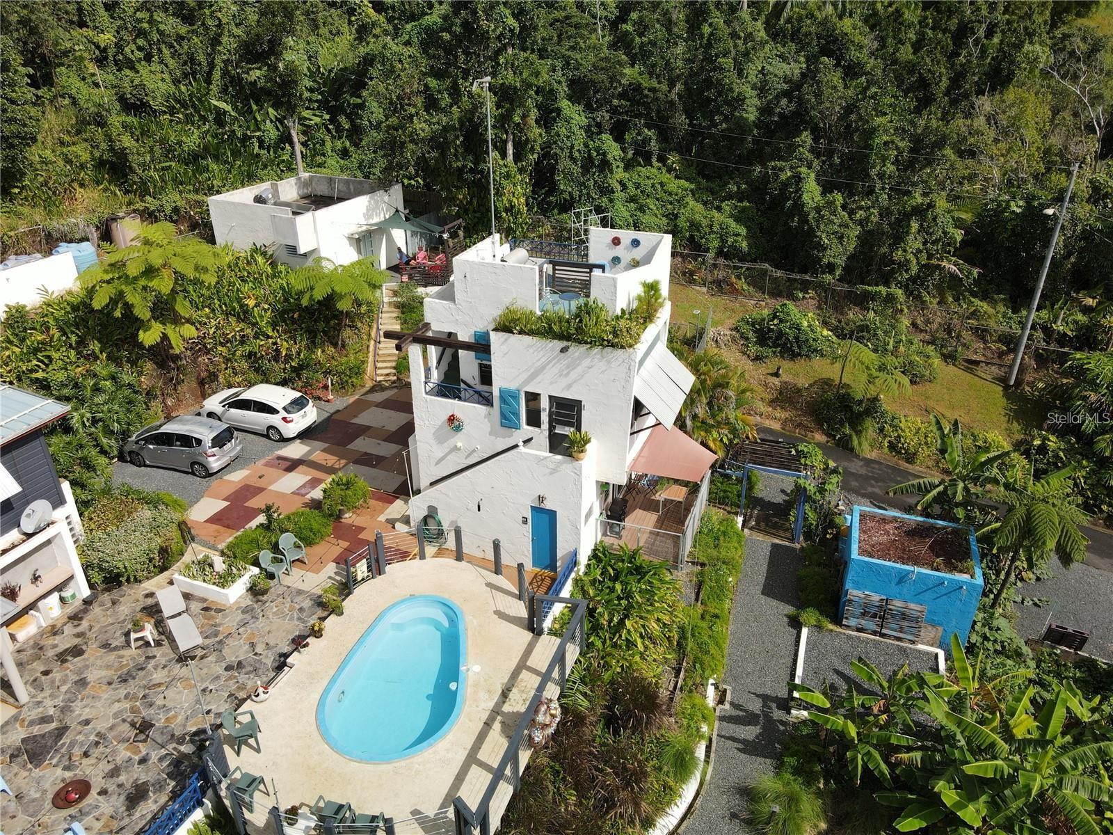 This property features a main residence built of wood and two additional concrete structures, each strategically located on the grounds. Together, these structures contain three two-level studio units, ideal for short-term rentals.