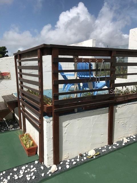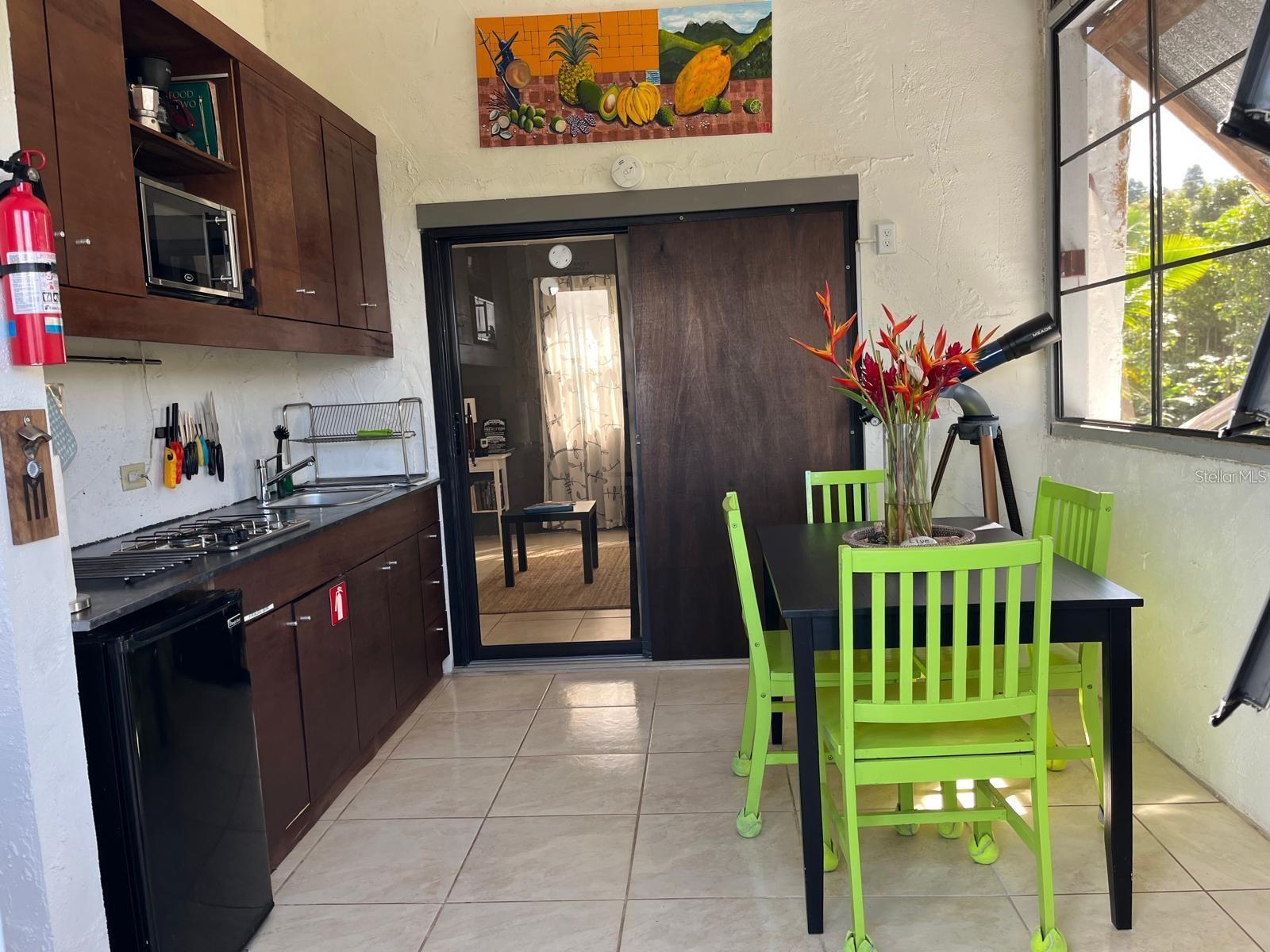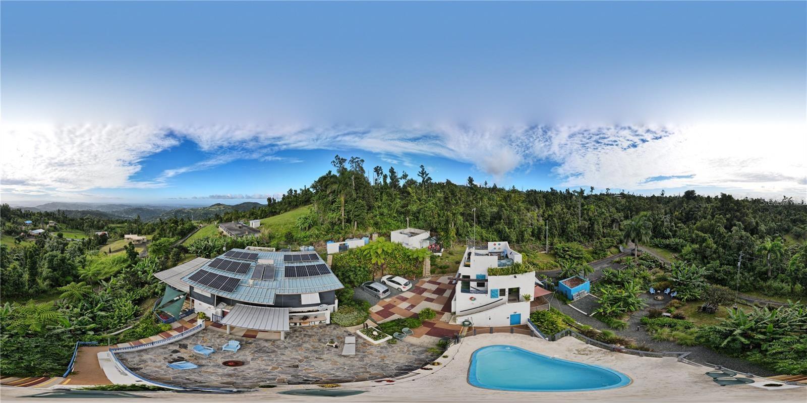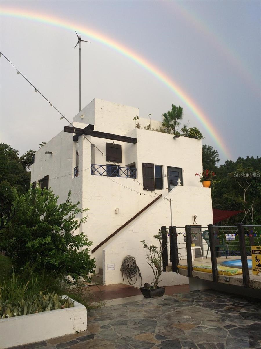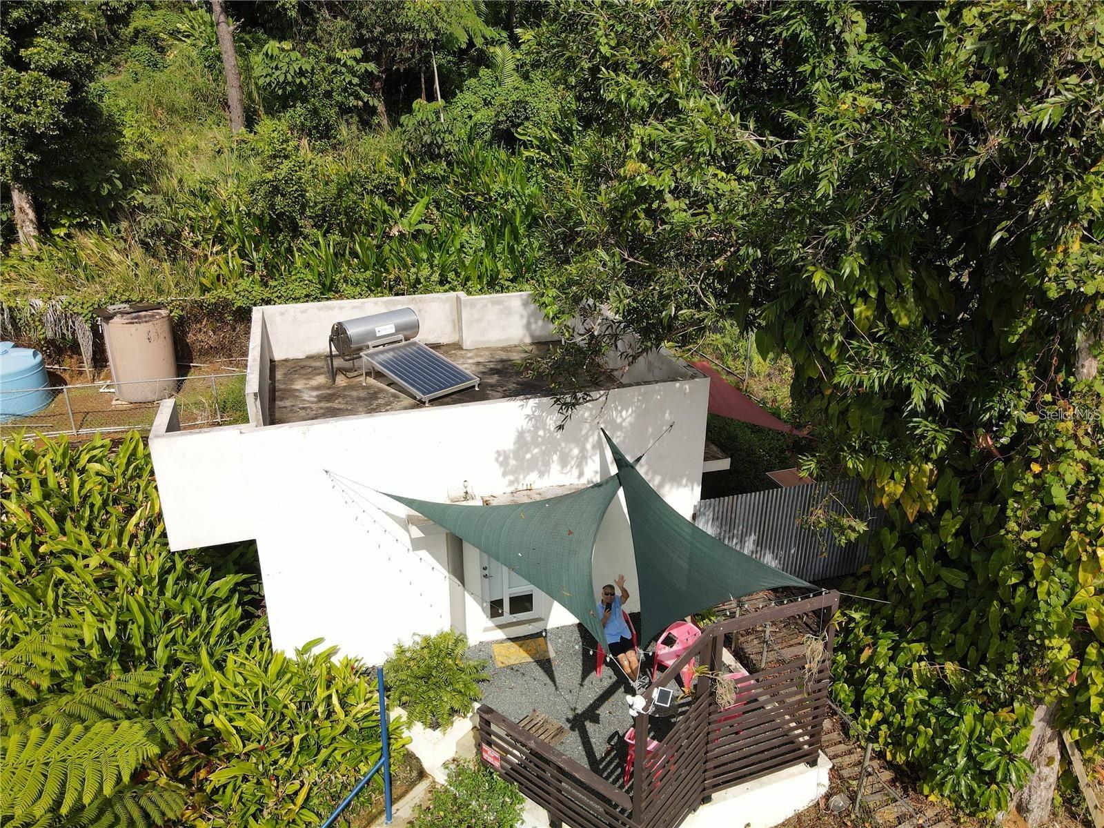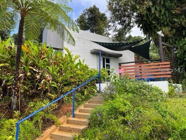 This property features a main residence built of wood and two additional concrete structures, each strategically located on the grounds. Together, these structures contain three two-level studio units, ideal for short-term rentals.