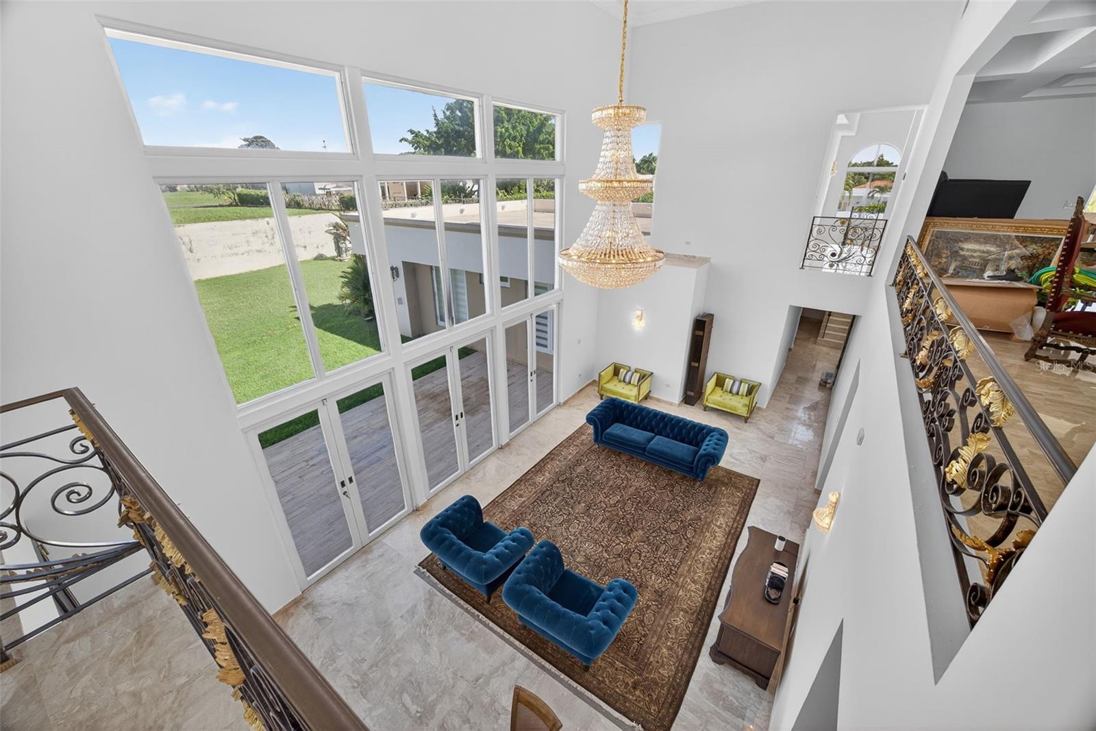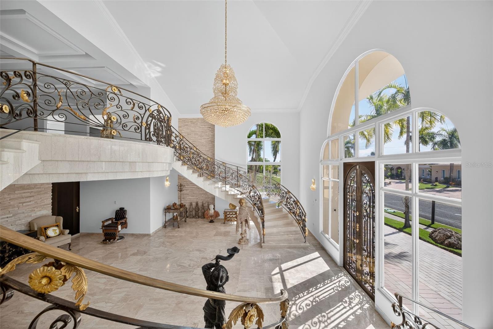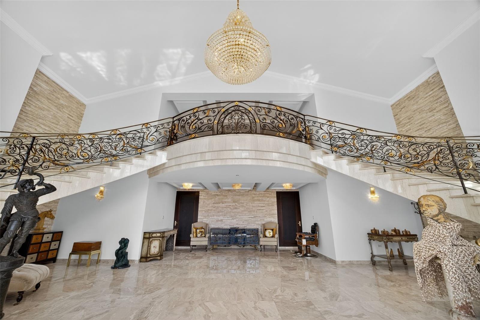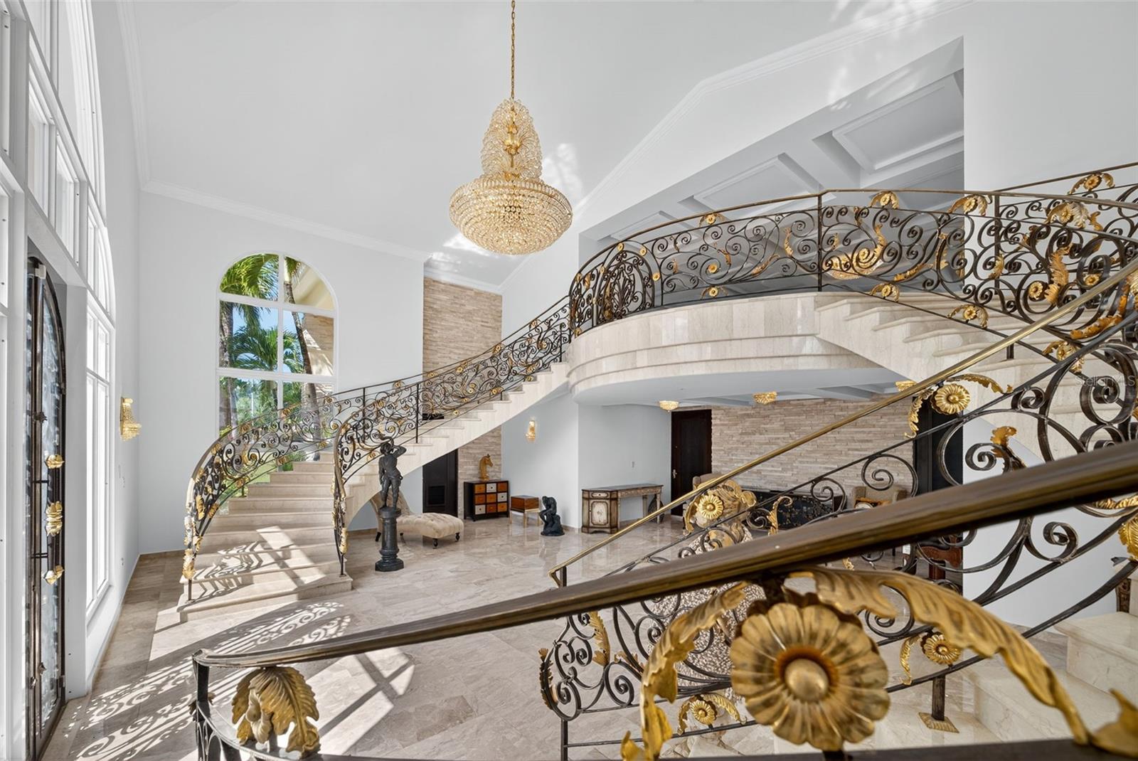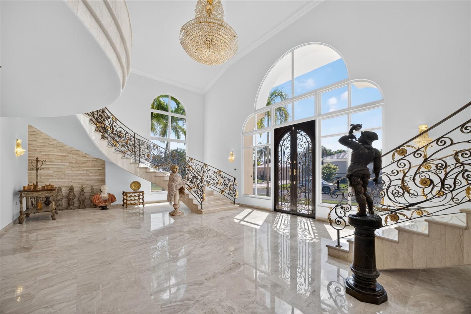 A double-height foyer, dual circular staircases, and stunning crystal chandeliers set the tone for elegance. Spacious living and dining areas connect seamlessly with a chef’s kitchen—perfect for both family living and grand entertaining.