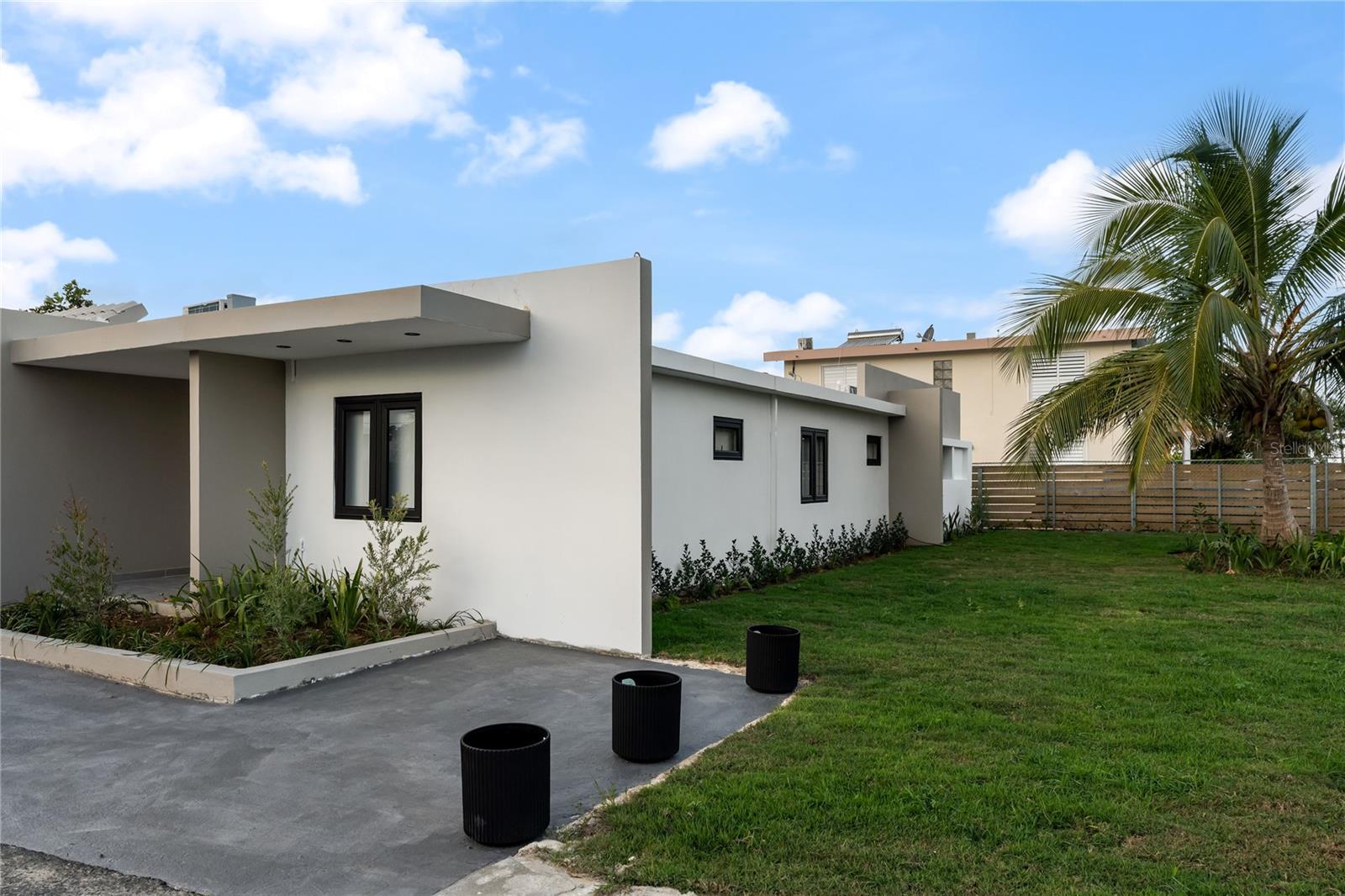 The home offers a backyard area with a carport that can function as storage, garage, or outdoor family space, plus a larger front lawn with landscaping and fencing around the perimeter. All doors are aluminum, and the main entrance door is a wide statement piece.