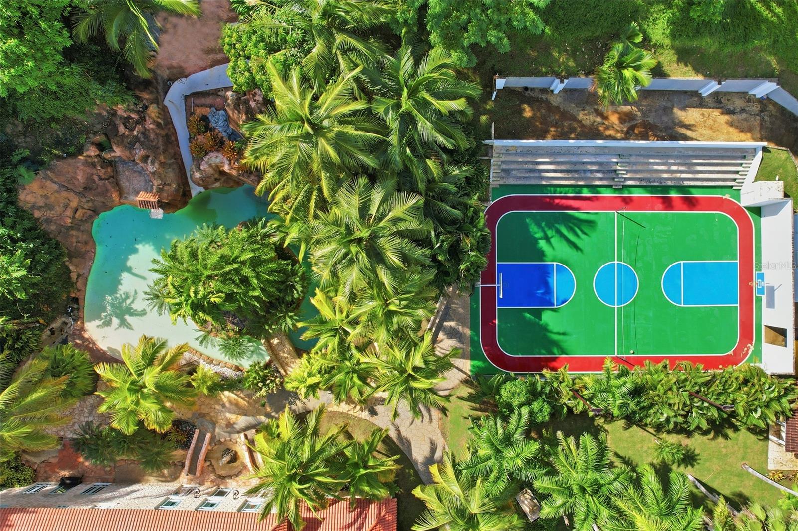 The exterior constitutes a true recreational complex. Two heated saltwater pools—one of 30,000 gallons and another of 20,000—are complemented by jacuzzis, heaters, waterfalls, and slides reminiscent of an aquatic park. Pergolas, terraces, and landscaped areas with farm-style planting zones and fruit trees integrate leisure with domestic production. For wellness and activity, the property offers a 15 x 30 ft gym, dry and steam saunas, basketball and volleyball courts with bleachers for 100 spectators, plus playful features such as an equipped treehouse and dollhouse.