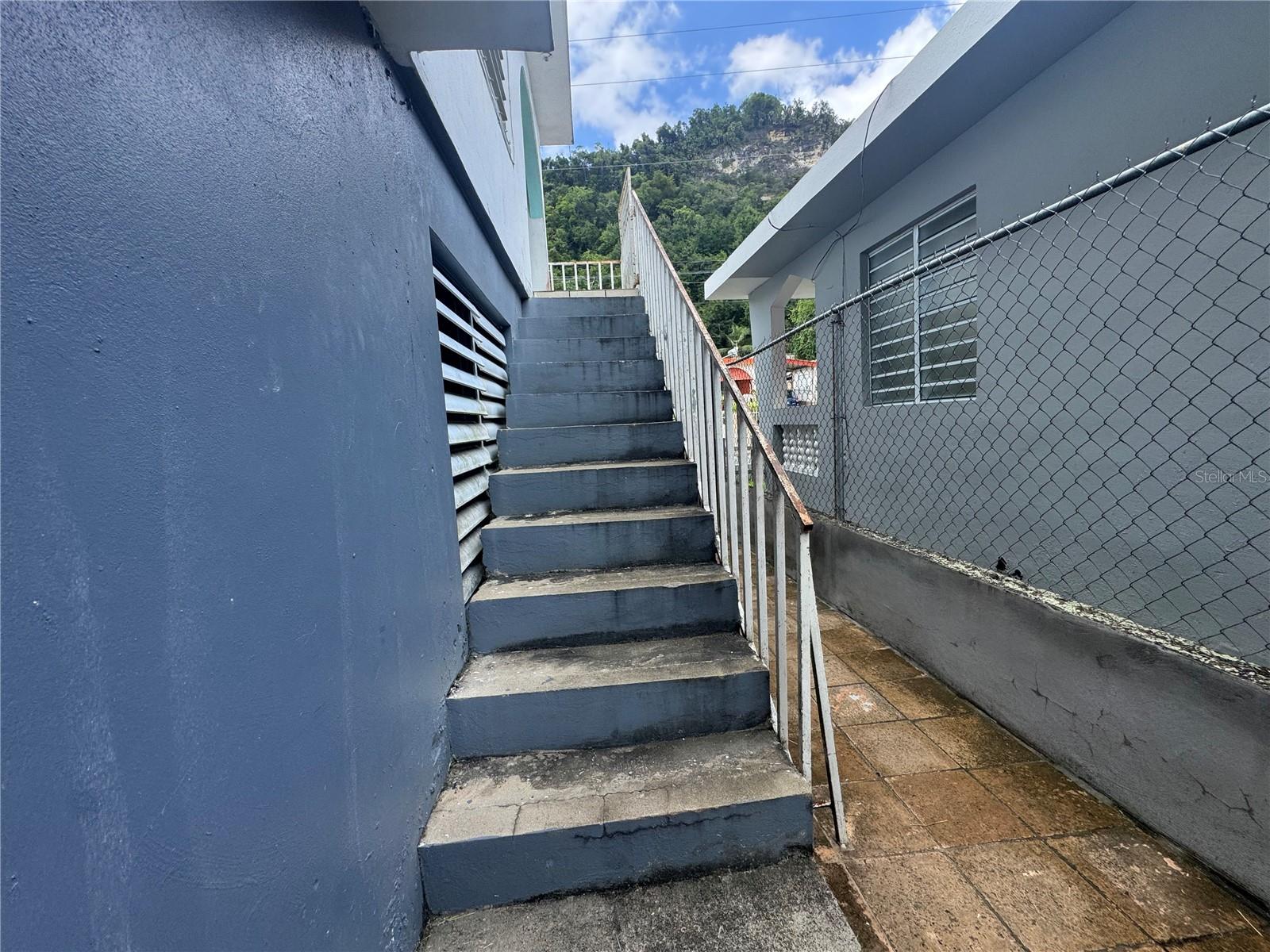 3 bedrooms, 1 bathroom, living room, dining room and kitchen, balcony, side and rear terrace, and exterior stairs leading to the patio.