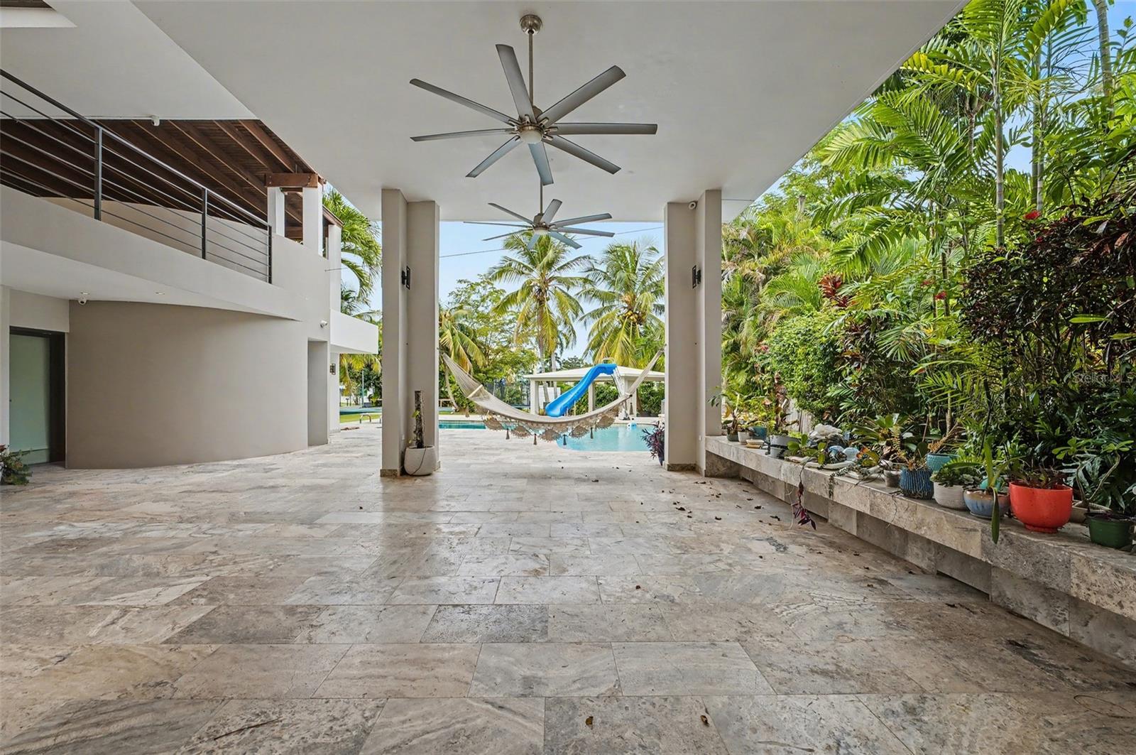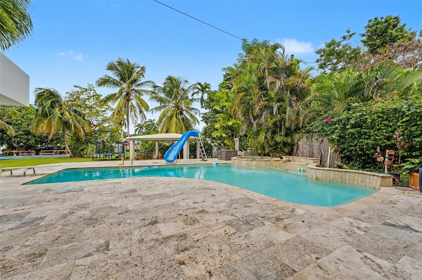Rarely does a property of this caliber and versatility become available in the heart of San Juan. This unique offering consists of two separate, adjacent lots being sold together as one expansive estate, providing a level of privacy and recreational space that is virtually unmatched in the area. The primary residence, located at B1 Calle Santa Isabel, is a one-story tropical-style home encompassing approximately 2,845 square feet of gross living area. Designed for both elegance and durability, the residence features high-quality reinforced concrete construction and stunning marble flooring throughout its 12 total rooms. The floor plan is thoughtfully laid out with 3 spacious bedrooms and 3 full bathrooms. For year-round comfort, the home is equipped with a split-unit air conditioning system. The outdoor living space of the main house is a true sanctuary, featuring an extensive terrace area with both concrete and wood decking, a swimming pool complete with a slide, and a convenient two-car carport.