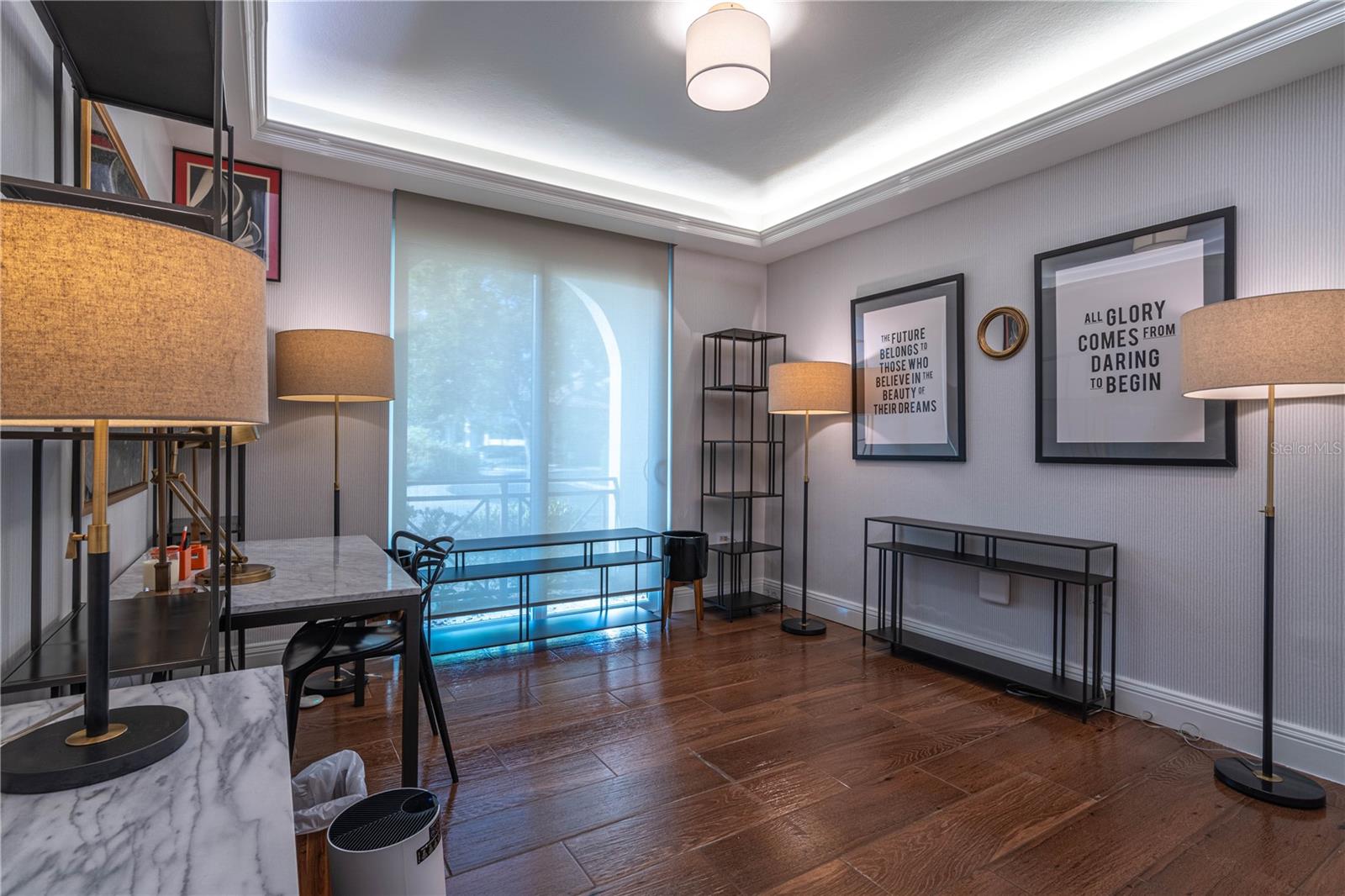 Living spaces flow seamlessly to a covered patio with cedar-planked ceiling, electric sunscreens, ceiling fans, and a private landscaped garden with advanced drainage, irrigation, and lighting. A Dimplex Optimist fireplace—the only one of its kind in the Caribbean—features a hidden television behind a one-way mirror.