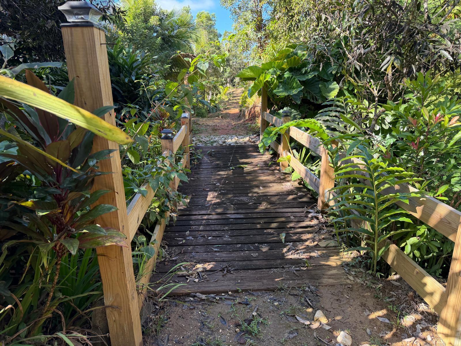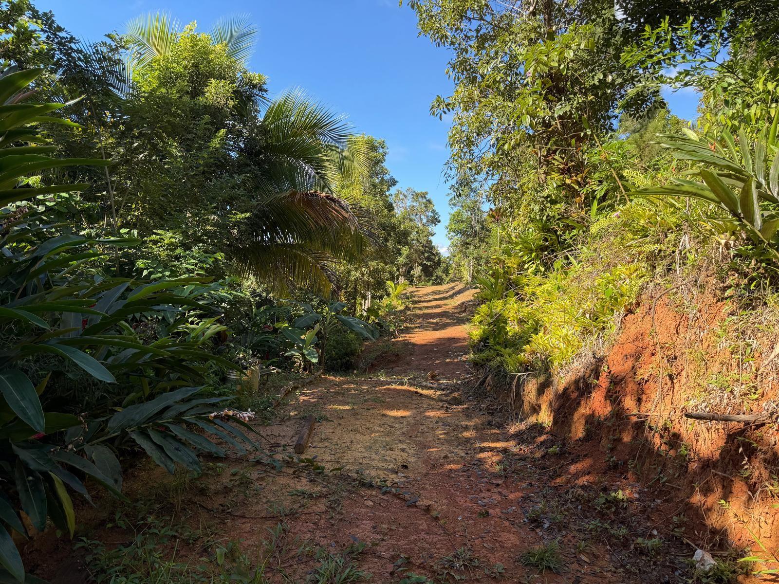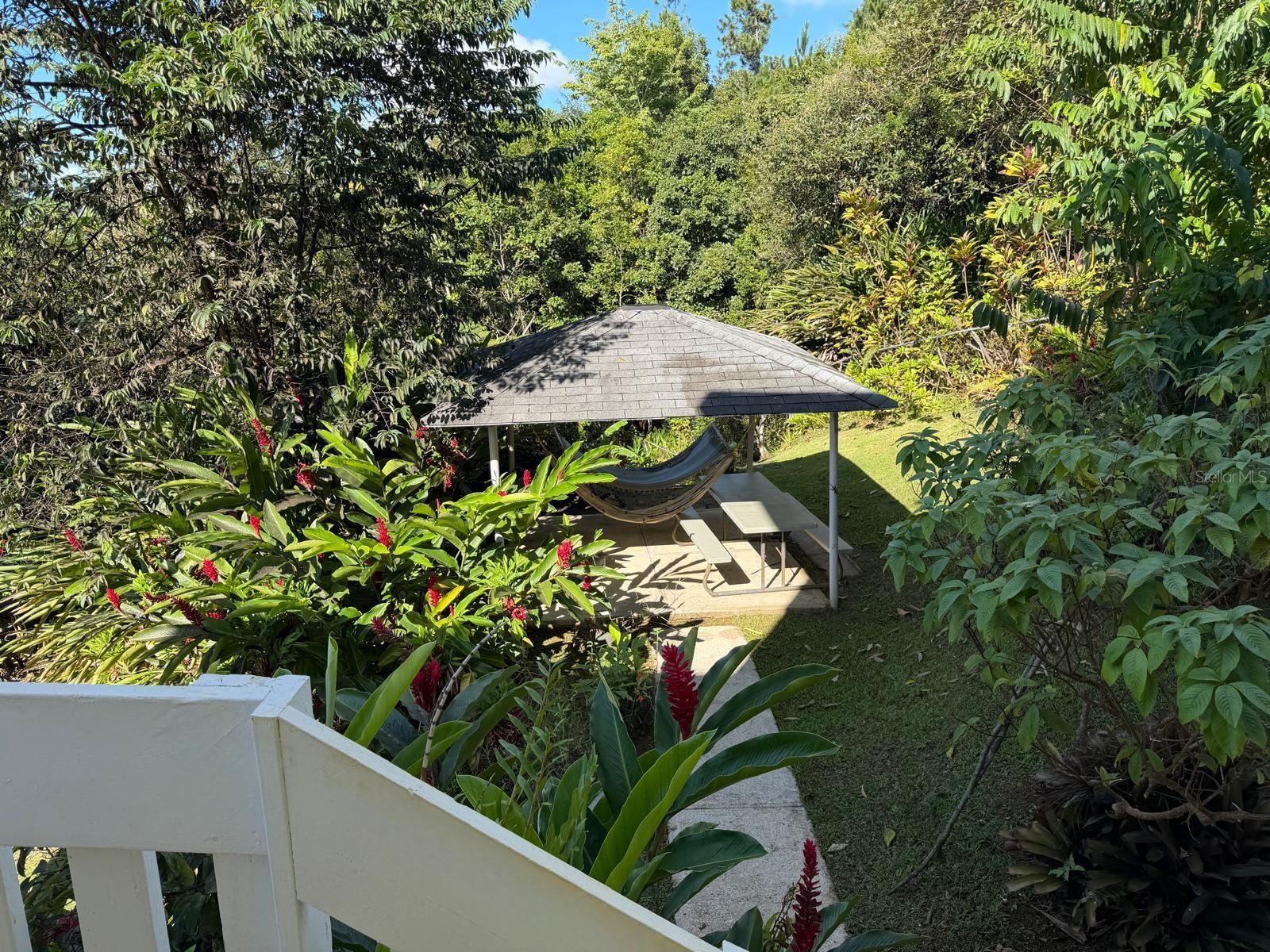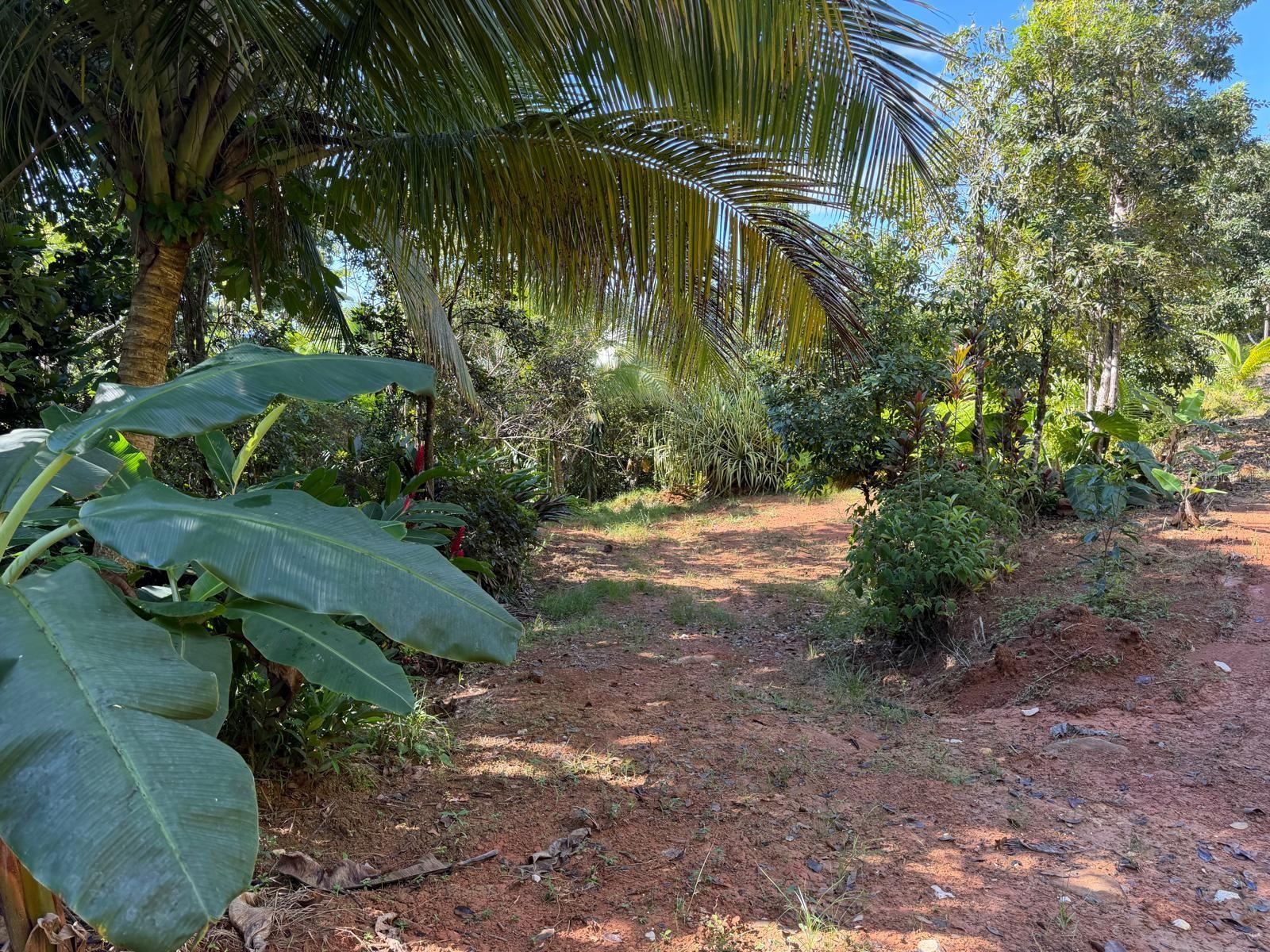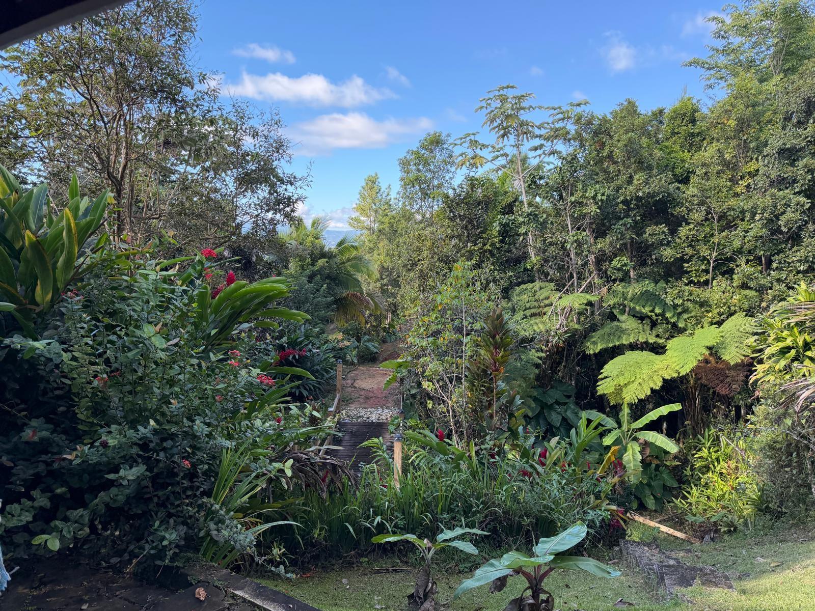 The property is surrounded by fruit trees and ornamental plants, including breadfruit, plantain, papaya, fig, mango, dragon fruit, pomarosa, loquat, coconut, and banana trees.