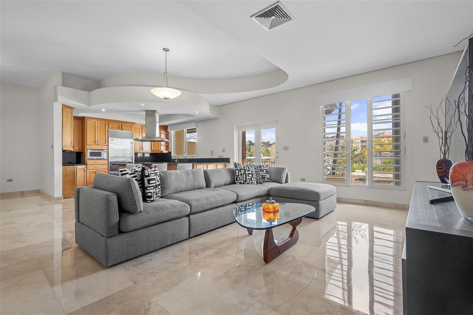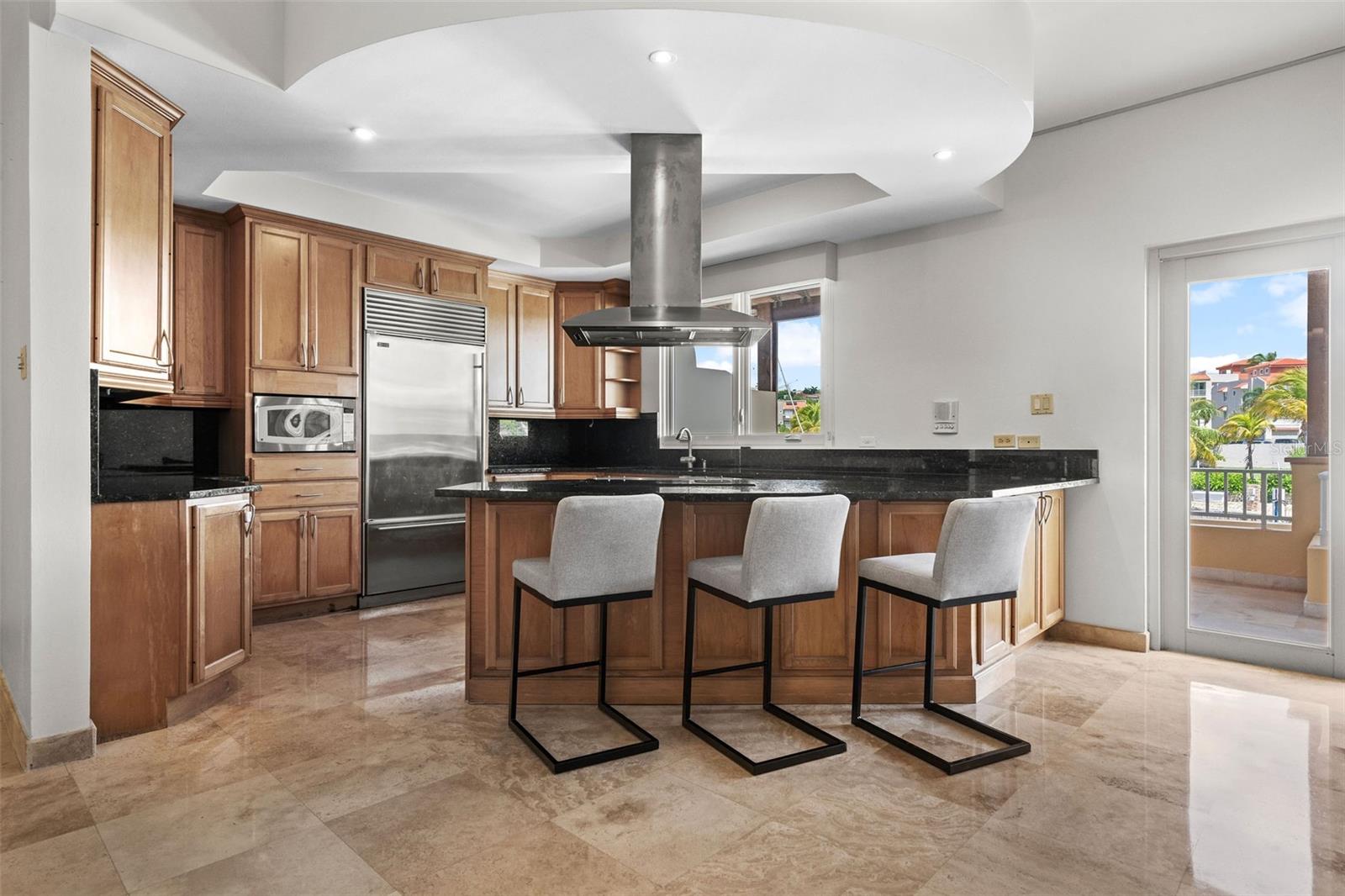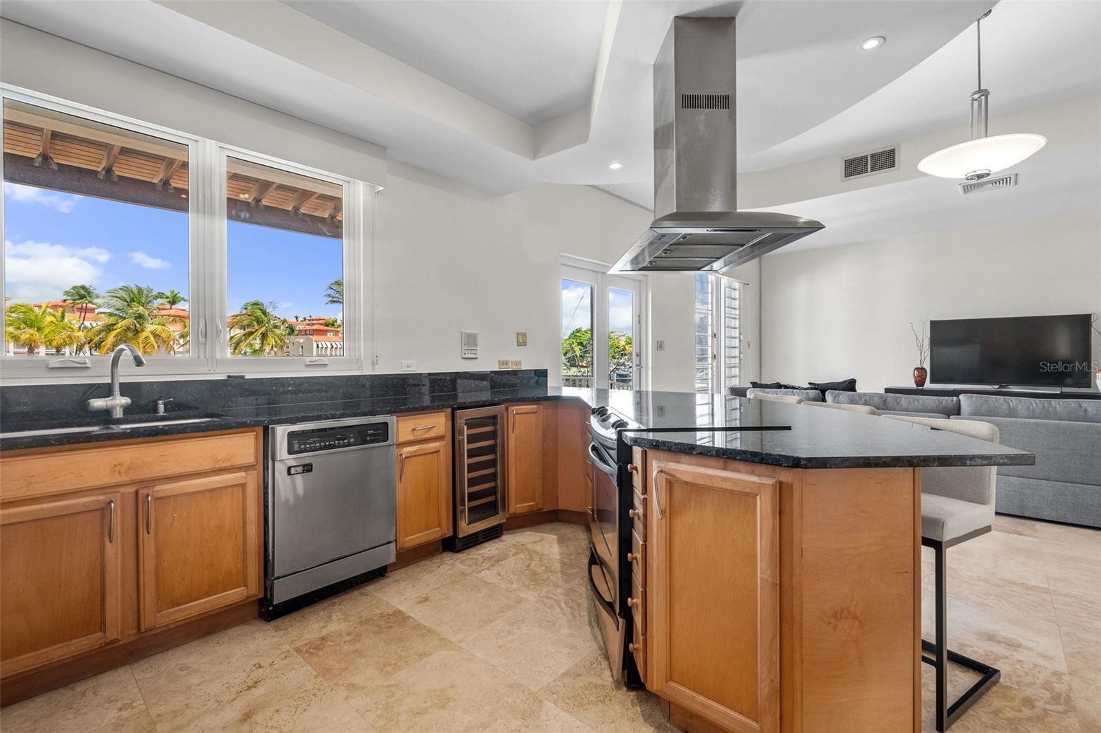 The chef’s kitchen is equipped with high-end appliances, ample counter space, and an open layout that seamlessly connects to the living and dining areas, perfect for entertaining while enjoying marina views.