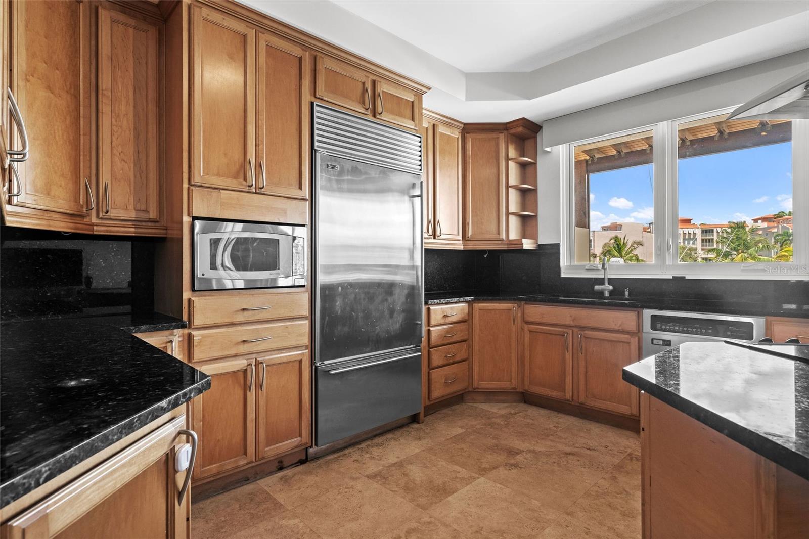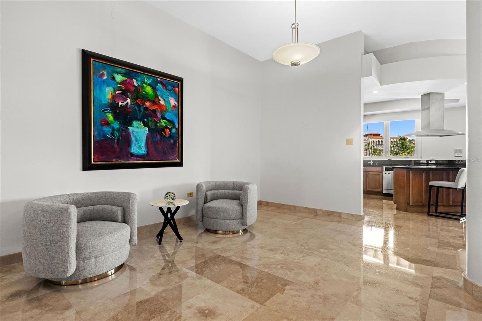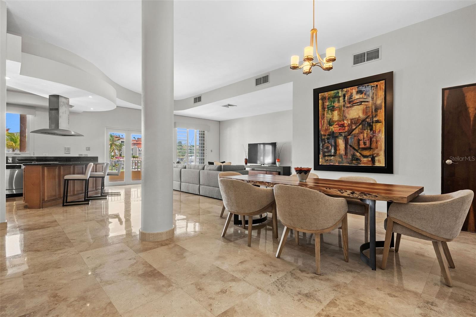 The chef’s kitchen is equipped with high-end appliances, ample counter space, and an open layout that seamlessly connects to the living and dining areas, perfect for entertaining while enjoying marina views.