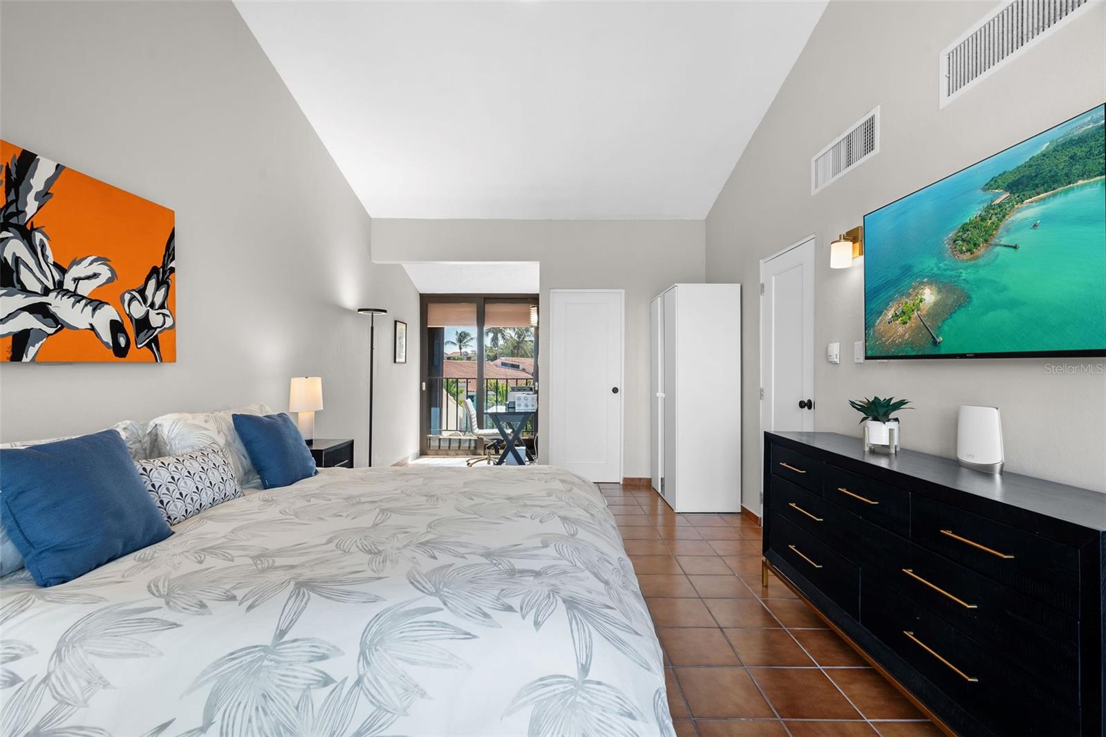 The main living level includes a living room, dining area, and kitchen, opening to a balcony/terrace overlooking the lake with partial gulf views. This level also offers two additional bedrooms, a full bathroom, and a laundry room. The upper level is dedicated to the primary bedroom, featuring access to a private rooftop terrace, ideal for enjoying the surrounding views.