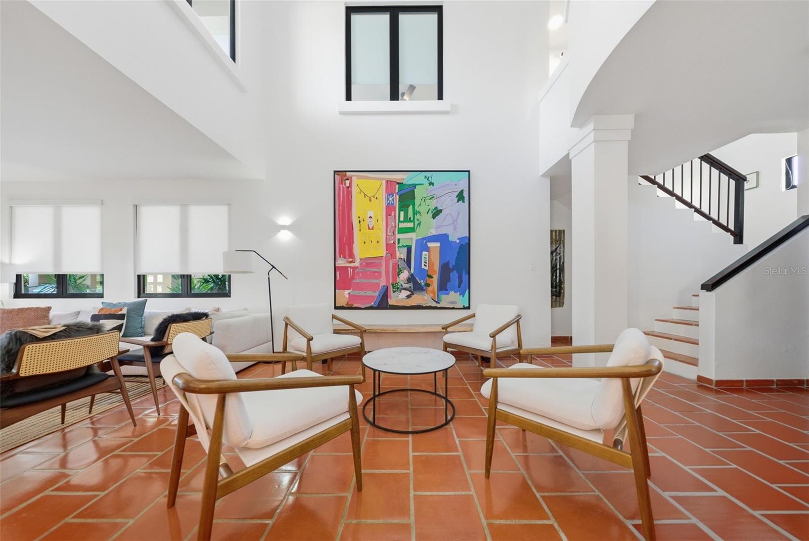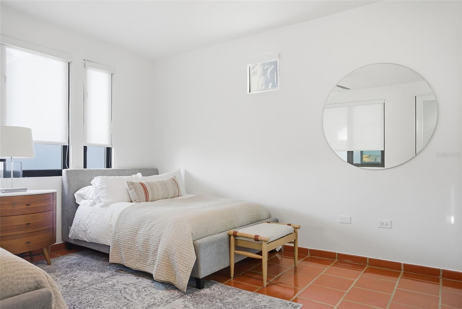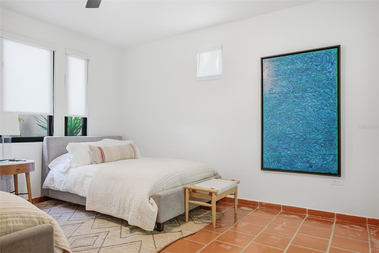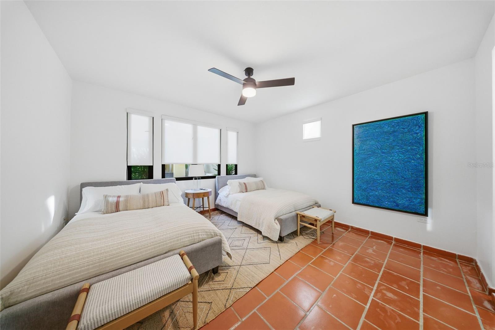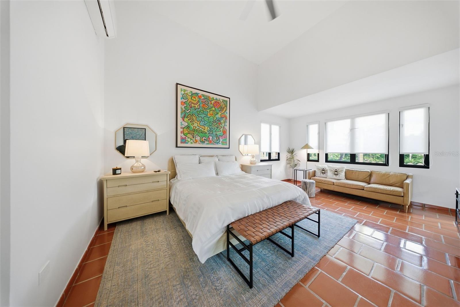 The first level features a spacious living room, family room, kitchen, dining area, laundry room, a covered terrace with barbecue area, and a full en-suite bedroom. The second level offers a comfortable primary suite with high ceilings and a private balcony, along with a second en-suite bedroom.