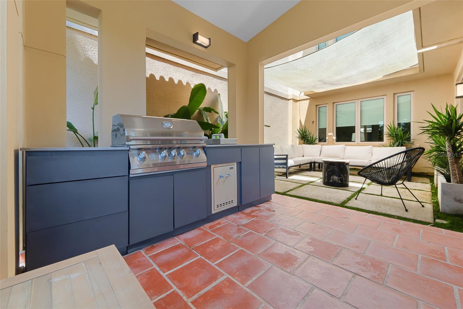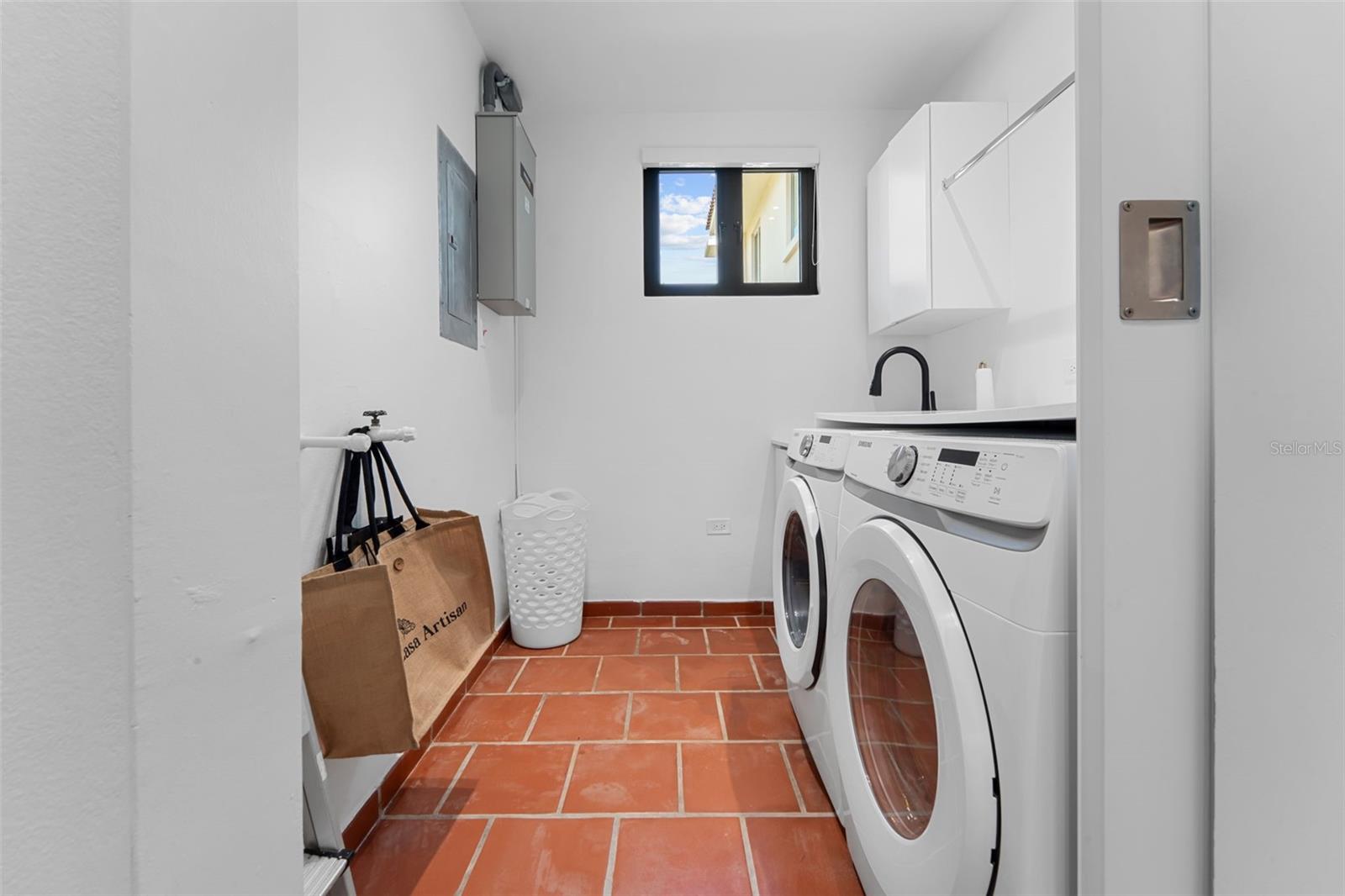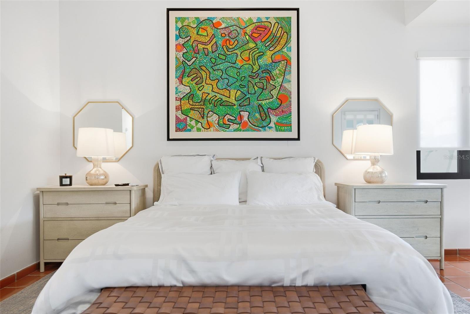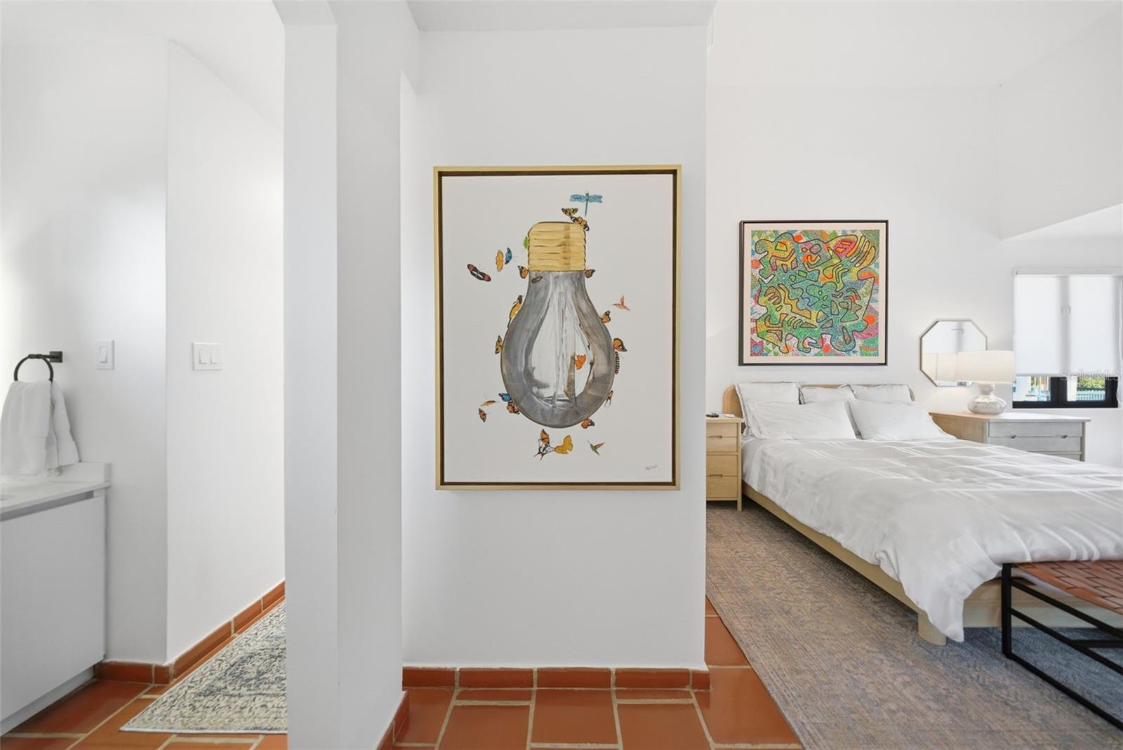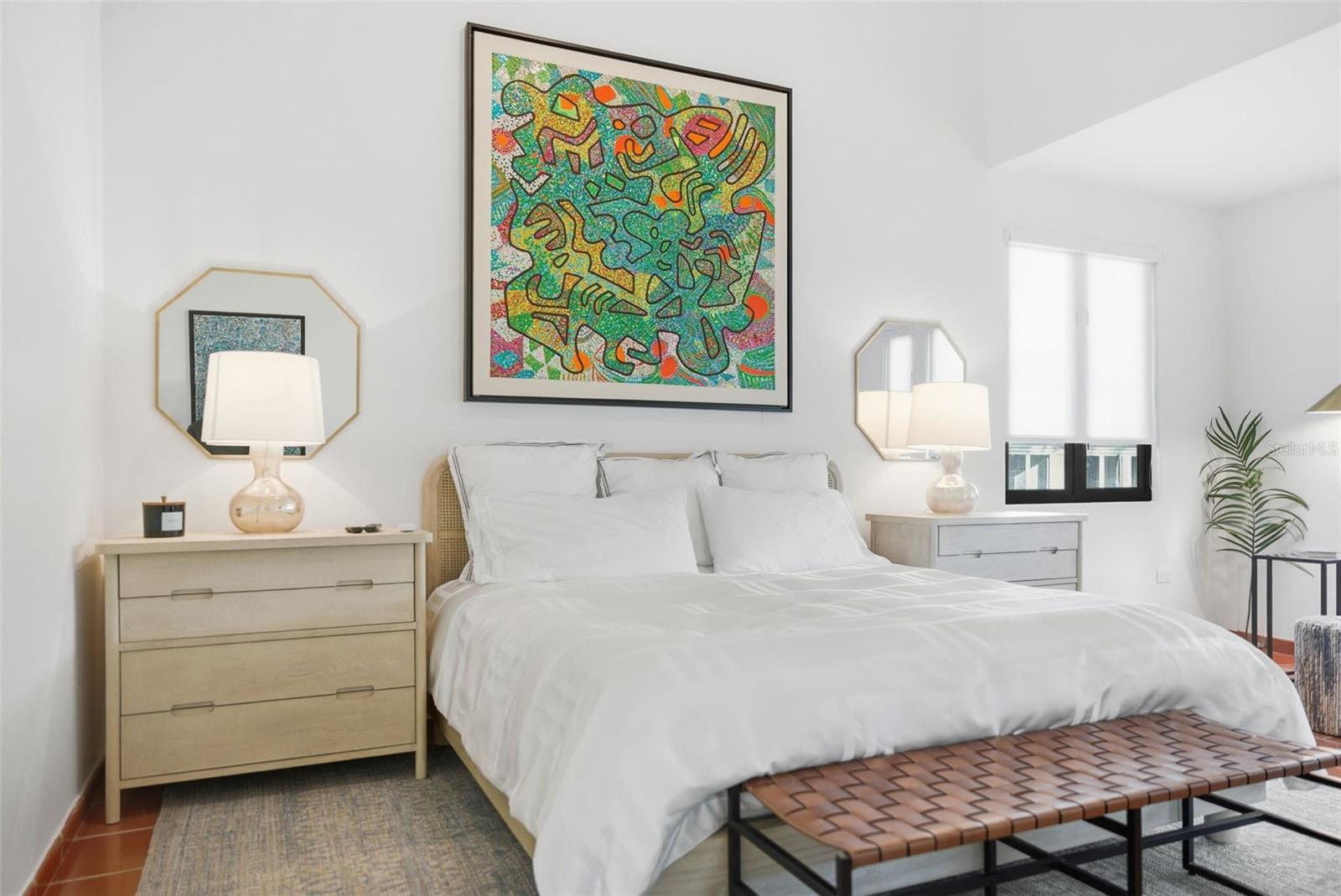 The first level features a spacious living room, family room, kitchen, dining area, laundry room, a covered terrace with barbecue area, and a full en-suite bedroom. The second level offers a comfortable primary suite with high ceilings and a private balcony, along with a second en-suite bedroom.