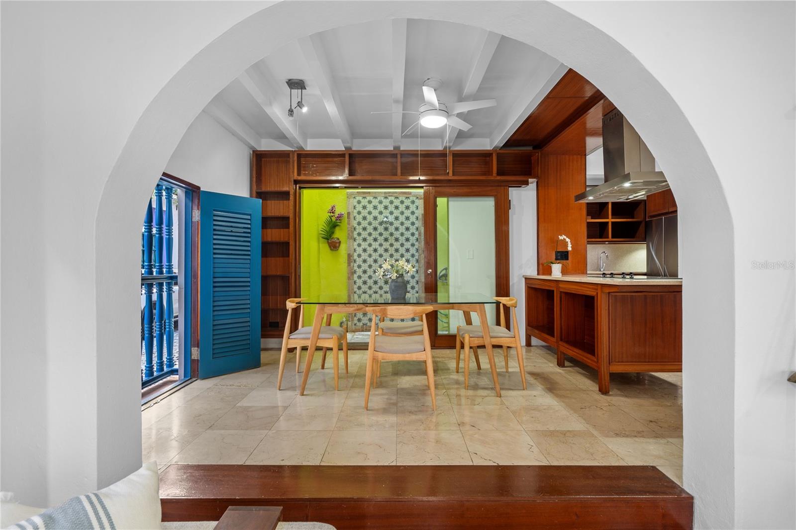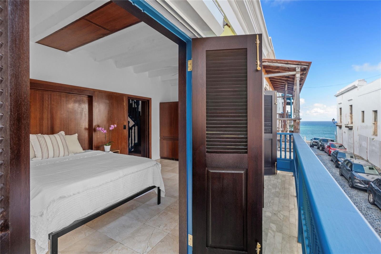 Situated on one of the most iconic and photographed blocks in Old San Juan, at the corner of San Sebastián and San Justo Streets, this distinctive corner townhouse forms part of a visually unified row of privately owned homes. Distinguished by its corner placement and elevated setting, the residence anchors the block with a vivid canary-green façade accented by cobalt-blue doors, windows, and wood balconies—an architectural palette emblematic of Old San Juan’s historic character. Its position on one of the highest points of the old city affords constant trade-wind cross breezes and open outlooks, with ocean and bay glimpses from multiple levels. The home occupies an intimate footprint, yet unfolds across three levels designed to maximize light, airflow, and indoor-outdoor living. The ground floor features an open kitchen, dining, and living area ideal for entertaining, opening onto a private interior courtyard. A signature outdoor shower—framed in patterned Spanish-style tiles and open to the sky—serves as both a functional amenity and a classic Old San Juan architectural detail, accessed discreetly from within the home and directly from San Sebastian street through an arched blue door. The second level offers two bedrooms and a full bathroom. One bedroom opens onto a wide balcony facing San Justo Street, capturing ocean glimpses and prevailing breezes, while both bedrooms feature Juliet balconies facing San Sebastián Street, enhancing natural light and cross ventilation throughout. The third level hosts a spacious flex room with a full bathroom—suitable as a primary bedroom, family room, or studio—opening directly onto an L-shaped terrace with expansive views over the historic rooftops, the bay, and the Atlantic Ocean beyond. A spiral staircase ascends from the terrace to an open rooftop deck outfitted as a relaxed lookout and lounge area. From this elevated vantage point, the home commands sweeping panoramic views of Old San Juan’s skyline, coastline, and surrounding cityscape. Located on San Sebastián Street, one of the district’s most celebrated thoroughfares and within close proximity to renowned restaurants, cafés, and cultural landmarks, this exceptional corner townhouse offers a rare opportunity to own a visually iconic, light-filled residence that captures the essence of Old San Juan’s architectural and cultural legacy.