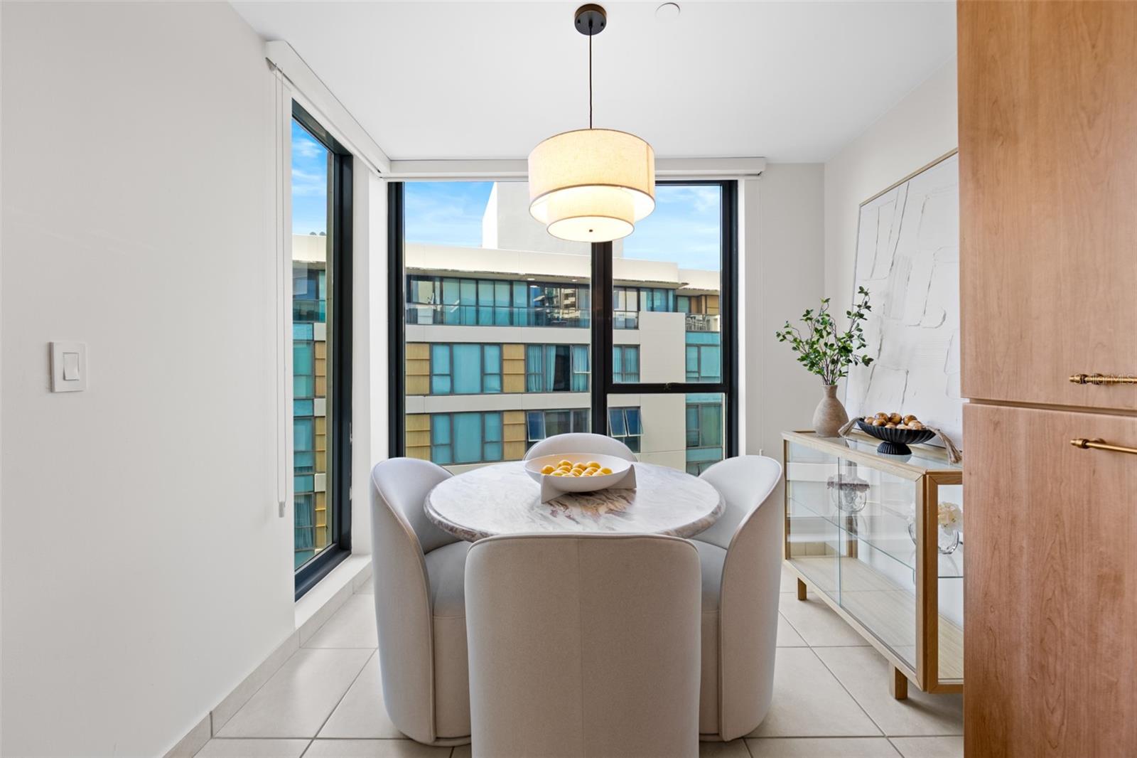 The elegantly decorated kitchen and living room offer a sophisticated yet comfortable setting, ideal for entertaining guests or unwinding at home. A bright dining nook, framed by floor-to-ceiling windows, fills the space with abundant natural light and provides the perfect spot for morning coffee or casual meals.