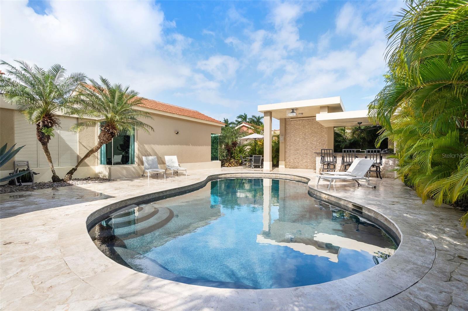 Outdoor living is equally inviting, featuring a covered terrace, a BBQ kitchen, and a resort-style pool complete with an outdoor shower and bathroom, ideal for entertaining and enjoying Puerto Rico’s year-round tropical climate.