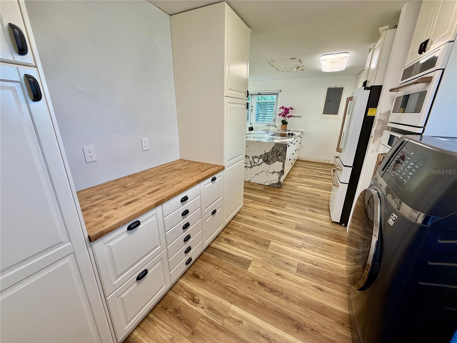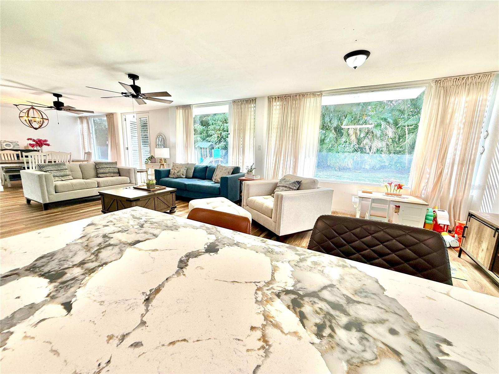 The home has been thoughtfully redesigned to feature a bright, open-concept layout, seamlessly connecting the living room, dining area, and kitchen—ideal for both everyday living and entertaining. The spacious modern kitchen is a standout, showcasing a large central island, elegant stone countertops, and high-end Café appliances, complemented by a walk-in pantry and a laundry room conveniently integrated next to the kitchen for added functionality.