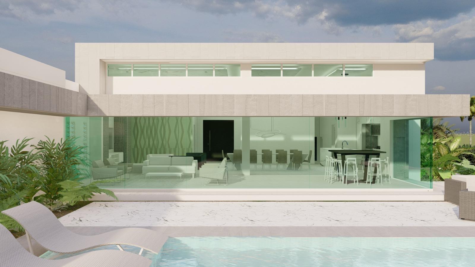 Every bedroom includes a private bath and walk-in closet. The primary suite commands the home with a 12×12 dressing room and direct views to the private pool. 16’–12’ ceilings and floor-to-ceiling glass create volume, light, and architectural presence that translates directly to long-term value.
