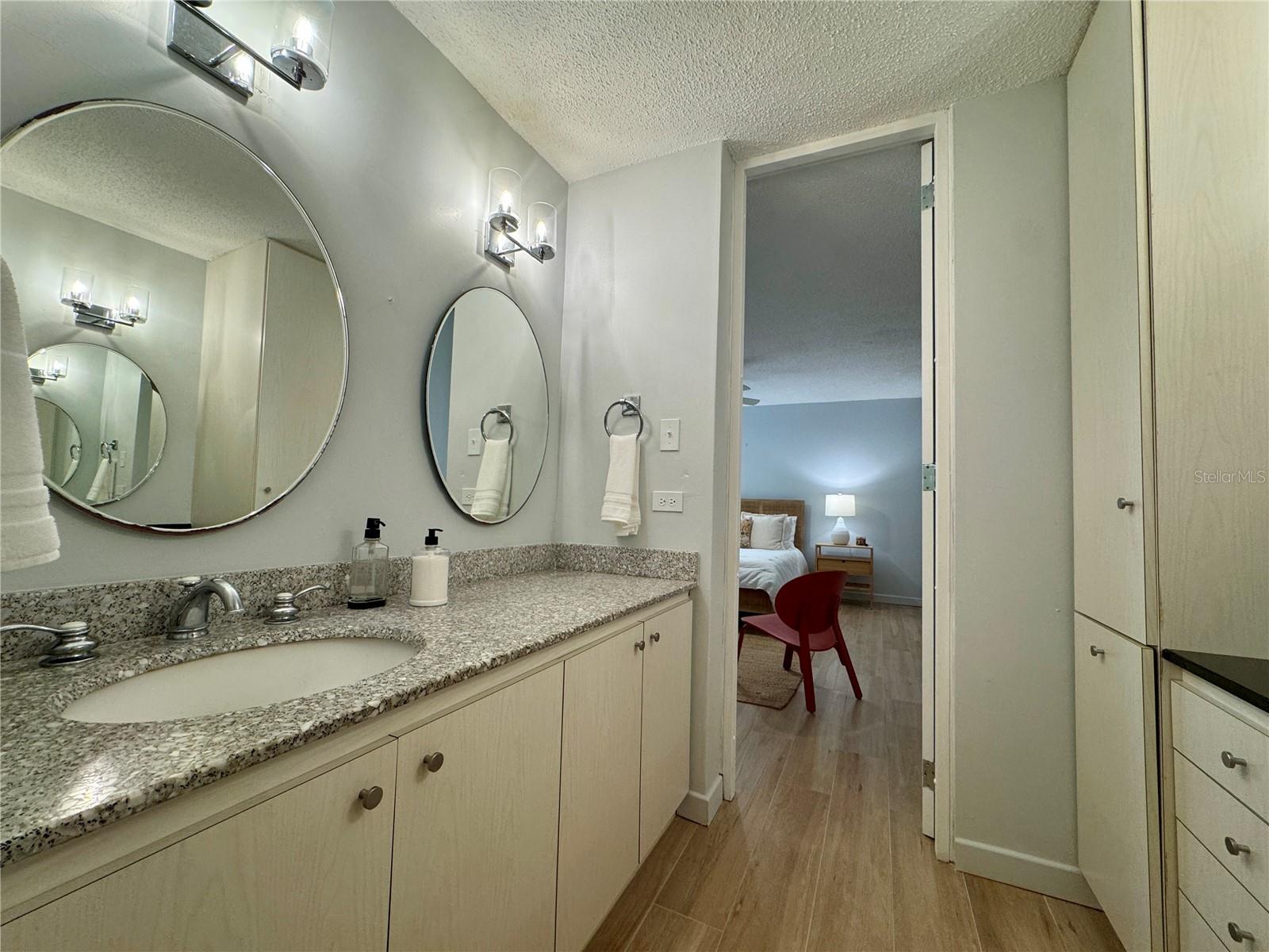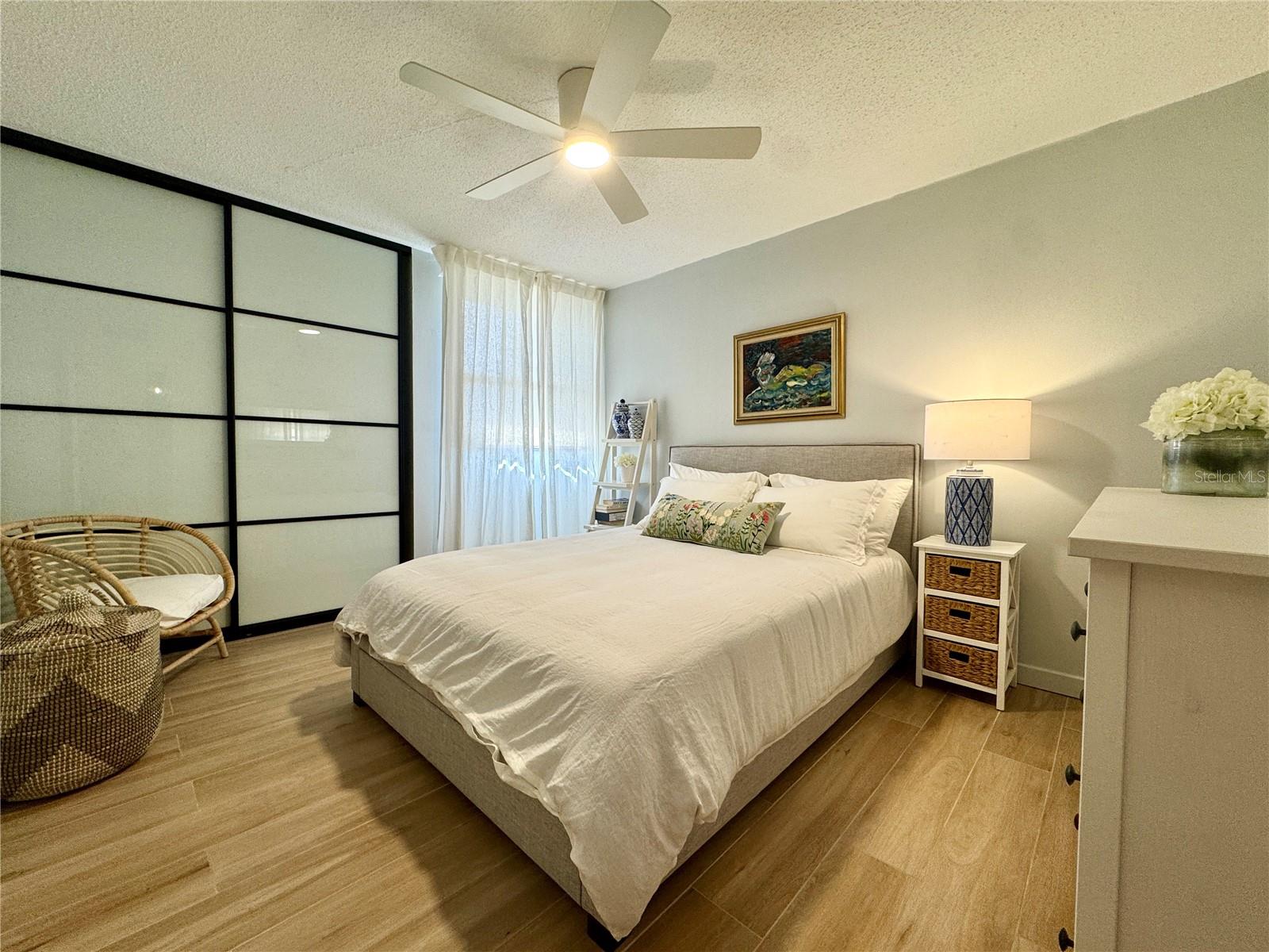 Additional features include new flooring, California Closet organizers, blackout and sheer weave curtains, a dedicated laundry room with utility sink and one covered parking space. The building is surrounded by lush landscaped green areas and fountains, creating a serene retreat that brings nature into daily city life. Amenities include a partial backup generator for common areas and a water cistern.