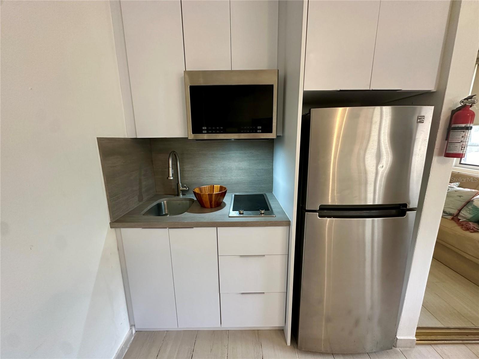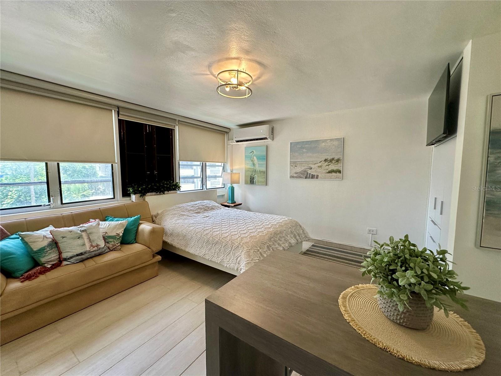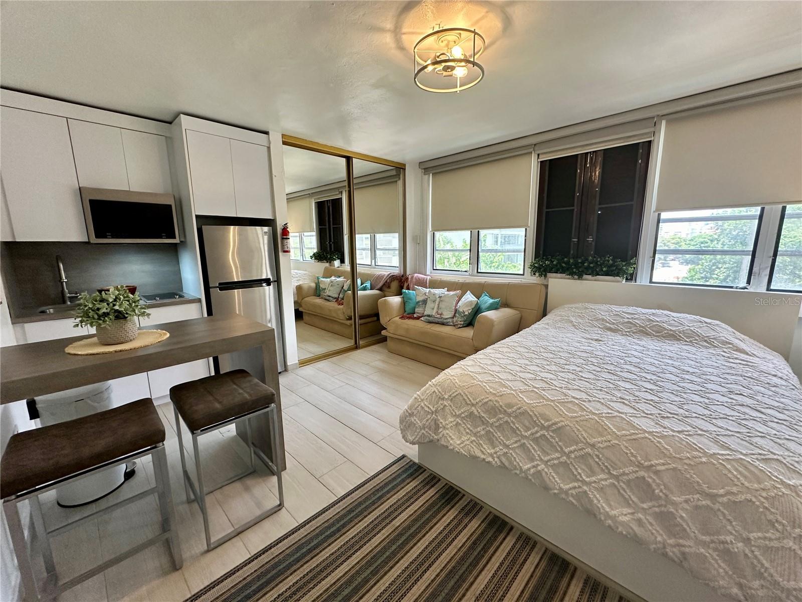 This well-appointed studio features a queen bed plus a sofa bed, offering flexible sleeping arrangements. The compact kitchen includes a stovetop, refrigerator, and freezer, ideal for day-to-day convenience. The unit also includes one full bathroom.