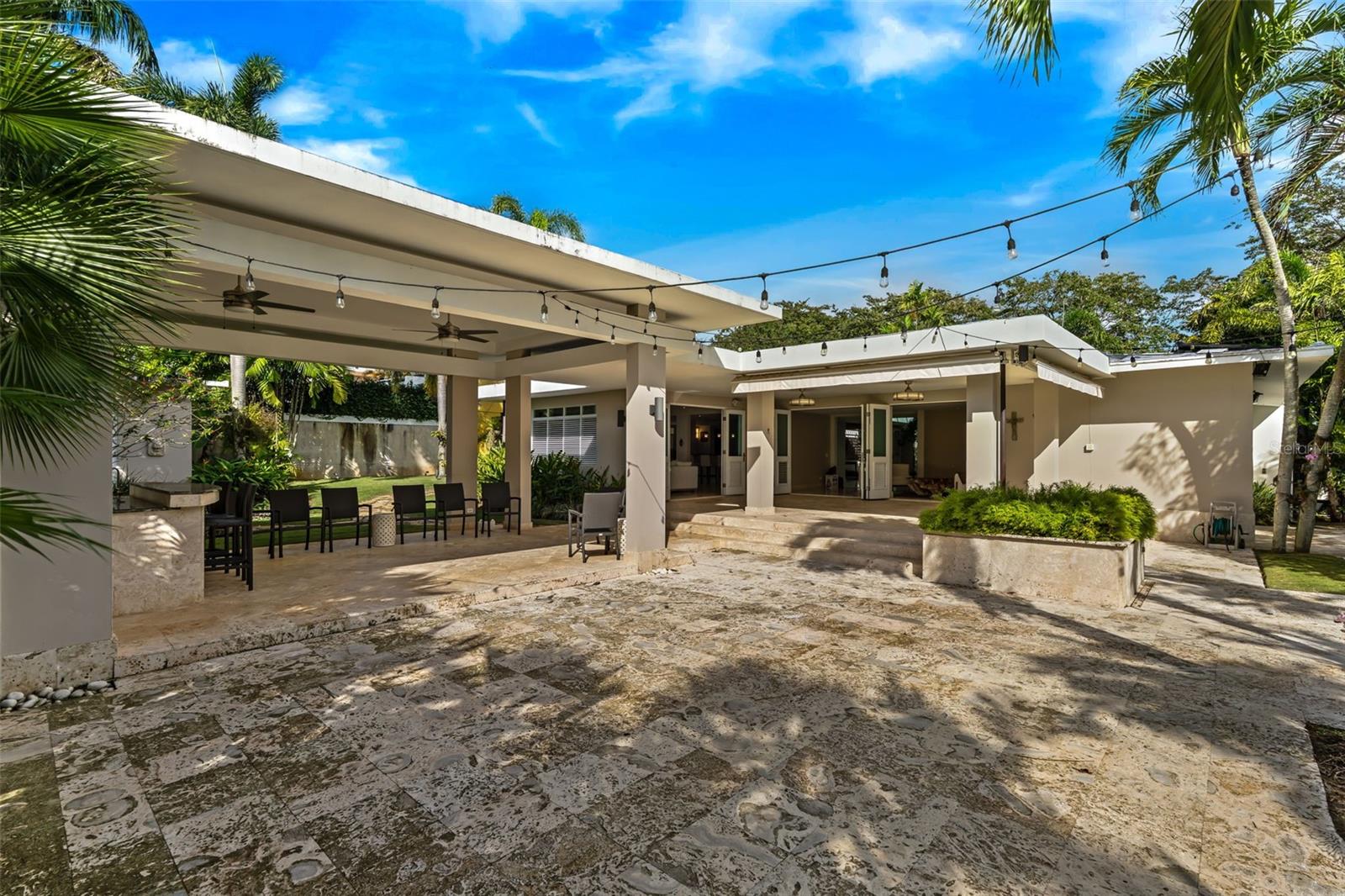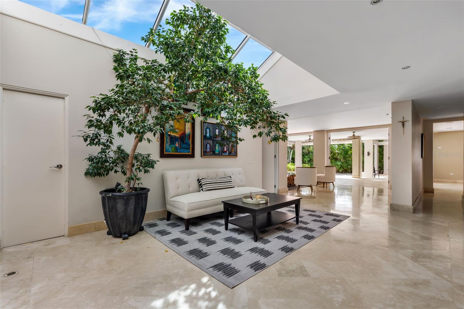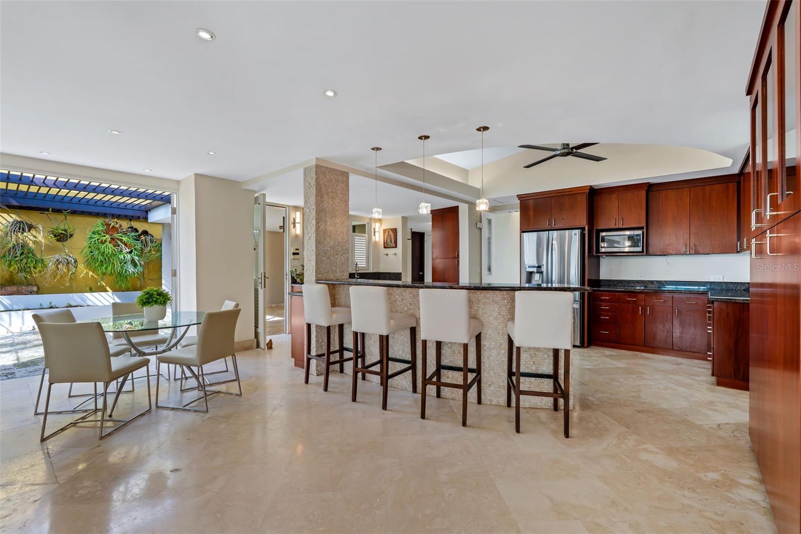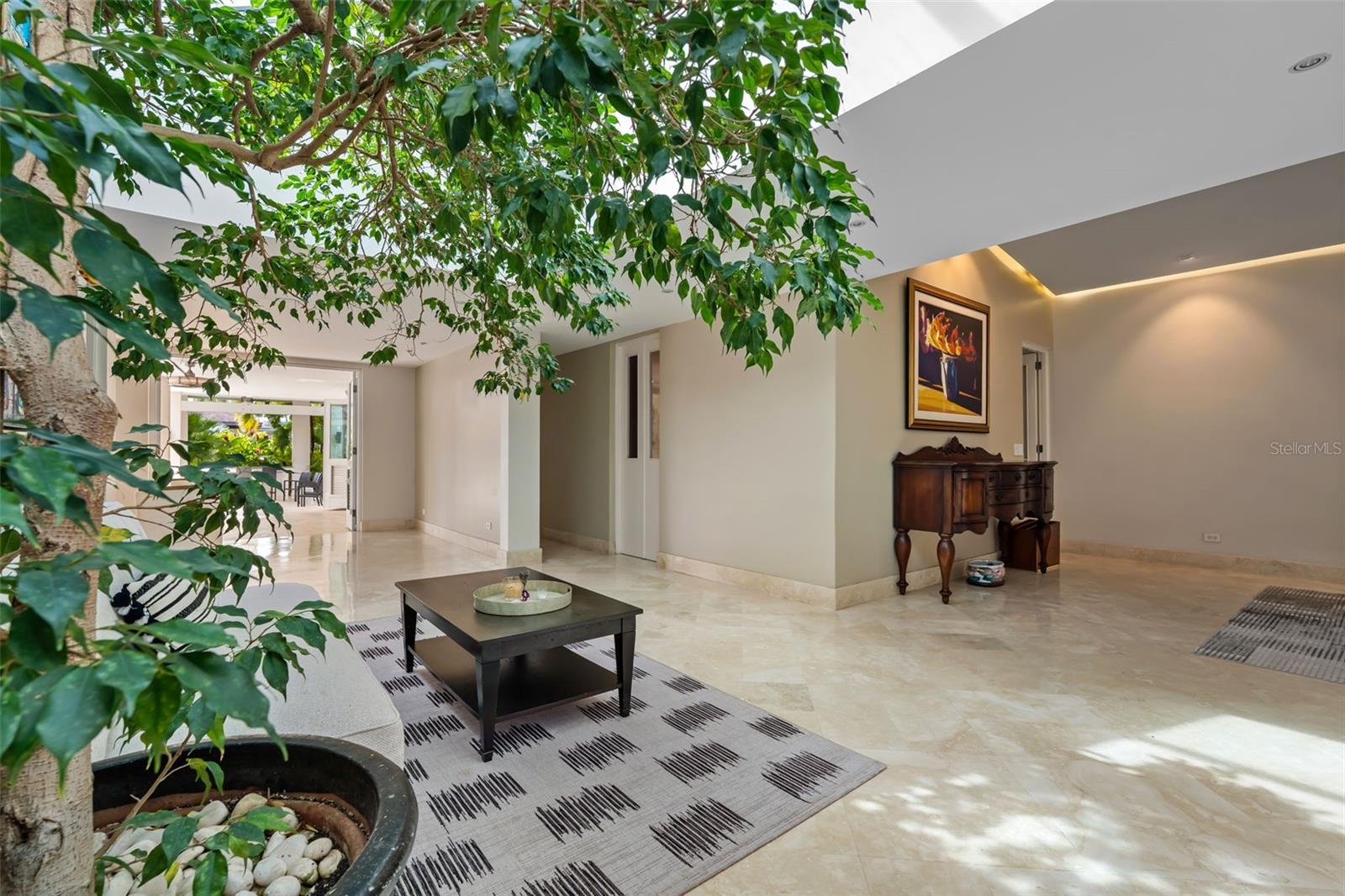 This stunning single-story residence offers a seamless blend of elegance, comfort, and nature. From the moment you enter the property, you are welcomed by the soothing sound of a refined water fountain set in a beautifully landscaped exterior courtyard, creating a tranquil transition into the home. This courtyard connects directly to the interior dining area, allowing natural light, greenery, and outdoor serenity to flow effortlessly indoors.