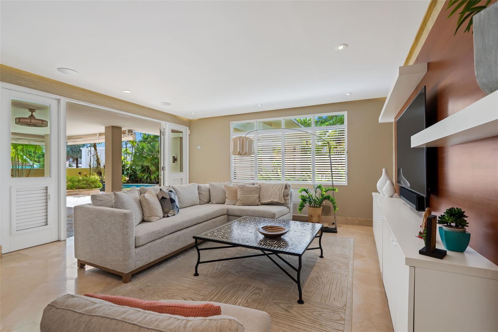 The living areas include a formal living room and a family room, both equipped with security doors that open to the exterior, enhancing the connection to the lush backyard and creating a peaceful, indoor-outdoor living experience.