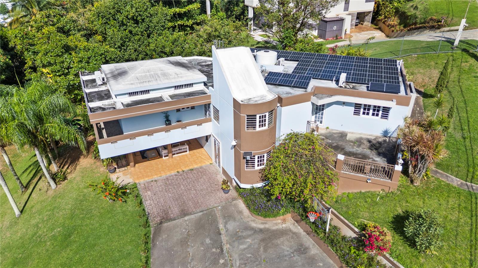 Located within the gated community of El Mirador de San Juan, this distinctive residence offers privacy, space, and a timeless architectural presence on an expansive half-acre lot surrounded by mature tropical landscaping. Avocado and plantain trees frame the property, creating a serene, garden-like setting that feels both established and tranquil.