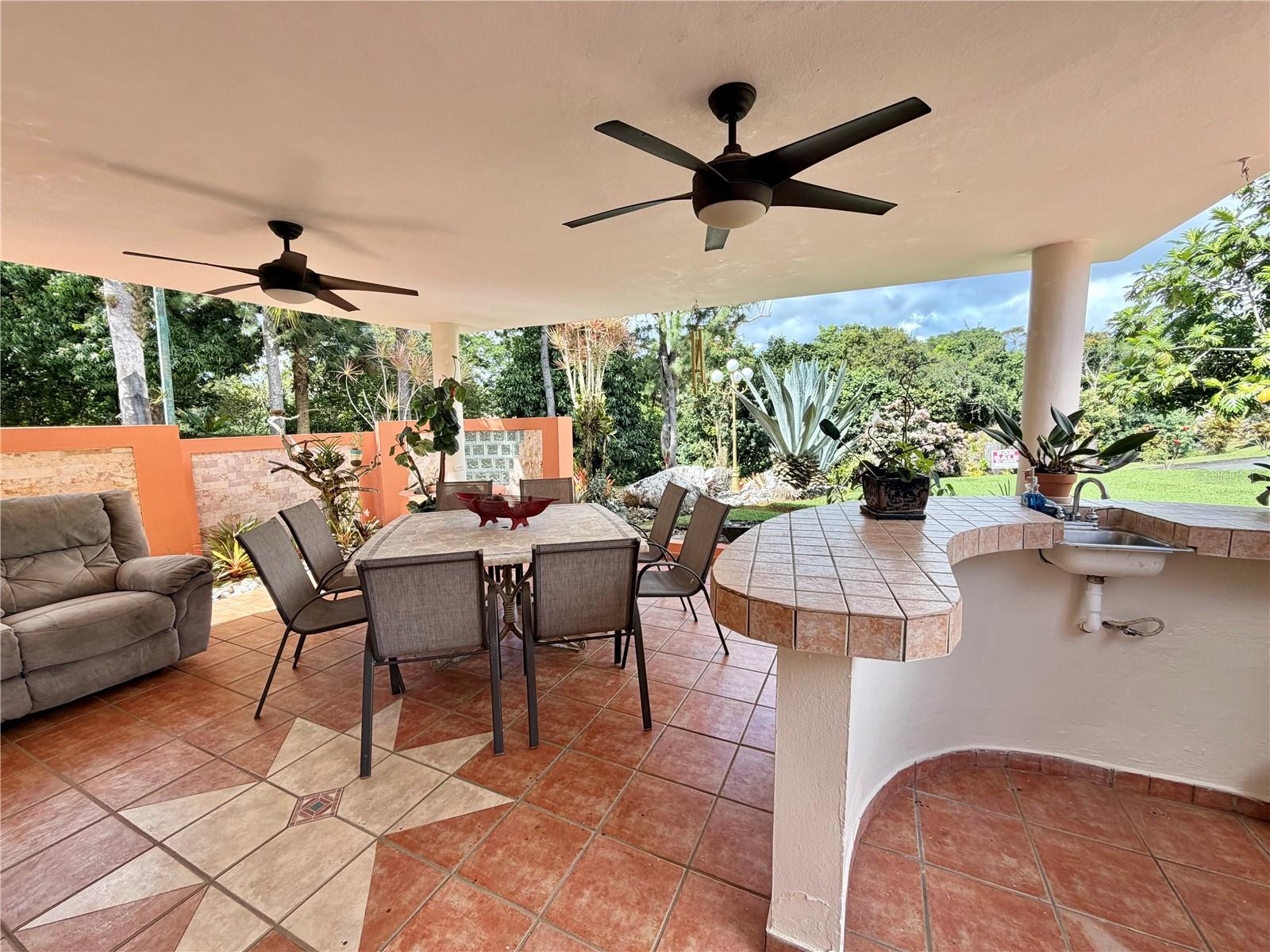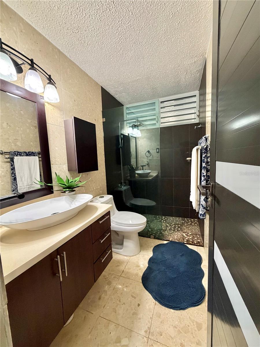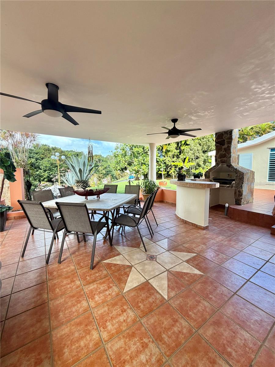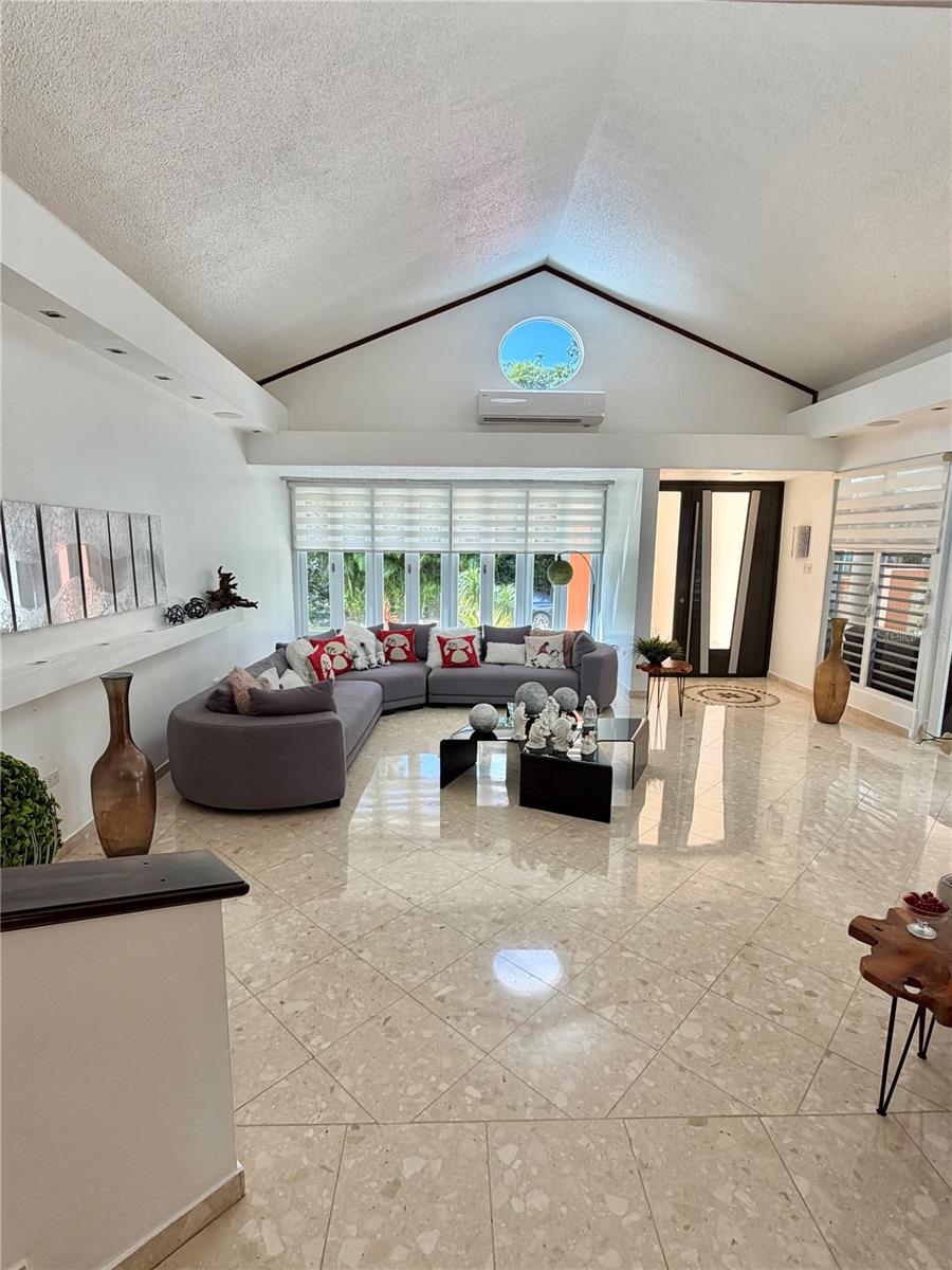 The interior spaces are enhanced with coffered ceilings and fascia lighting in the living and dining areas, an integrated sound system with built-in speakers in the living room and terrace, a remodeled façade, a staircase with genuine Manatí stone slabs, and exquisite landscaping featuring 11 ornamental stones, bromeliads, and tropical vegetation.