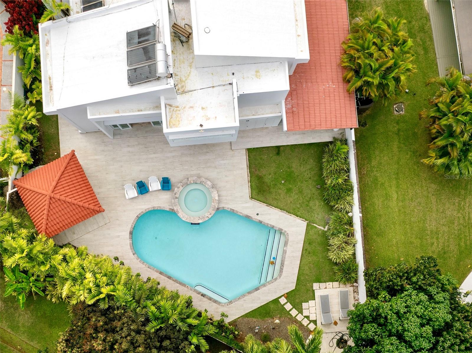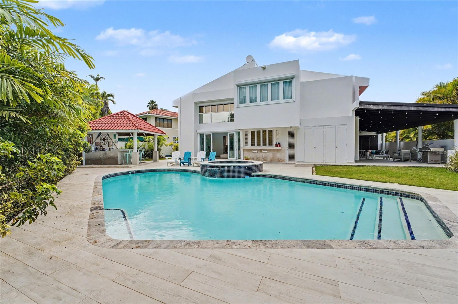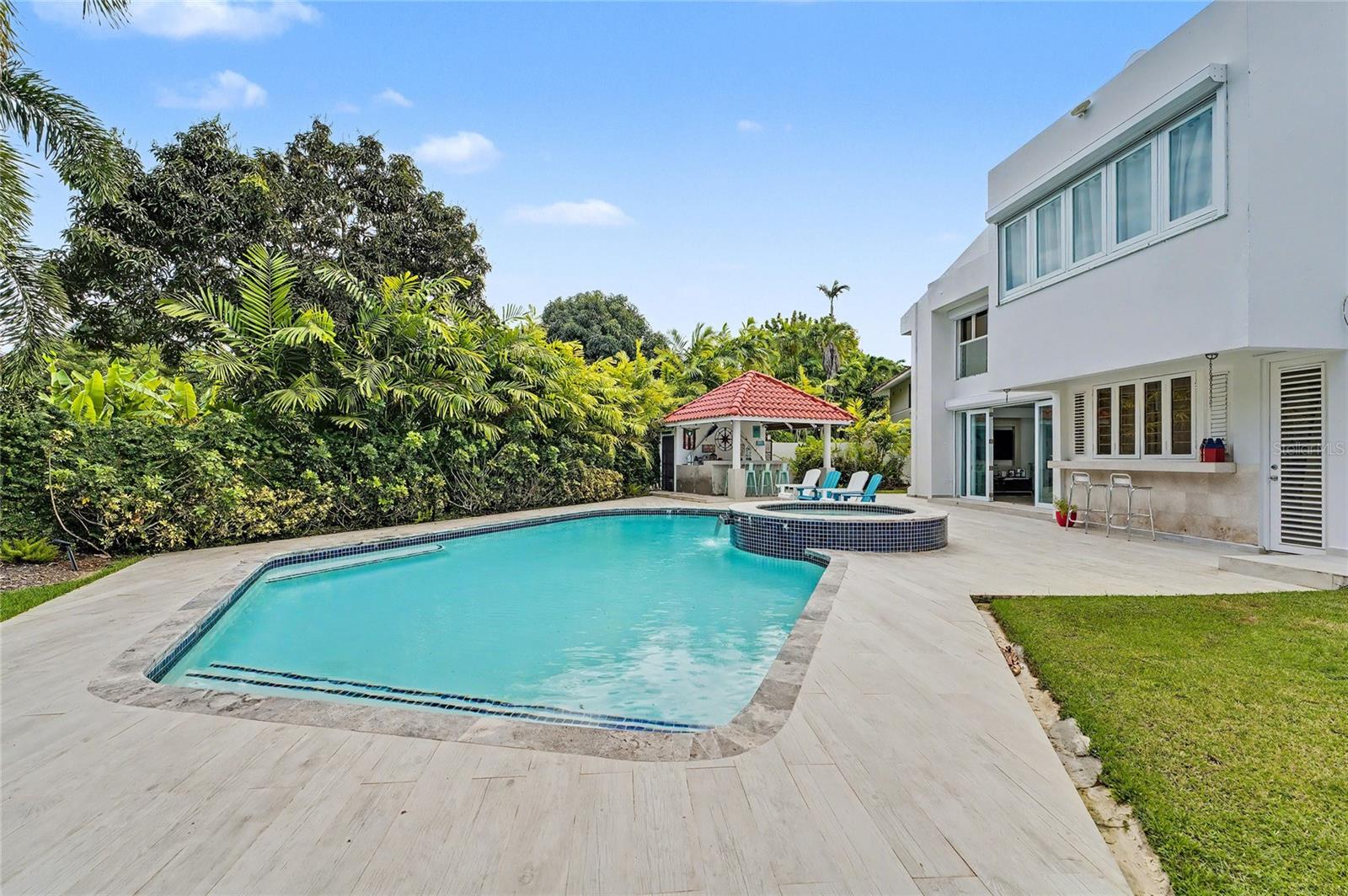 Enjoy living in this one-of-a-kind elegant residence nestled within the exclusive gated community of Santa Maria, one of the most sought-after secure enclaves within the San Juan metro area. Experience the best of two worlds at this home thoughtfully designed for large-scale living and entertaining with great presence and privacy, yet this home is also an oasis of tranquility, while being conveniently situated only about 6-8 miles from the city, Old San Juan and the beach. Spanning a grand total area of 6,250 sq.ft., this residence is designed with every detail in mind to feel like your private retreat featuring four oversized bedroom suites, each with an ensuite bathroom, in addition to a guest bedroom or office/flex room with another ensuite bath in the first floor. The house has an elegant formal living area next to a grand dining room, a modern open kitchen opening up into a Great room or family area with majestic double height cathedral ceilings all leading through tall glass doors into the terrace and outdoors. The home is a mini resort with a large fully equipped gym and an ensuite bath, a large covered terrace, a complete gazebo with a wet bar, a pool with a large jacuzzi, an outdoor full bath making this house also one for great entertaining. To complete it all, the home boasts an oversized laundry room, another large terrace on the second floor, several storage areas, 3 separate garages that can accommodate 4-5 cars, a 20kw diesel generator and 2 cisterns, electric hurracaine shutters, fiber optics, alarm, and cameras with a security system.