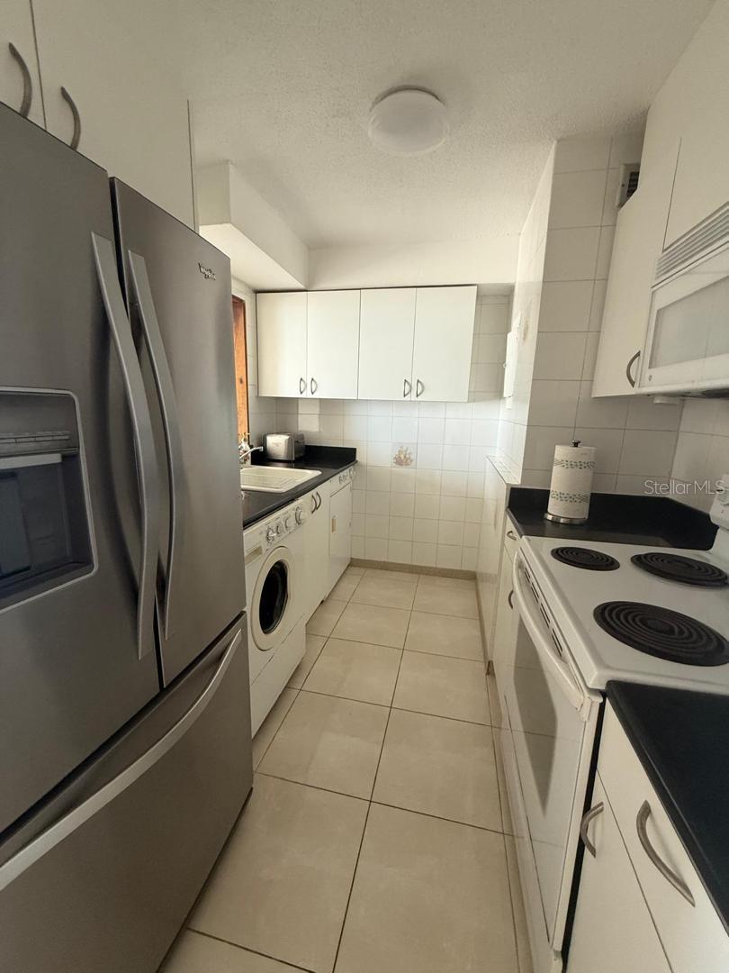 The apartment is sold fully equipped, including washer and dryer, refrigerator, range with oven, microwave, central air conditioning, light fixtures, ceiling fans, king-size bed with nightstands, and TV.