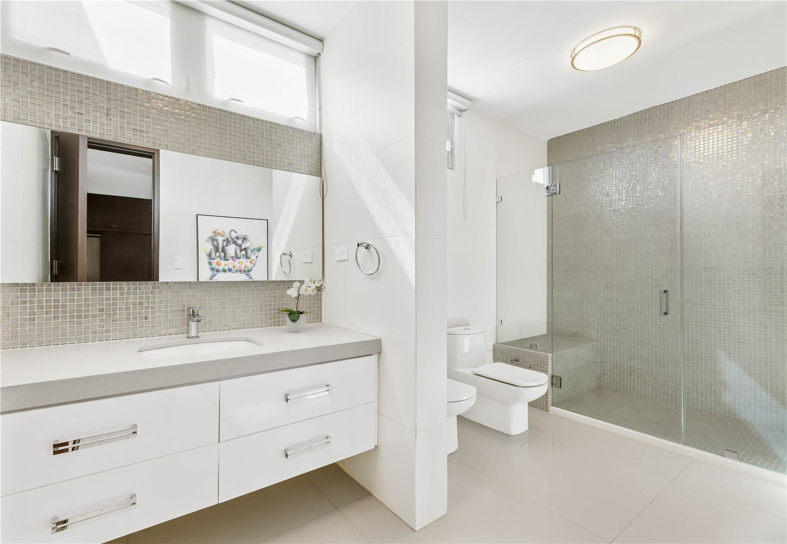 Located within the highly coveted enclave of Baldwin Park in Guaynabo, this stunning 2-level residence offers a modern aesthetic and expansive design situated on a 1,337.25 Sq. M. lot. Spanning a total of approx. 8,559 Sq. Ft., this home with 5 bedrooms and 6 bathrooms features a meticulously crafted open-concept layout that prioritizes seamless indoor-outdoor connectivity. The approx. 4,431 Sq. Ft. of air-conditioned space showcase light-filled living areas and marble flooring. Fully equipped for your culinary endeavors, the eat-in kitchen features a large center island and prime finishes. The second level houses 4 of the bedrooms and 3 of the bathrooms, in addition to a dedicated laundry area and tech-room. The primary suite is accented by a private exercise space with balcony, walk-in closet and spa-inspired bath with a jetted tub, double shower and dual vanities. Affording approx. 3,388 Sq. Ft. of alfresco space, the home’s exteriors serve as the ultimate sanctuary. The spacious covered patio with BBQ leads out to the heated salt-water pool, providing the perfect setting for relaxation or entertaining. A full-power generator, water cistern, detached utility room and 3-car garage with approx. 740 Sq. Ft. are some of the property’s additional highlights. A gated community in the suburbs, Baldwin Park offers ease and convenience within tranquil surroundings. Near some of Guaynabo's top destinations, such as the natural splendor of La Marquesa park and recreational facilities at Moises Garcia Navedo Sports Complex. Also a short drive away from Baldwin School and San Patricio Plaza, as well as a variety of other entertainment and shopping options.