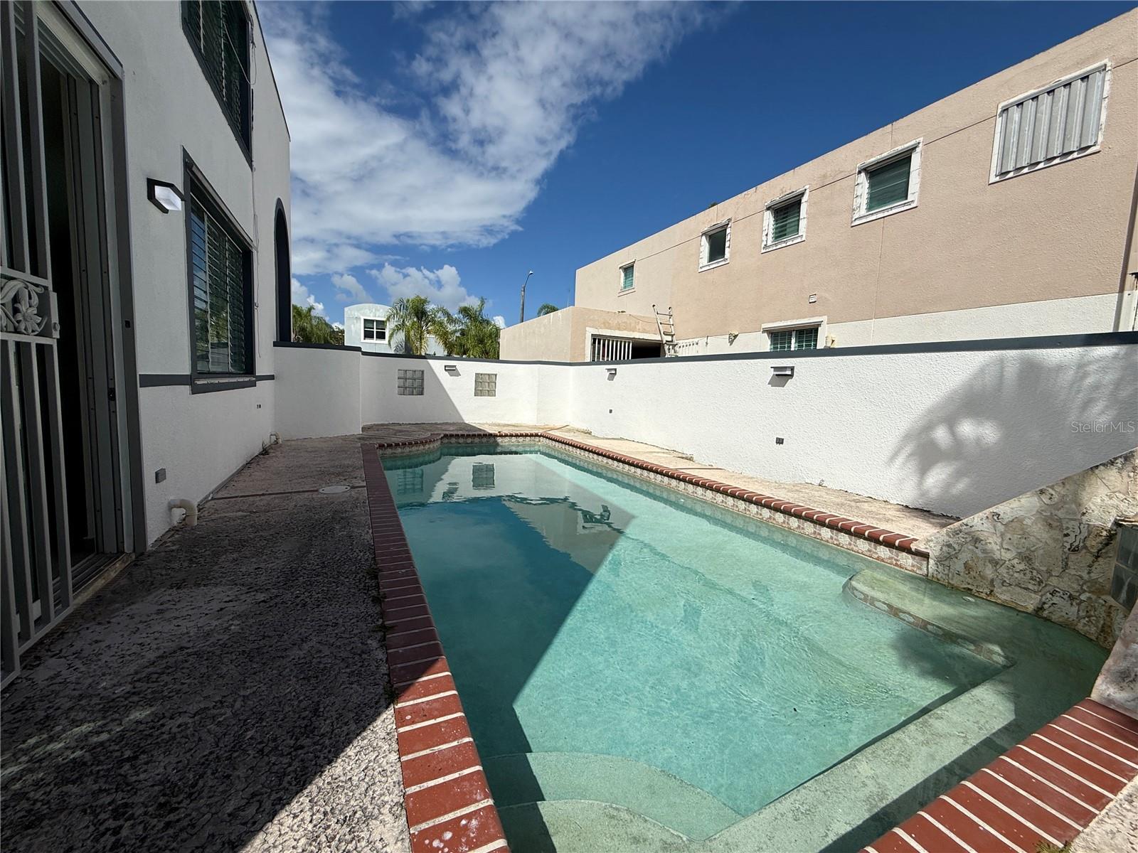 The home also features a double carport with a closed garage door, fenced outdoor areas, additional storage space, and a private swimming pool—ideal for comfort and privacy.