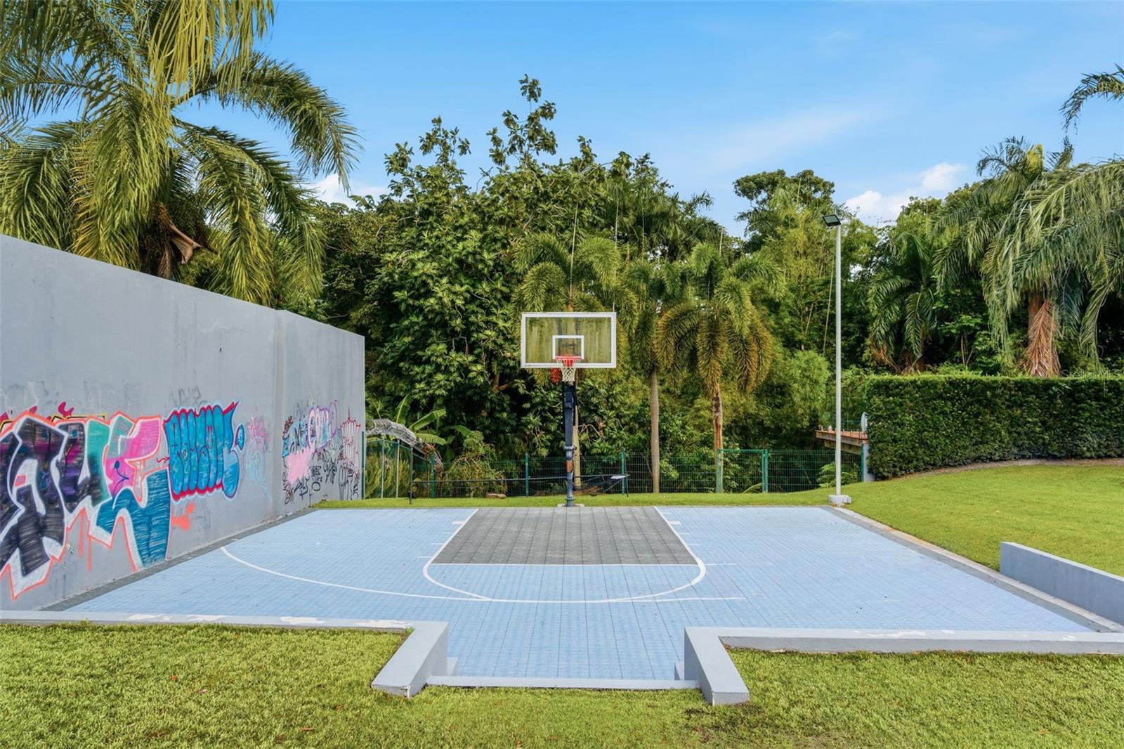 Outdoor living unfolds on a true estate scale. Manicured lawns frame a resort-style swimming pool, expansive terraces, and grand balconies overlooking the grounds. An outdoor kitchen and deck create a natural gathering point for entertaining, while a half basketball court adds a lifestyle-driven dimension rarely found in homes of this caliber.