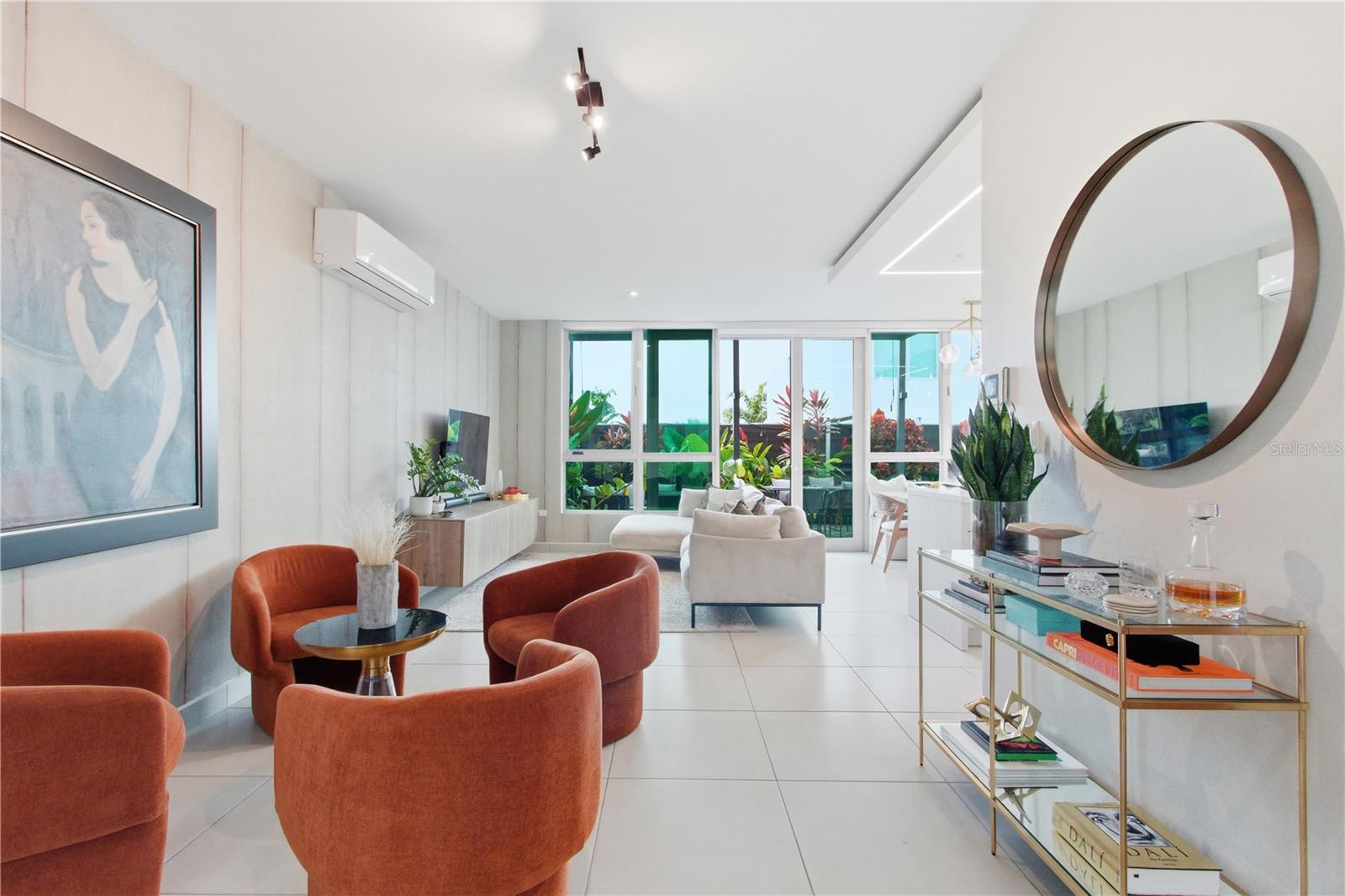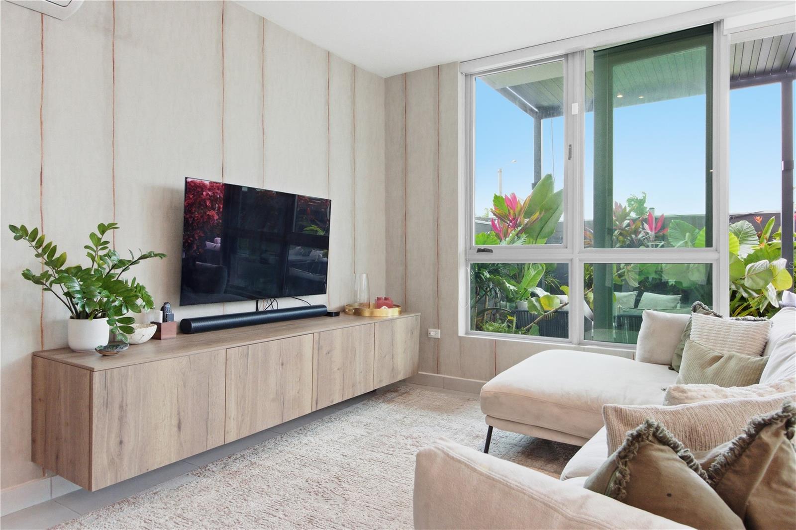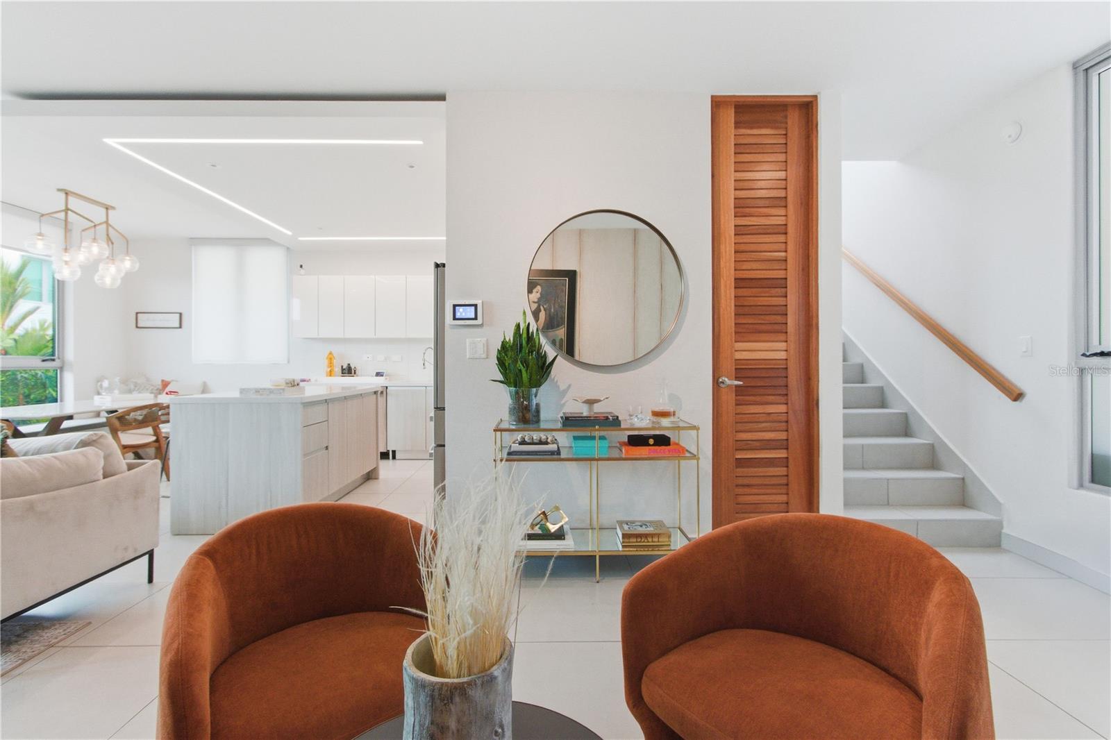 The open, fluid layout creates a seamless dialogue between the living, dining, and kitchen spaces—equally suited for refined entertaining and everyday living. Expansive windows frame greenery and reinforce the home’s calm, airy atmosphere.