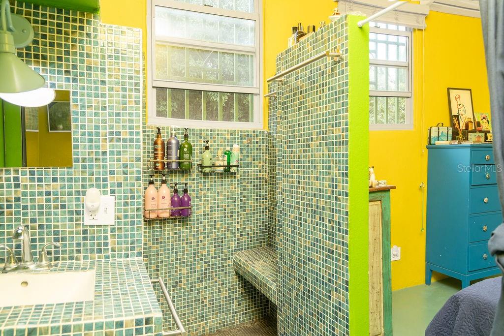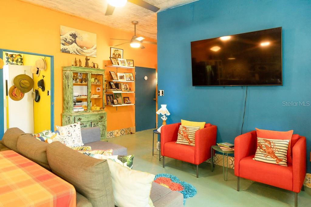 The large cook’s kitchen is as functional as it is playful, making cooking and entertaining both easy and enjoyable. The kitchen features two sinks, abundant cabinetry and storage, expansive counter space for preparation and hosting, and a central island/bar ideal for sipping martinis. The space is directly adjacent to a cozy living area making it a great space for casual gatherings or for relaxing in the evenings.