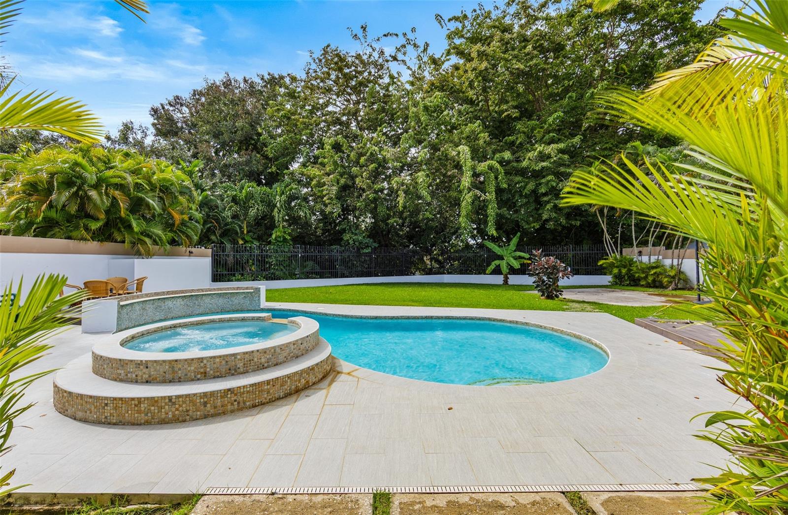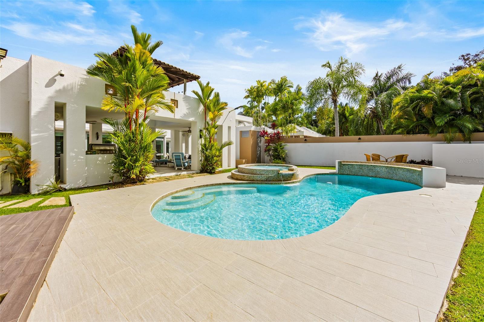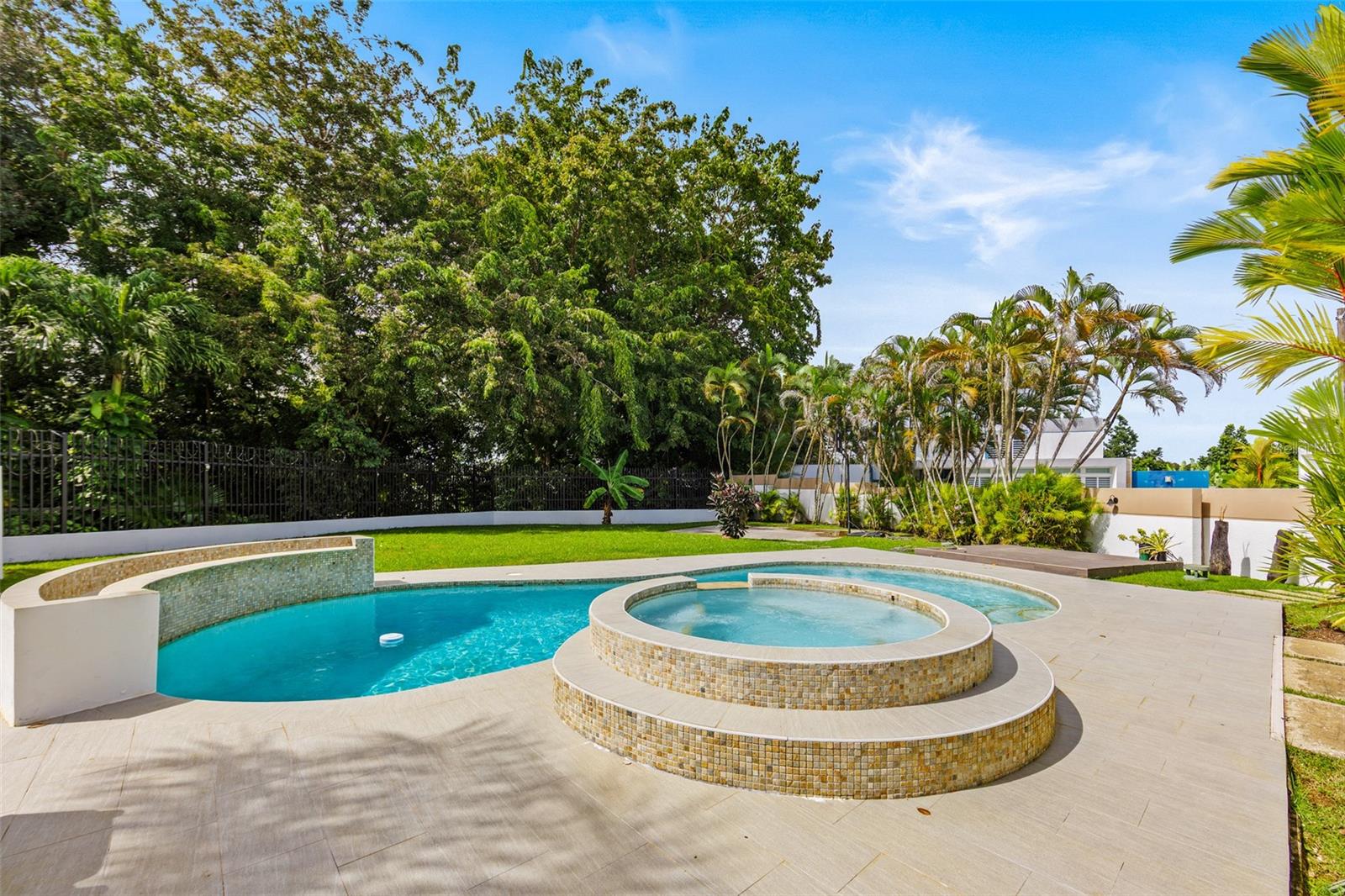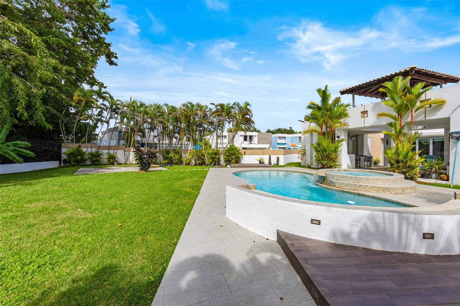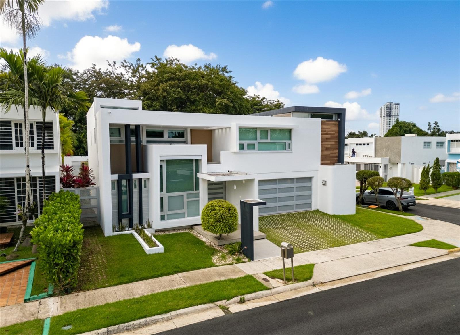 Luxury corner residence in El Mirador, San Juan. Fully remodeled and expanded with modern design and excellent spaces for entertaining. 3,714 sq ft of construction on a 1,100 sq meter lot. Features a swimming pool with jacuzzi and private backyard, outdoor entertainment area with kitchen and BBQ, plus a second-floor terrace overlooking the patio. Private home theater with seating and sound system. Remodeled kitchen (2022) with Bosch dishwasher, wine cooler, and porcelain countertops. Climate-controlled wine cellar and marble floors throughout. Offers 4 bedrooms and 5 bathrooms, including a Junior Suite with en-suite bath and walk-in closet, and an expanded primary suite with luxury bathroom and two walk-in closets. Equipped with 20kW generator, 600-gallon water cistern, gym area with office, and electric hurricane shutters.