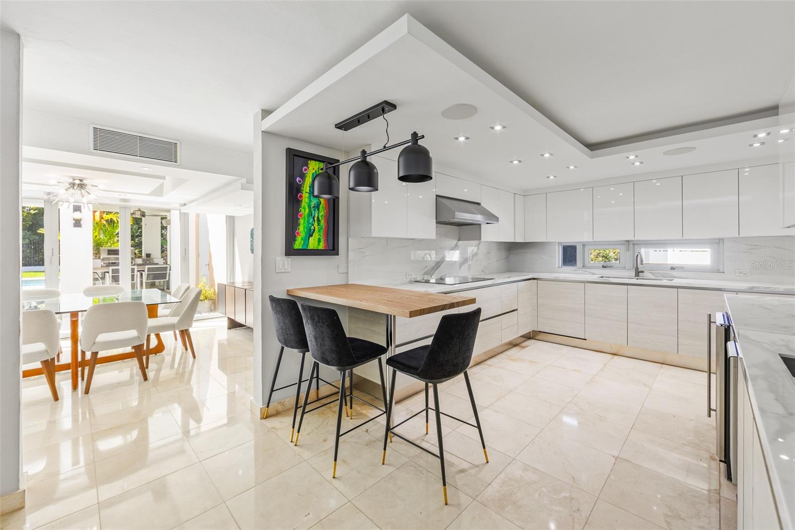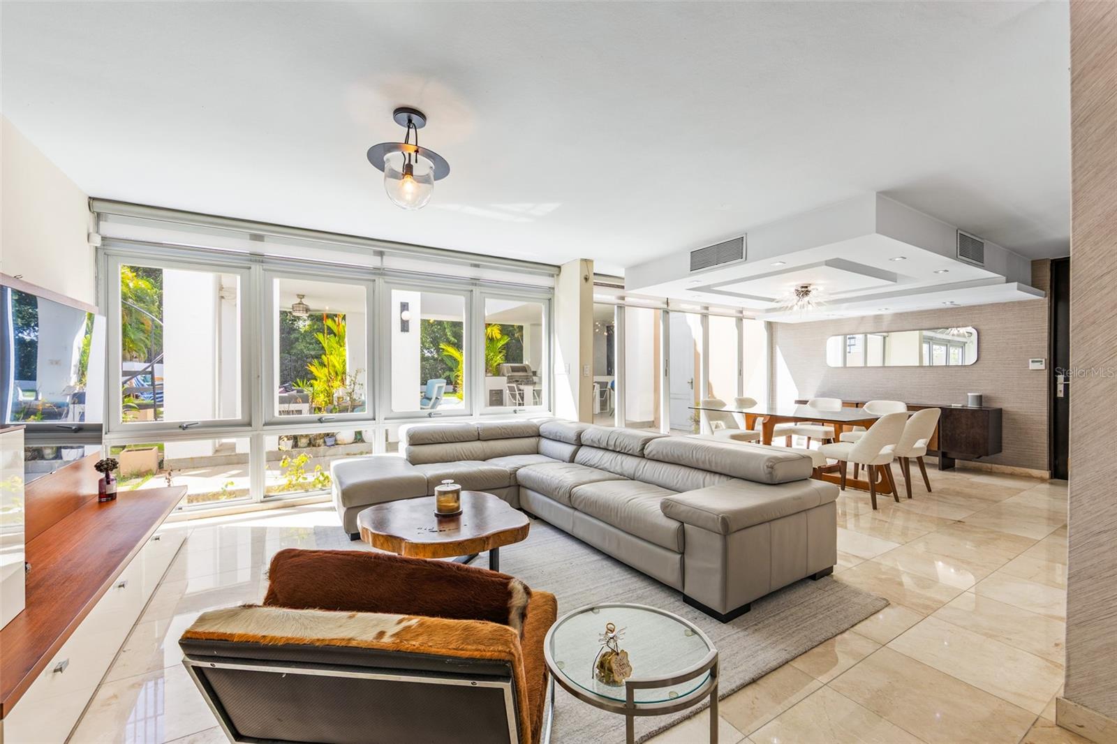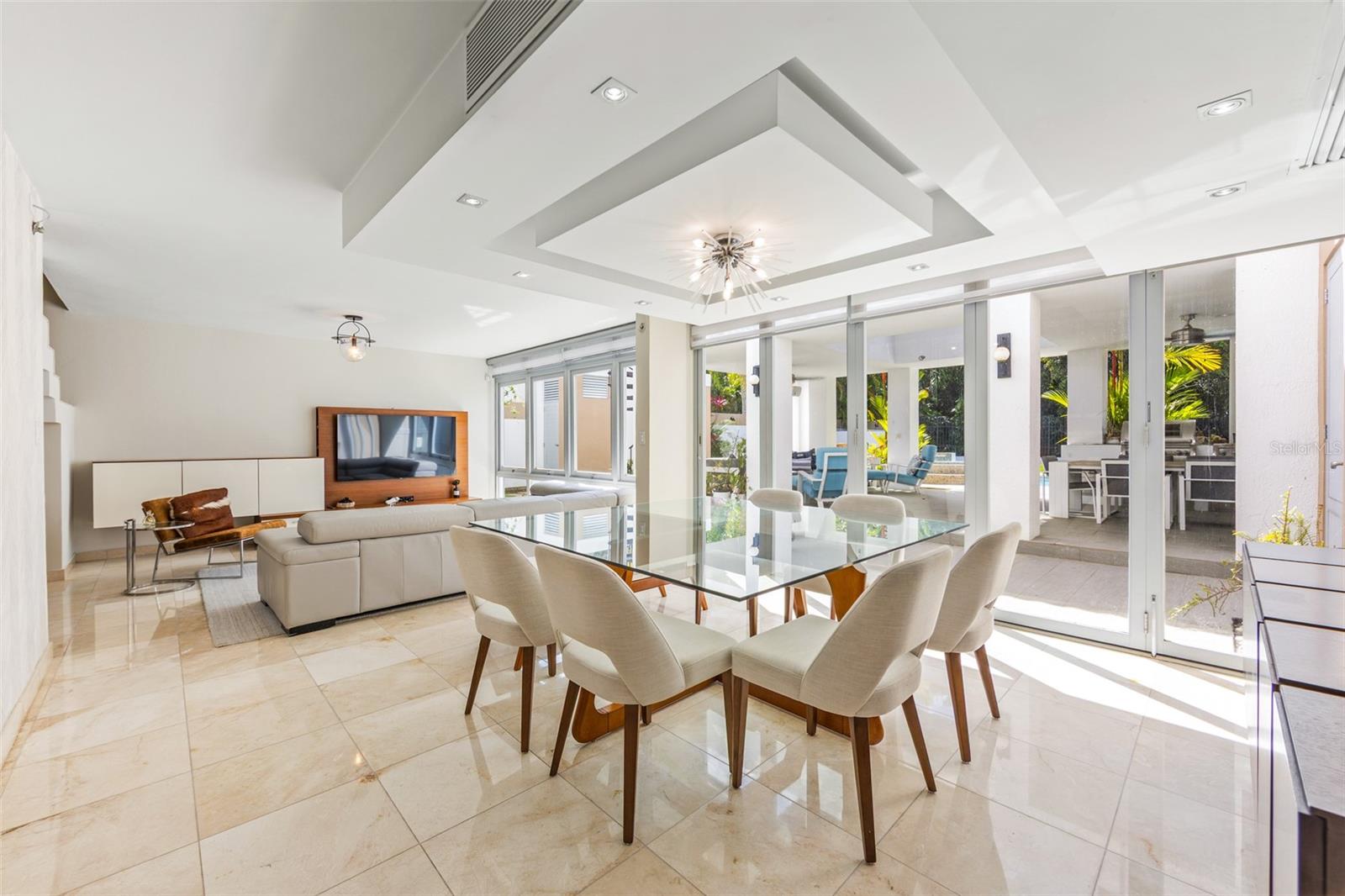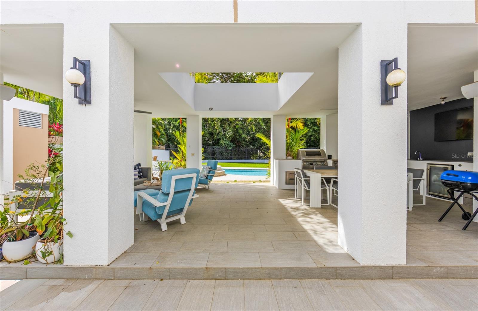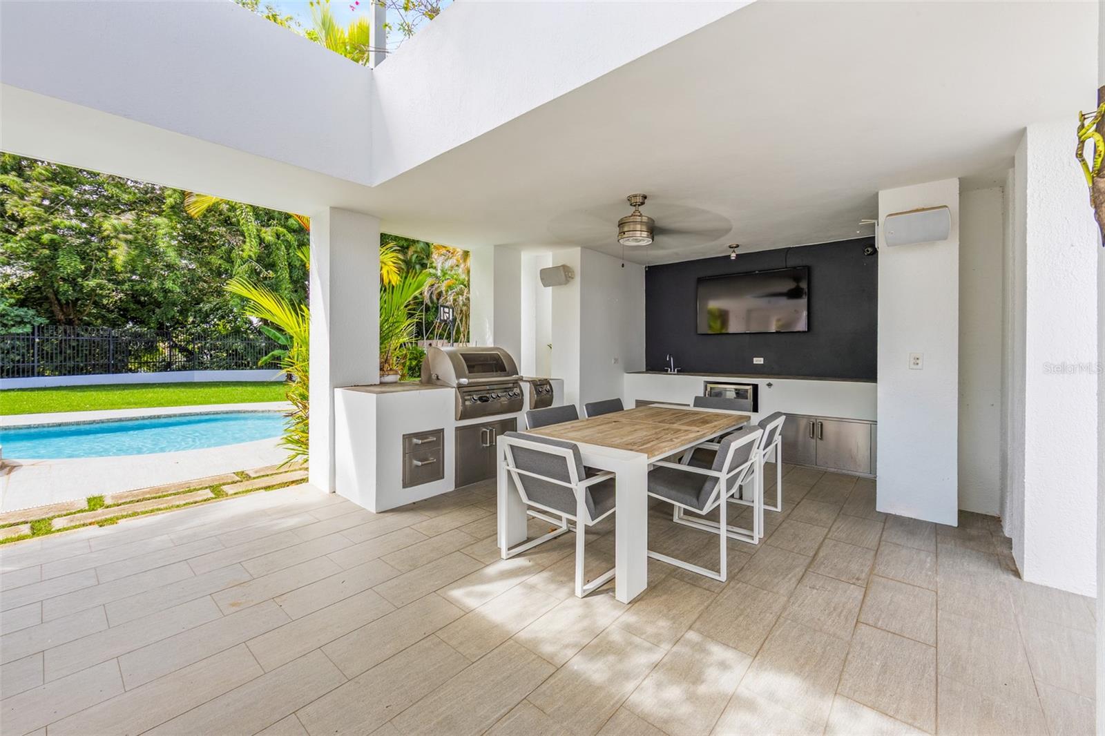 Luxury corner residence in El Mirador, San Juan. Fully remodeled and expanded with modern design and excellent spaces for entertaining. 3,714 sq ft of construction on a 1,100 sq meter lot. Features a swimming pool with jacuzzi and private backyard, outdoor entertainment area with kitchen and BBQ, plus a second-floor terrace overlooking the patio. Private home theater with seating and sound system. Remodeled kitchen (2022) with Bosch dishwasher, wine cooler, and porcelain countertops. Climate-controlled wine cellar and marble floors throughout. Offers 4 bedrooms and 5 bathrooms, including a Junior Suite with en-suite bath and walk-in closet, and an expanded primary suite with luxury bathroom and two walk-in closets. Equipped with 20kW generator, 600-gallon water cistern, gym area with office, and electric hurricane shutters.