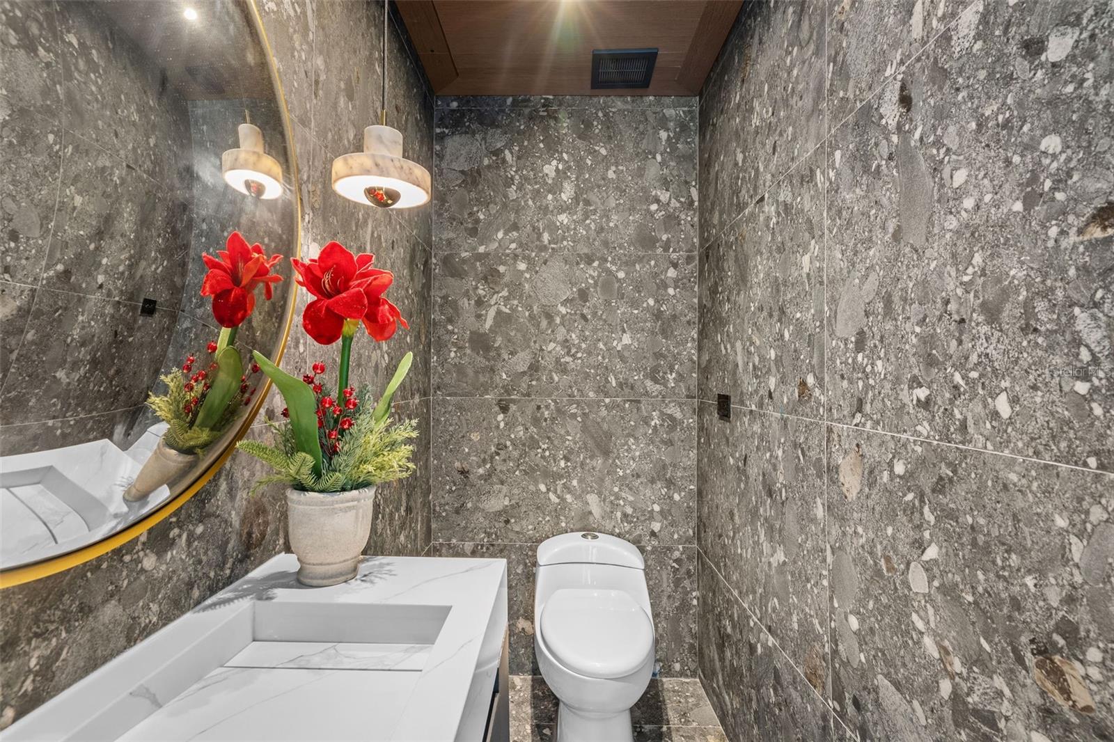 From the moment you arrive, the striking façade and tropical landscaping create a powerful first impression. Inside, a dramatic glass-enclosed foyer with a tranquil indoor garden welcomes you with natural light and a sense of calm that sets the tone for the entire home.