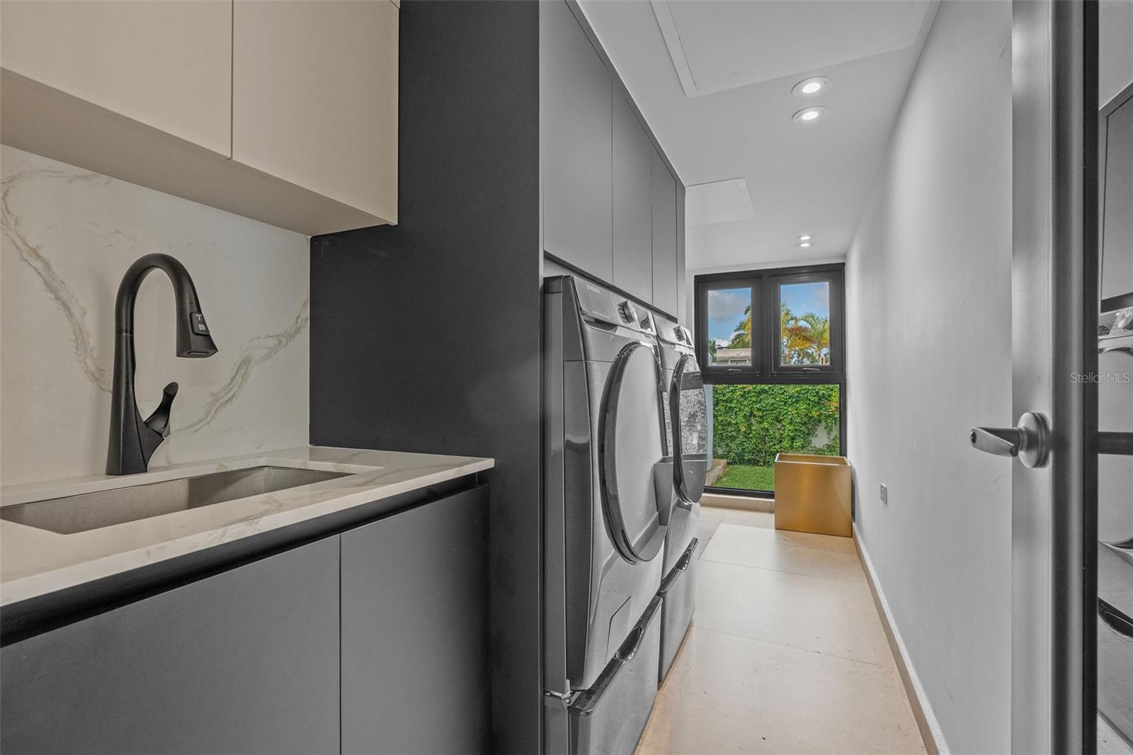 At the heart of the property is a stunning Italian-designed kitchen by Formato, featuring quartz countertops, sleek black cabinetry, and high-end stainless steel appliances. The kitchen seamlessly connects to a stylish wine and bar area with outdoor access—perfect for entertaining and everyday enjoyment.