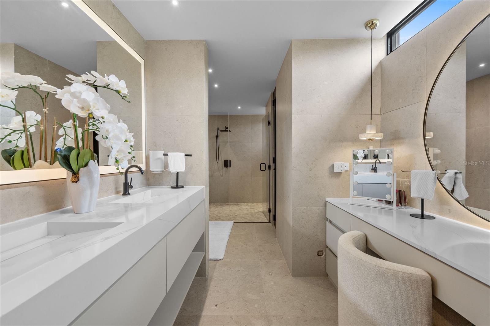The home offers 6 spacious bedrooms, including a versatile downstairs suite with private bathroom ideal for guests, a gym, or home office. Upstairs, the oversized primary suite serves as a private retreat with a spa-inspired bathroom, elegant vanity area, expansive shower, and two custom walk-in closets designed for boutique-style organization.
