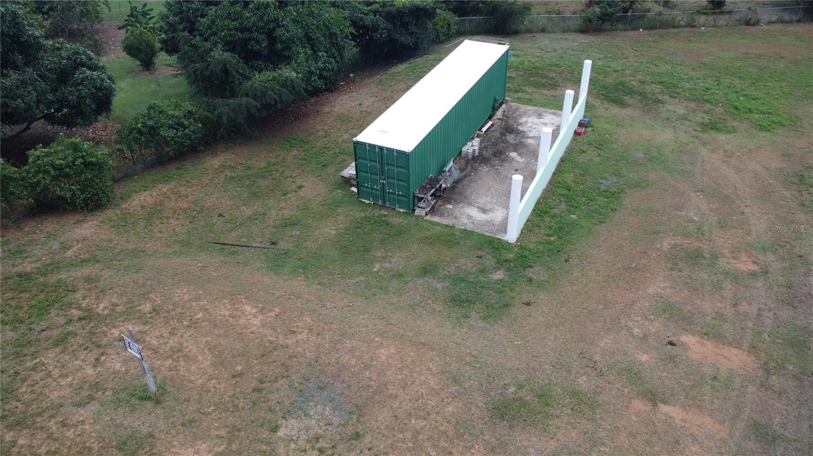 The property features an existing power drop with meter, a water meter already installed, and a septic system in place. A shipping container on site provides secure storage or a flexible starting point for a small living or workspace setup while you build.