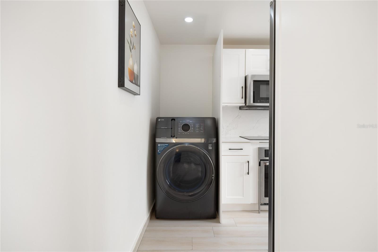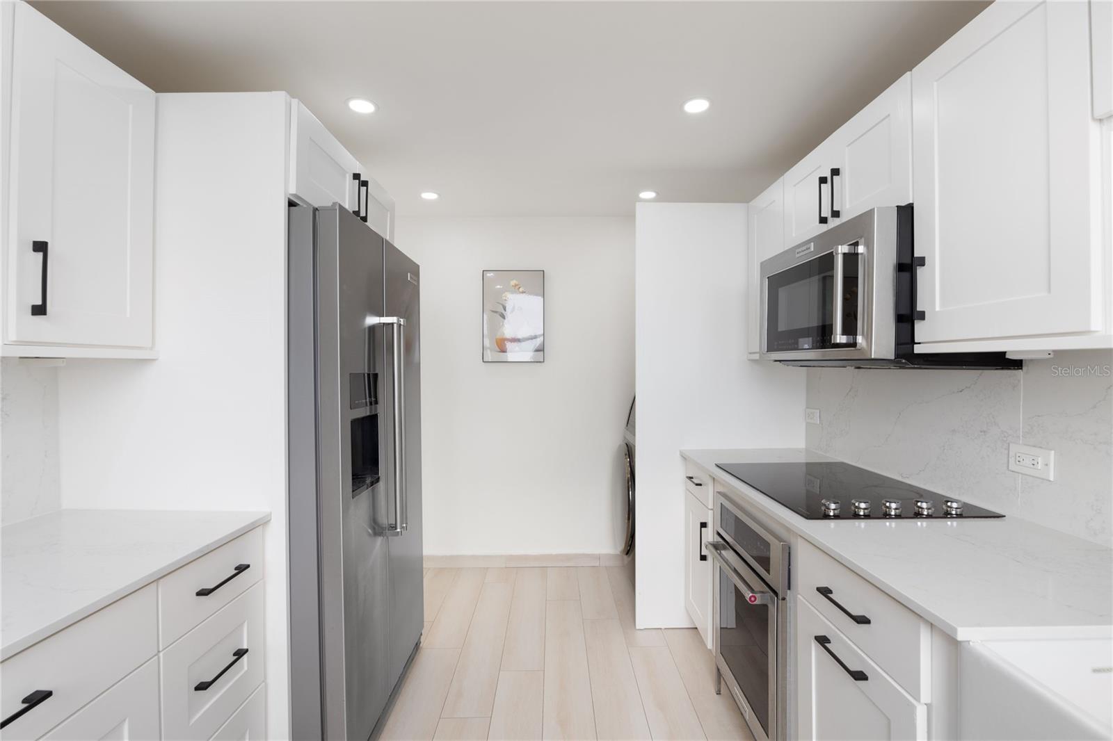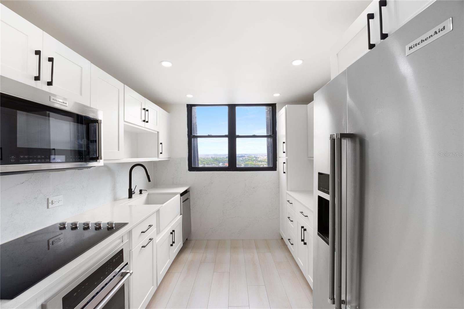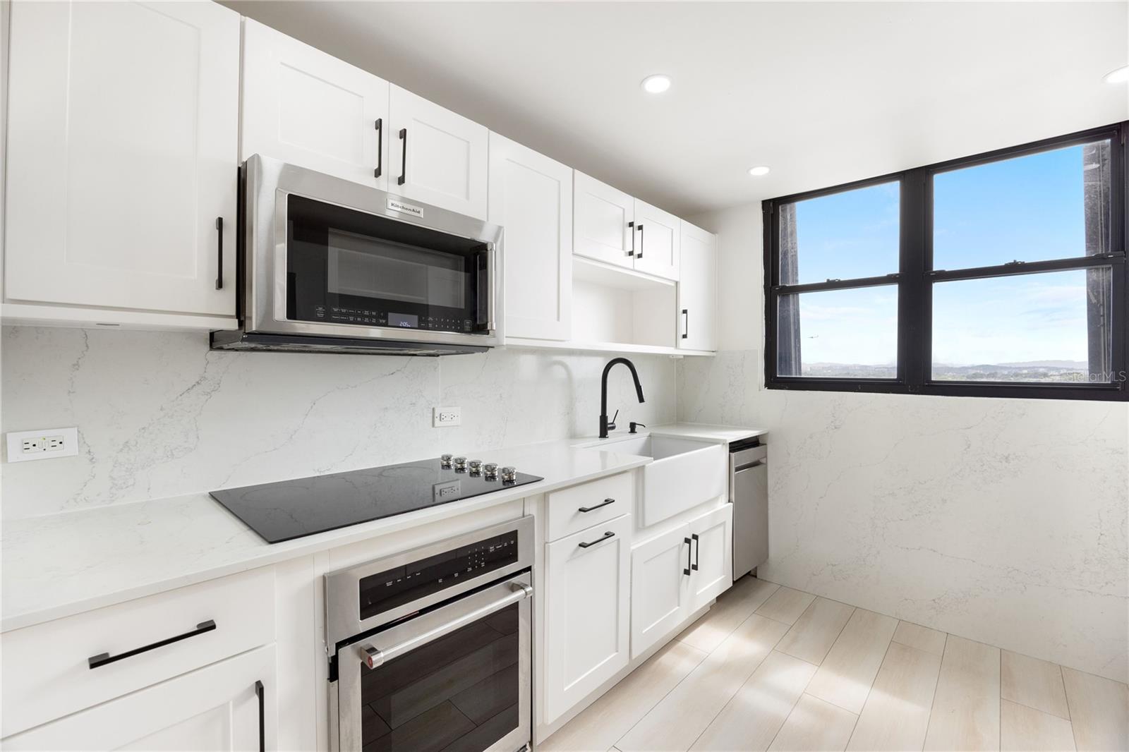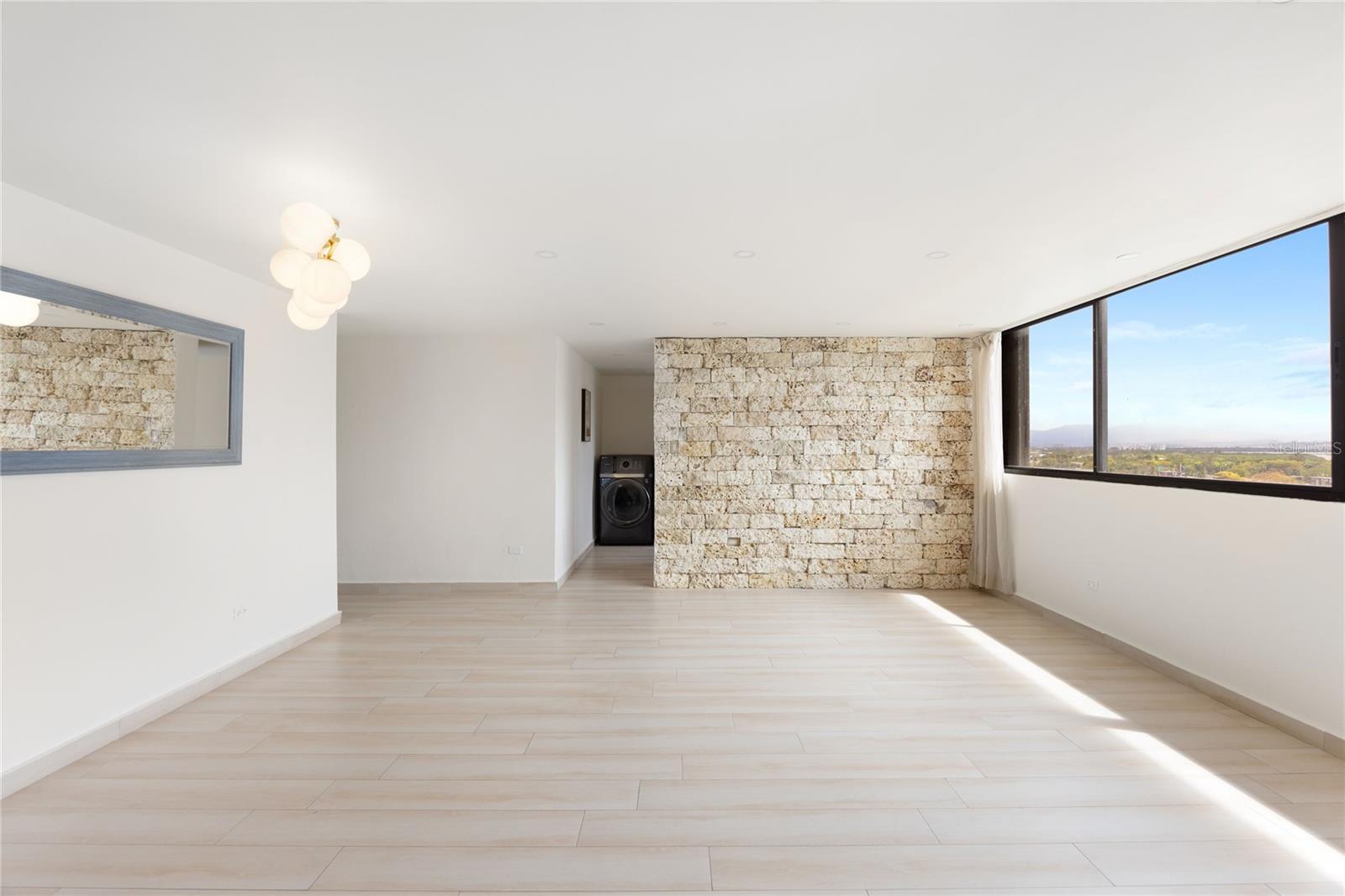 The residence features inviting living and dining spaces that flow seamlessly together, enhanced by soft, warm tones and expansive windows showcasing views of the ocean and Punta Las Marías. The apartment is offered unfurnished, providing a blank canvas to create your ideal home. The kitchen is thoughtfully equipped with KitchenAid appliances, including a refrigerator, microwave, and oven, along with a GE in-unit washer for added convenience.