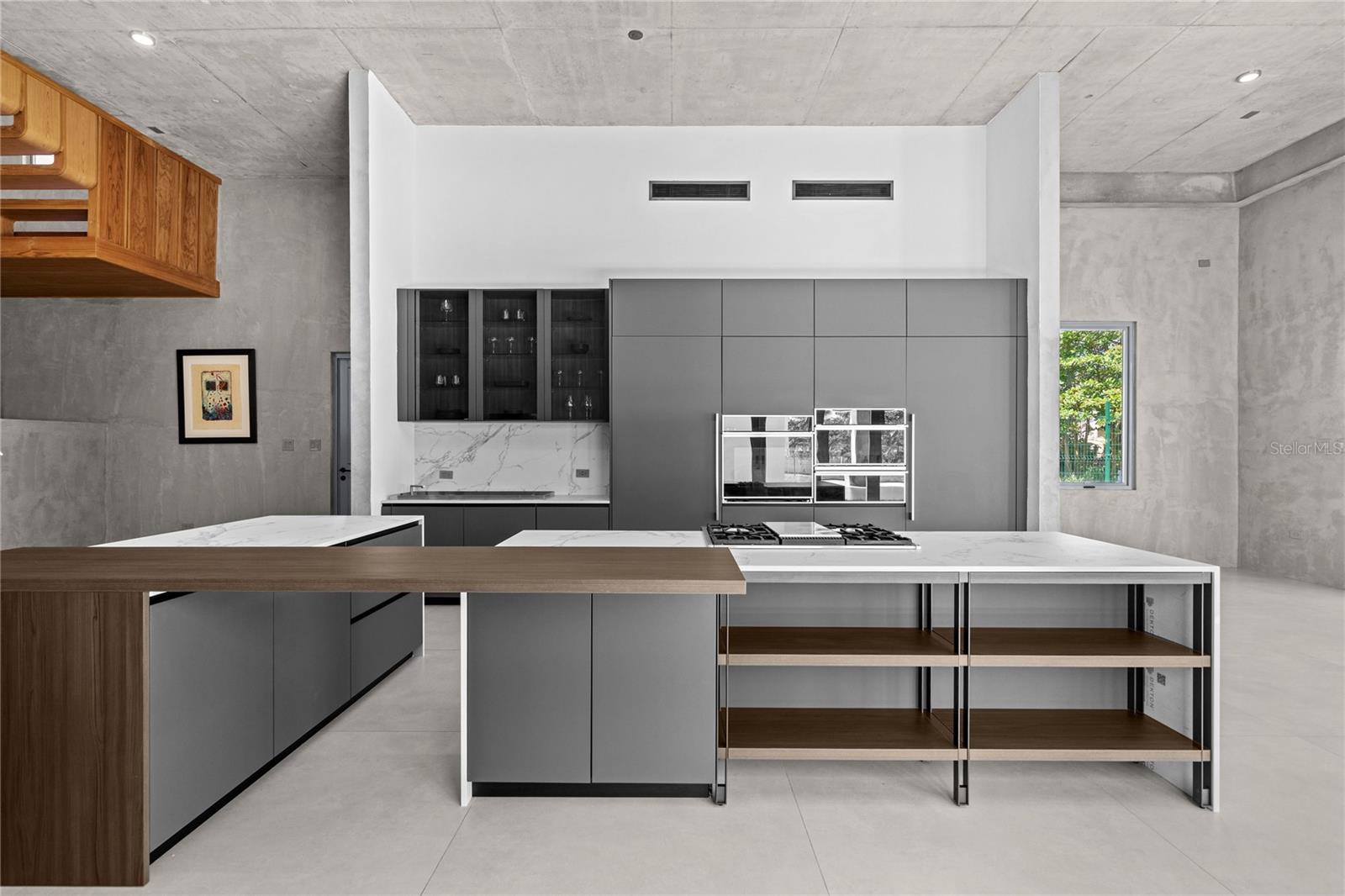 Inside, double-height volumes wrapped in glass invite shifting light to animate raw concrete surfaces throughout the day. A sculptural natural wood staircase rises as a focal counterpoint, softening the structure’s material rigor. The kitchen, conceived as an integrated architectural element rather than a decorative feature, pairs paneled appliances with porcelain slab countertops in a subdued palette that complements the home’s geometry.