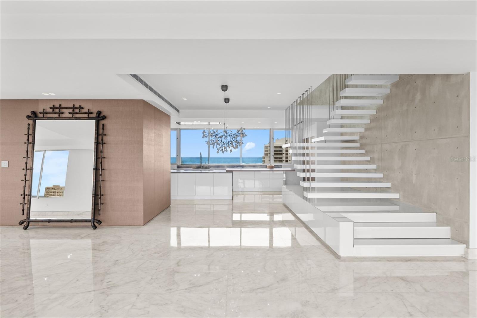 At the center of the residence, a bespoke Copatlife kitchen—appointed with Miele, Wolf, and Sub-Zero appliances—anchors the living spaces with quiet sophistication and architectural presence. Floor-to-ceiling openings frame sweeping ocean and city vistas, while natural light moves effortlessly across the interiors. Automated window treatments and a fully integrated lighting system allow for precise control of ambiance throughout the day and evening.