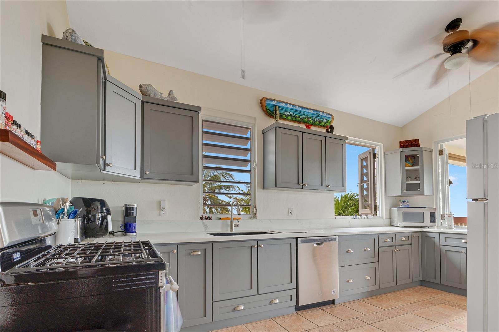 The kitchens are designed with French-style windows that invite a constant ocean breeze, complemented by high ceilings throughout that enhance airflow and natural light. The property also includes an electric vehicle gate entrance, adding security and ease of access.