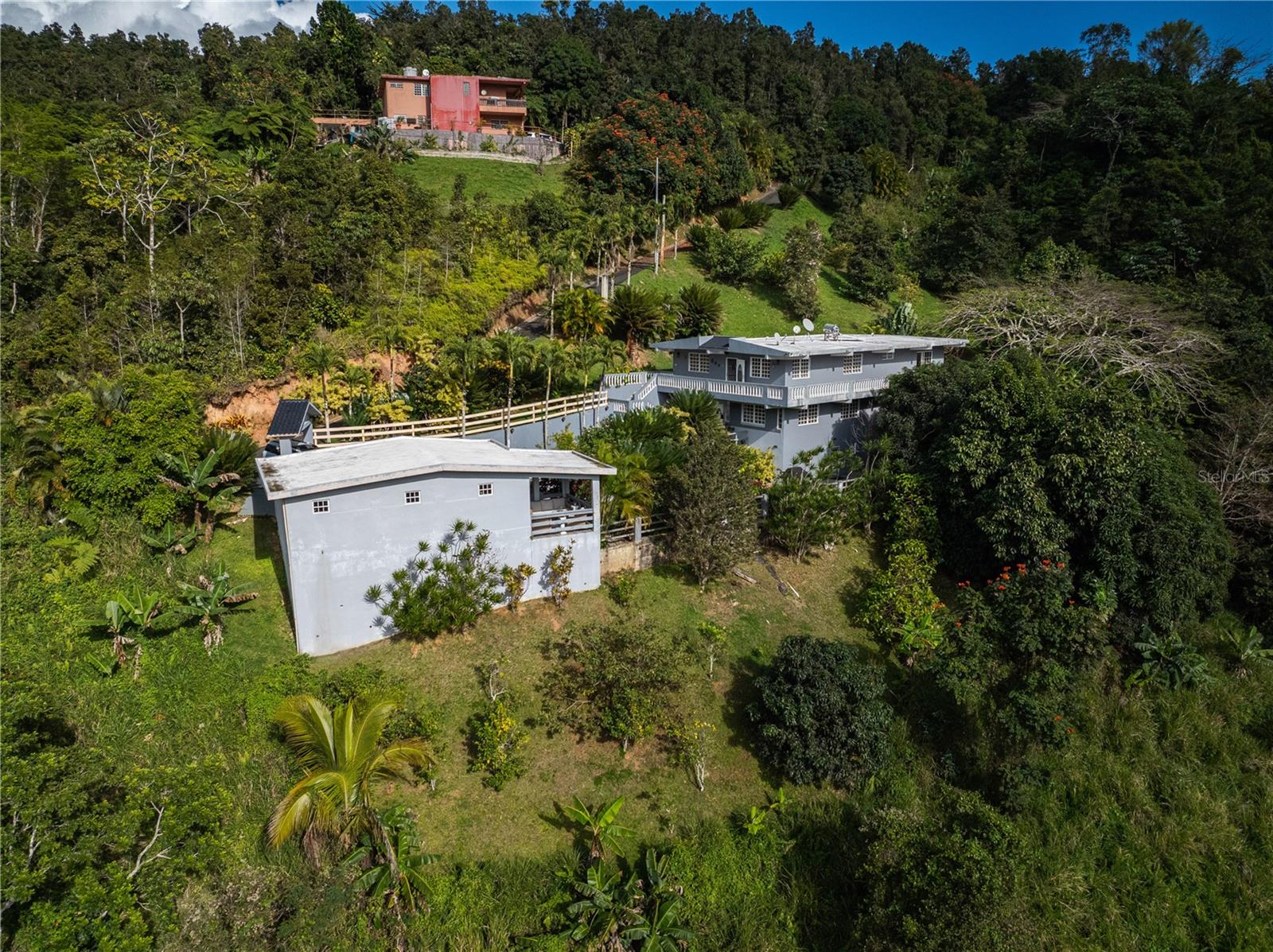 Located on the edge of the Bosque de Pinos in Cayey, this multi-unit property offers a private retreat with scenic valley views. The top-floor residence features a 3-bedroom, 2-bathroom layout with a wrap-around balcony, totaling 1,880 square feet of space. This unit includes a primary bedroom with an ensuite bathroom and jacuzzi tub, tiled floors, louvered windows, and a versatile hallway study. The middle-floor unit, accessible at ground level from the carport, features 2 bedrooms and 1 bathroom with a newly renovated kitchen. This property presents a significant opportunity for multi-generational living or a versatile income-generating investment; the layout allows for living in one unit while renting the other, or utilizing the entire property as a high-capacity rental. Featuring a two-bay concrete garage with a workspace, gated entry, and established landscaping that blends into the adjacent forest, this home provides a flexible and private living arrangement.