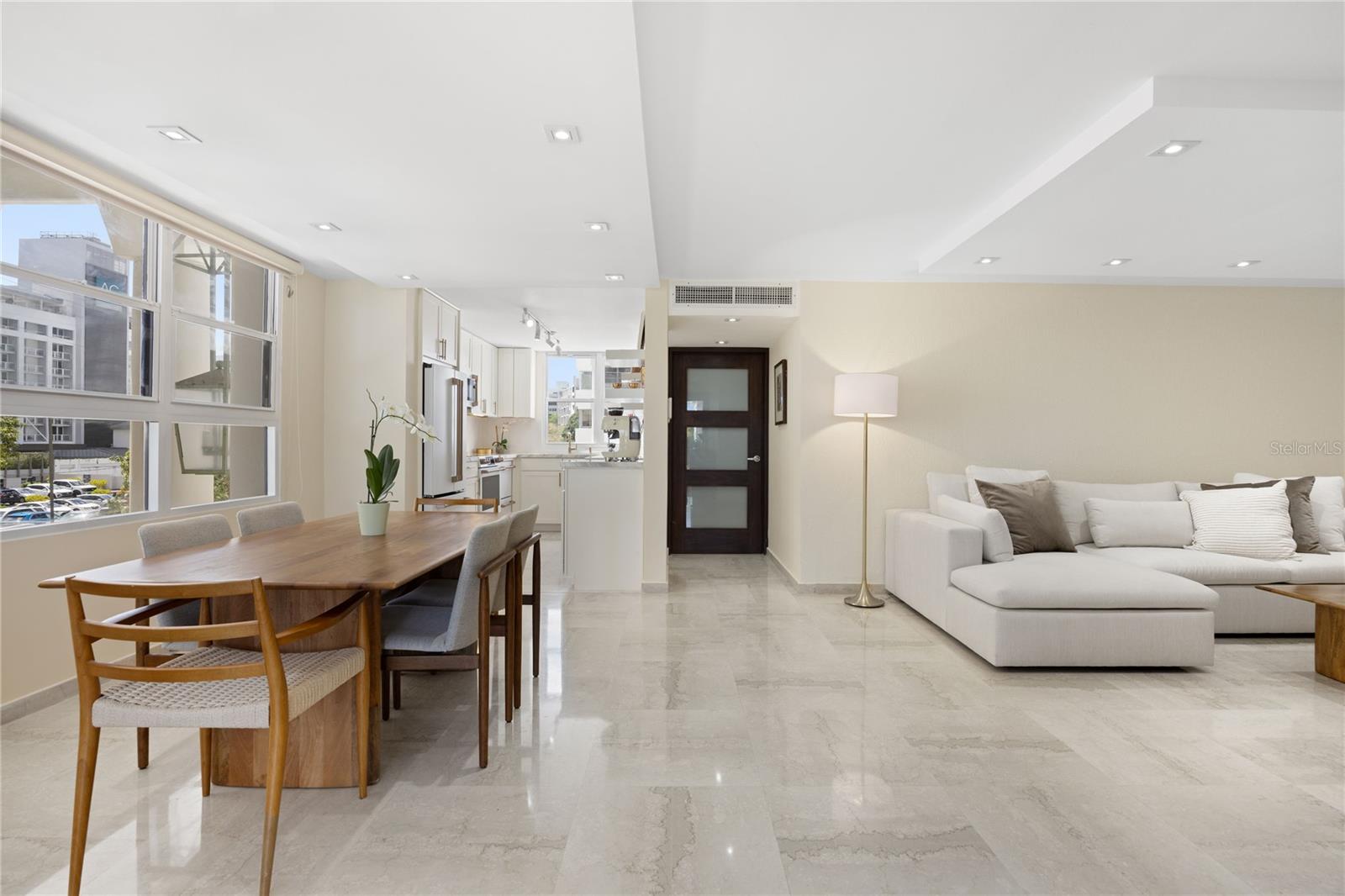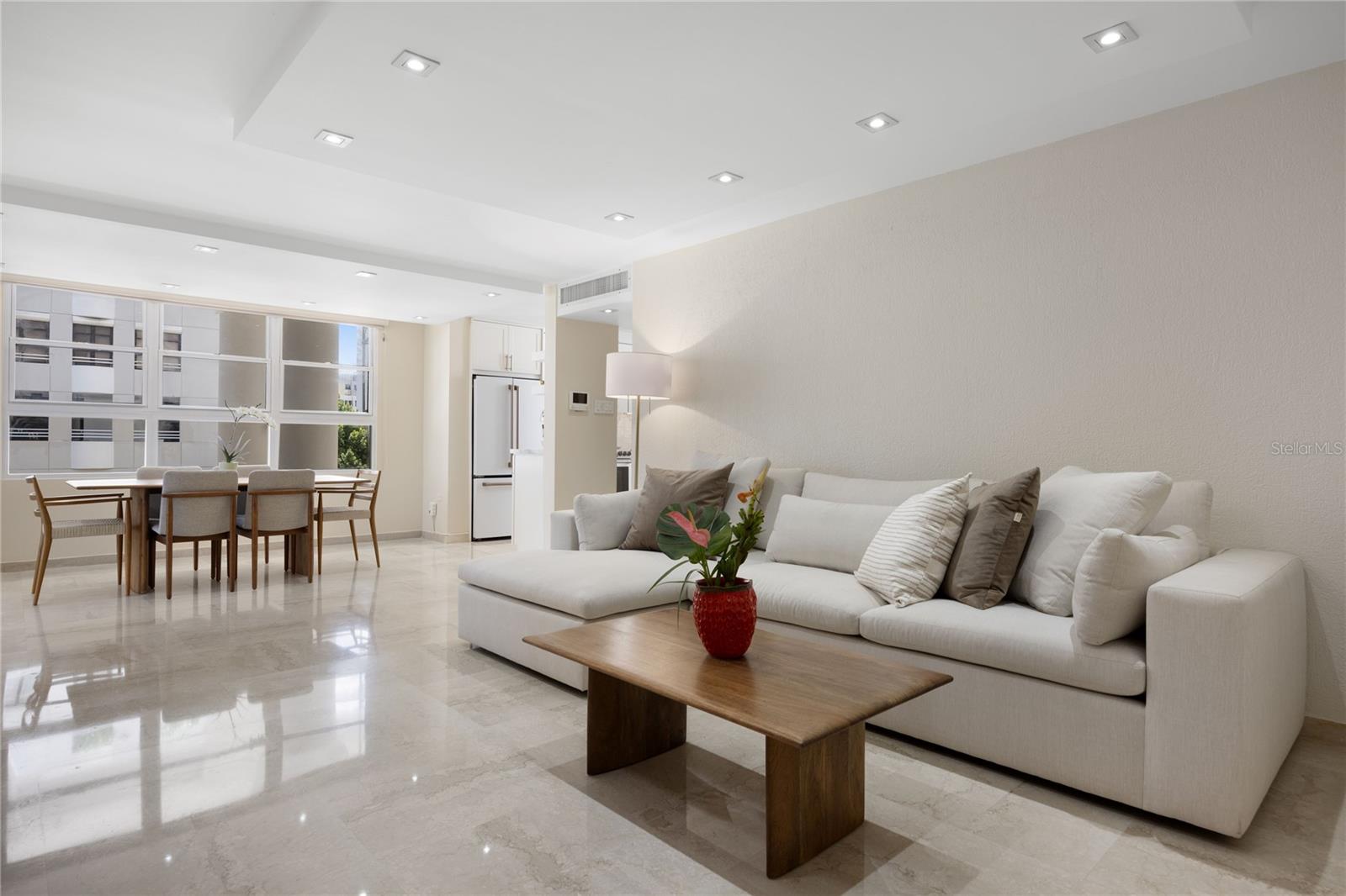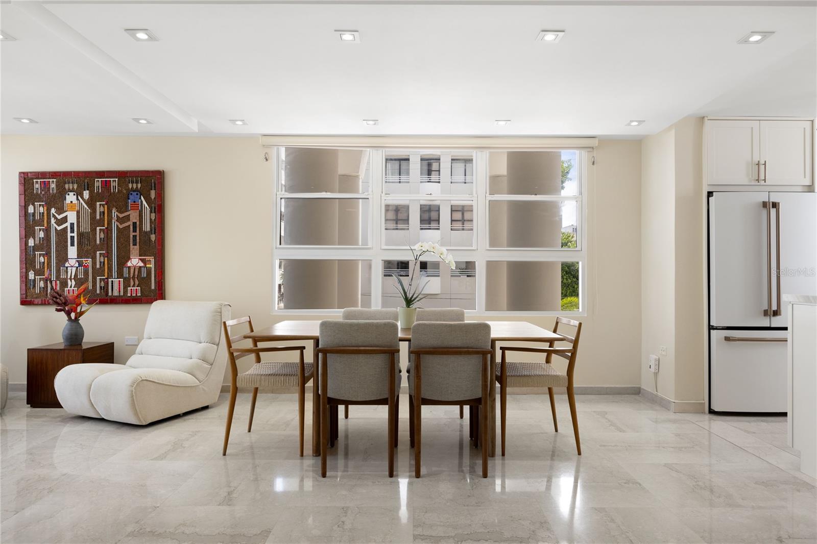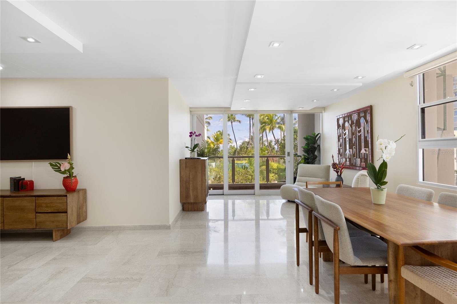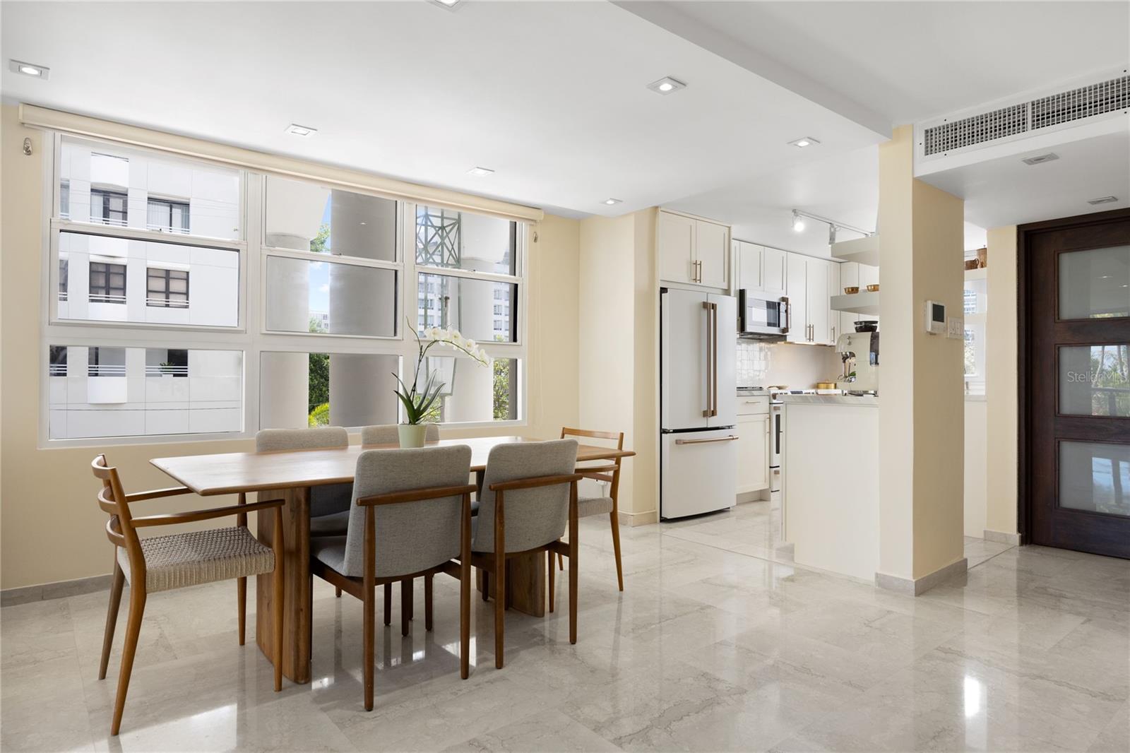 The main living area has been outfitted with a brand-new sectional sofa and high-tech frame TV. Set along a wall of windows, the dining area is thoughtfully located at the center of the home. A secondary sitting area features brand new lounge chairs and a distinctive bar cabinet, making this the ideal spot for morning coffee or evening drinks. Brand-new, white windows and doors have been installed across the entire living and dining area. Sliding doors stack together on either side to reveal a charming balcony with front-row views of the impeccably maintained condominium grounds, partial views of the Atlantic Ocean, and a lively palette of green and blue hues. LED recessed lighting and polished marble floors exude elegance throughout the home.
